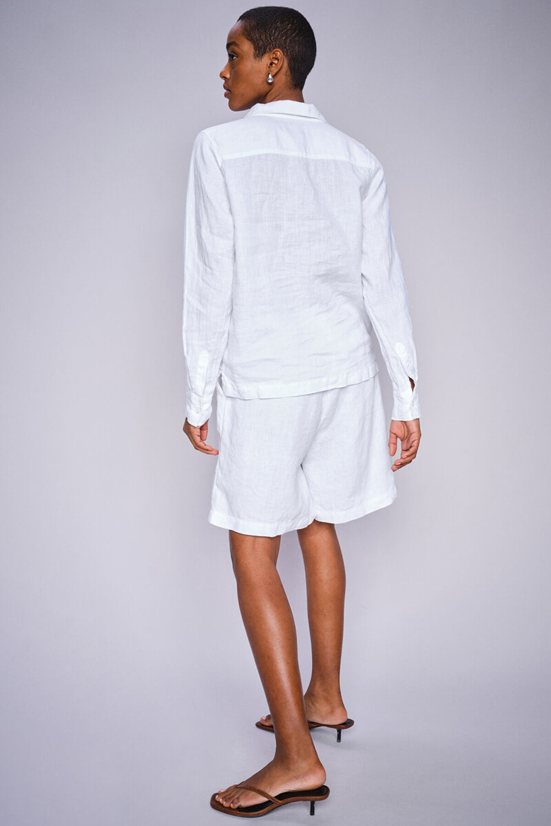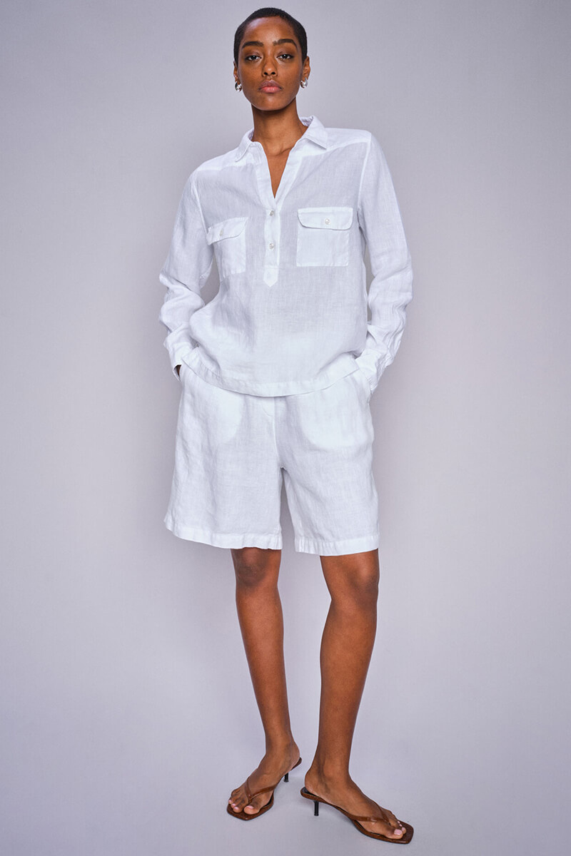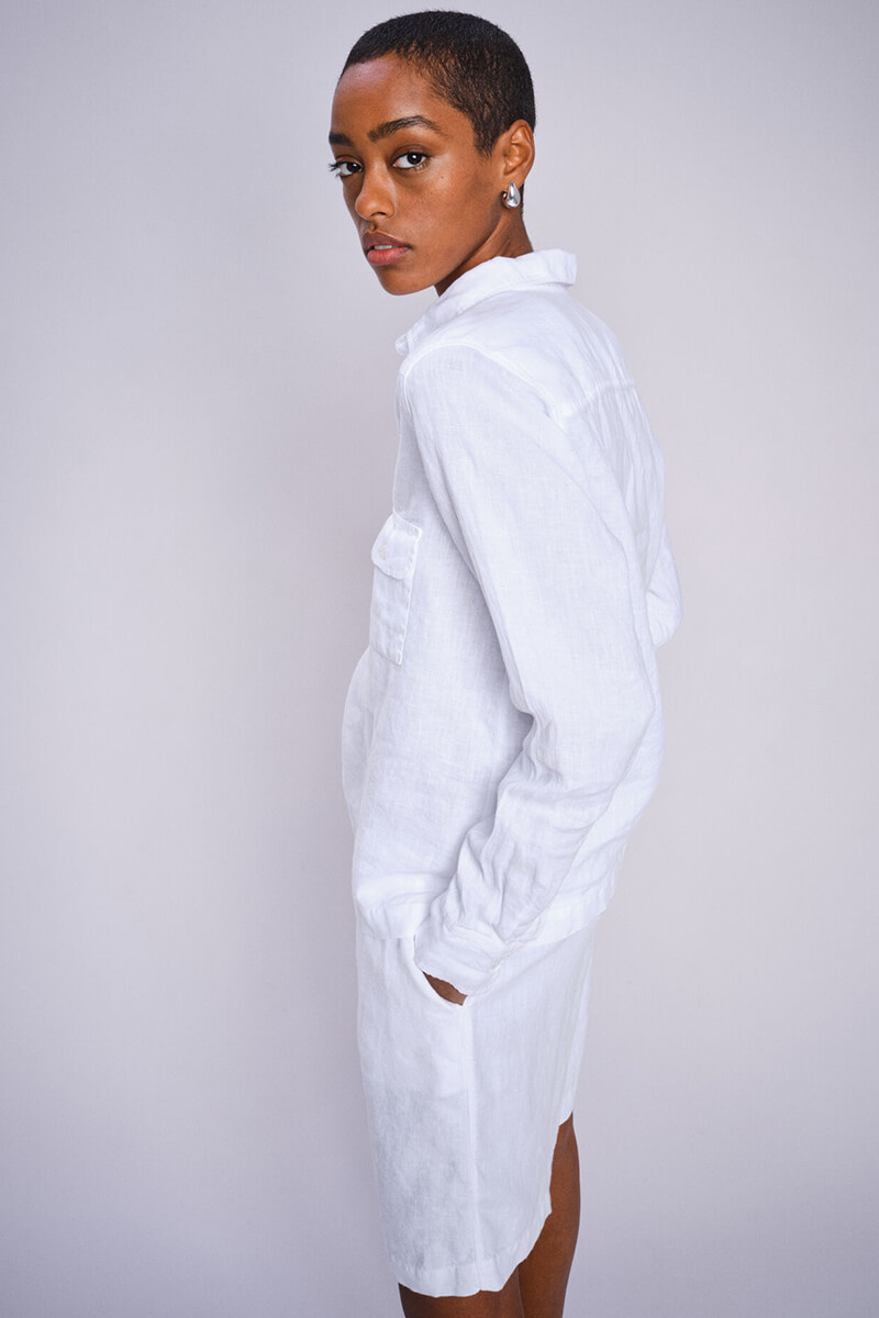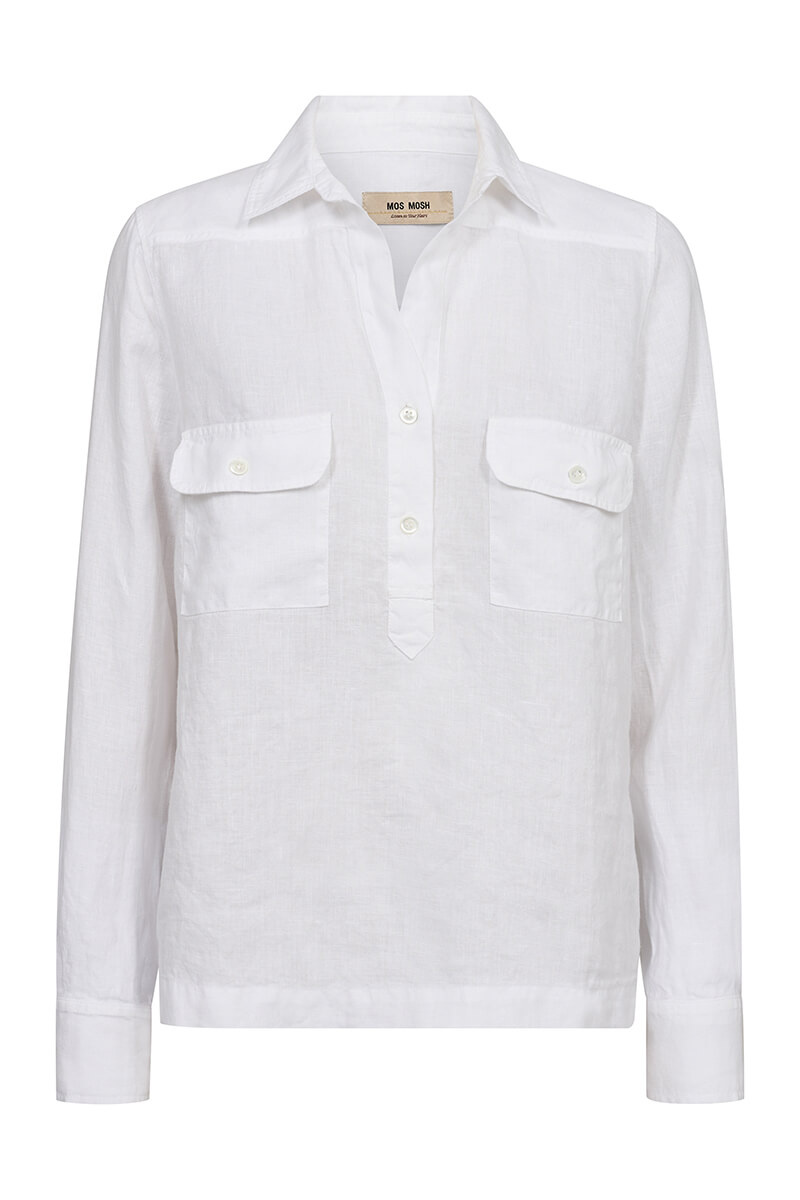 The linen shirt that breathes summer. Perfect depth in the neckline, relaxed fit and pockets that make it extra nonchalant. Wear it tucked in, open or just as it is – for early mornings and long evenings. A cool classic to live in.Shirt in linen with chestpockets, relaxed fit, collar and v-neckline with buttons from MosMosh.