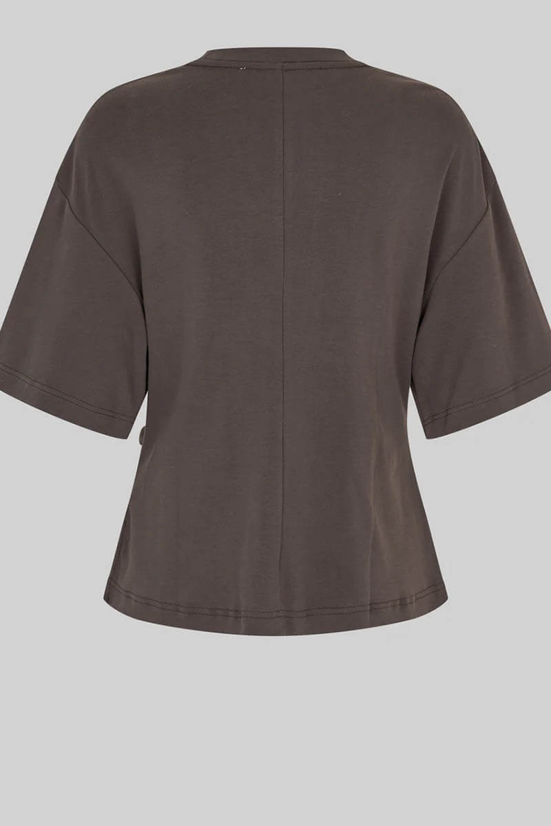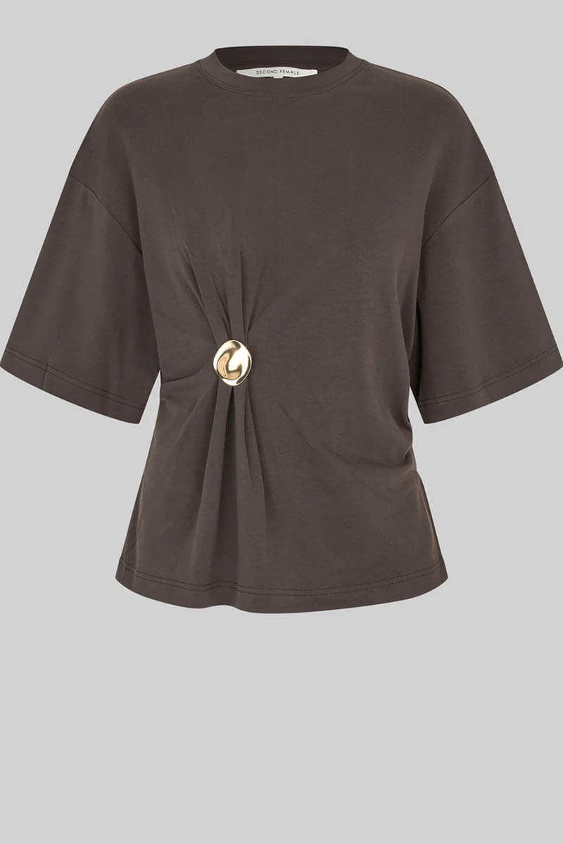T-shirt featuring a round neck, dropped shoulders, and a flattering gathered detail at one side. Adorned with a detachable gold-toned brooch for a tailored touch.
