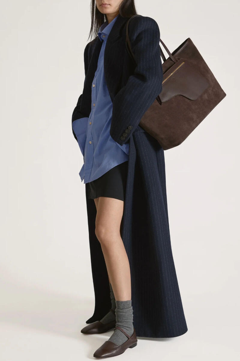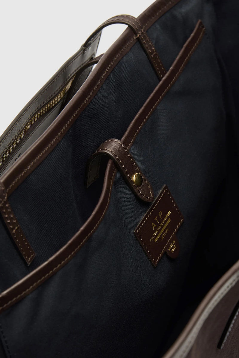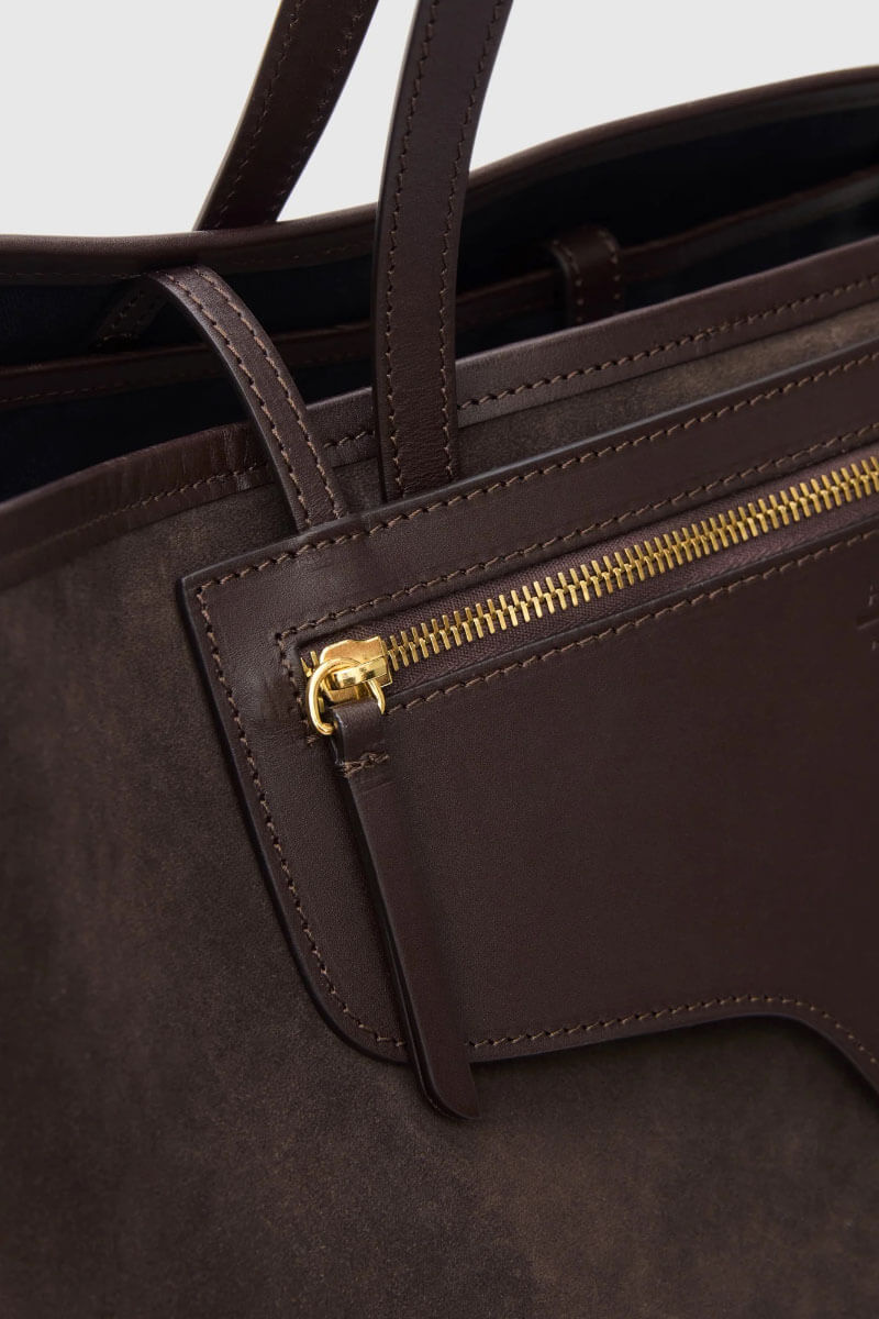 A spacious tote in dark suede and leather with thoughtful details for both everyday and work. The rich brown tone makes it easy to style with neutral tones, wool coats and tailored garments. Subtle luxury at its best.Tuscan suede tote bag with double handles, an inner pocket with buckle and an inner pocket that can also be used as a pocket on the outside from ATP Atelier.