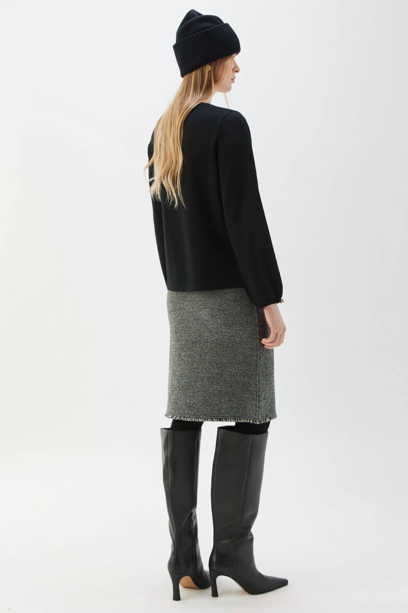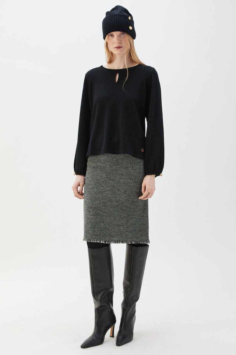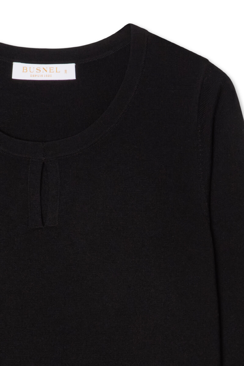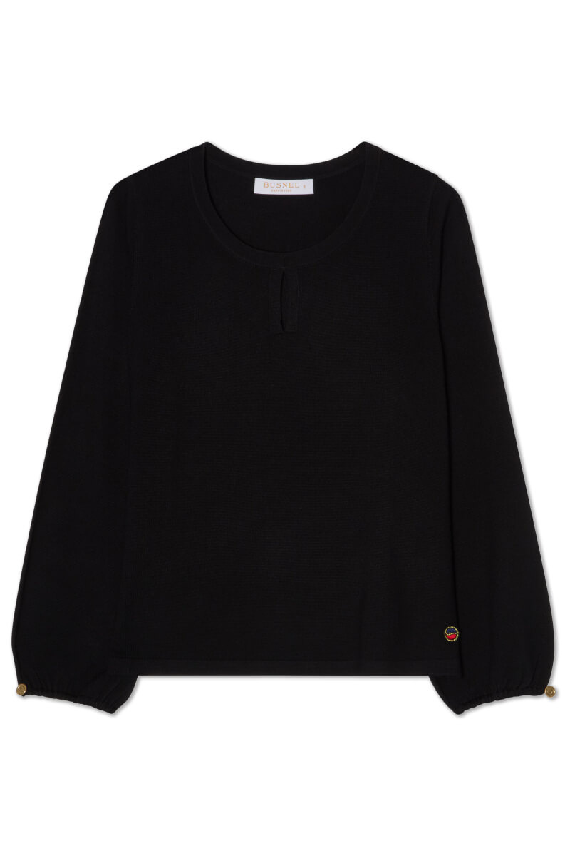 A knitted blouse in black merino wool with balloon sleeves and a relaxed fit is a wardrobe staple. Style with a silk skirt and slim heels for sophisticated balance, or with tailored trousers for a chic contrast.Knitted blouse in soft merino wool with relaxed fit, balloon sleeves, small keyhole front and round high neckline from Busnel.