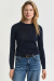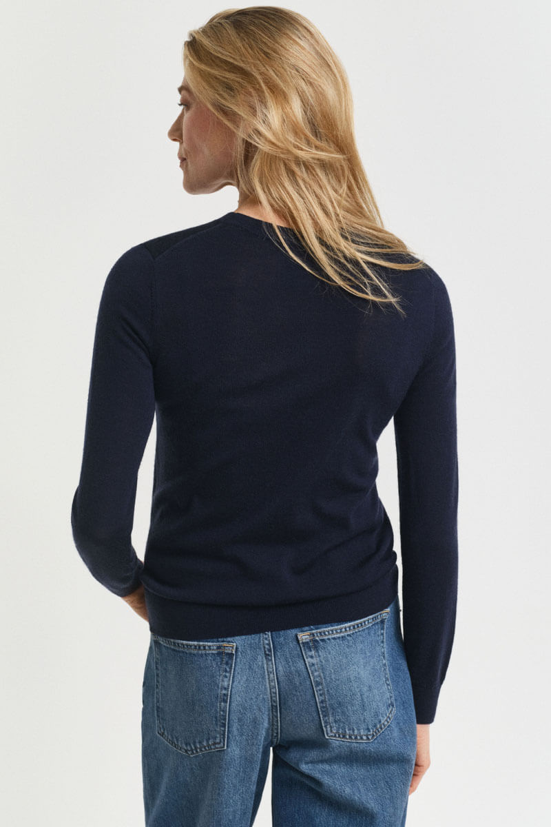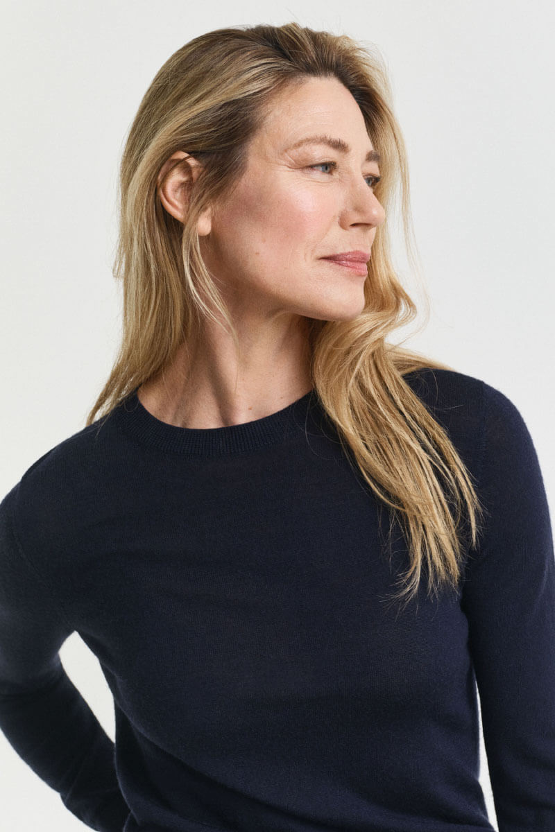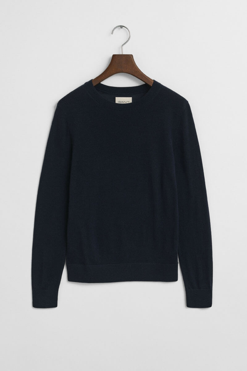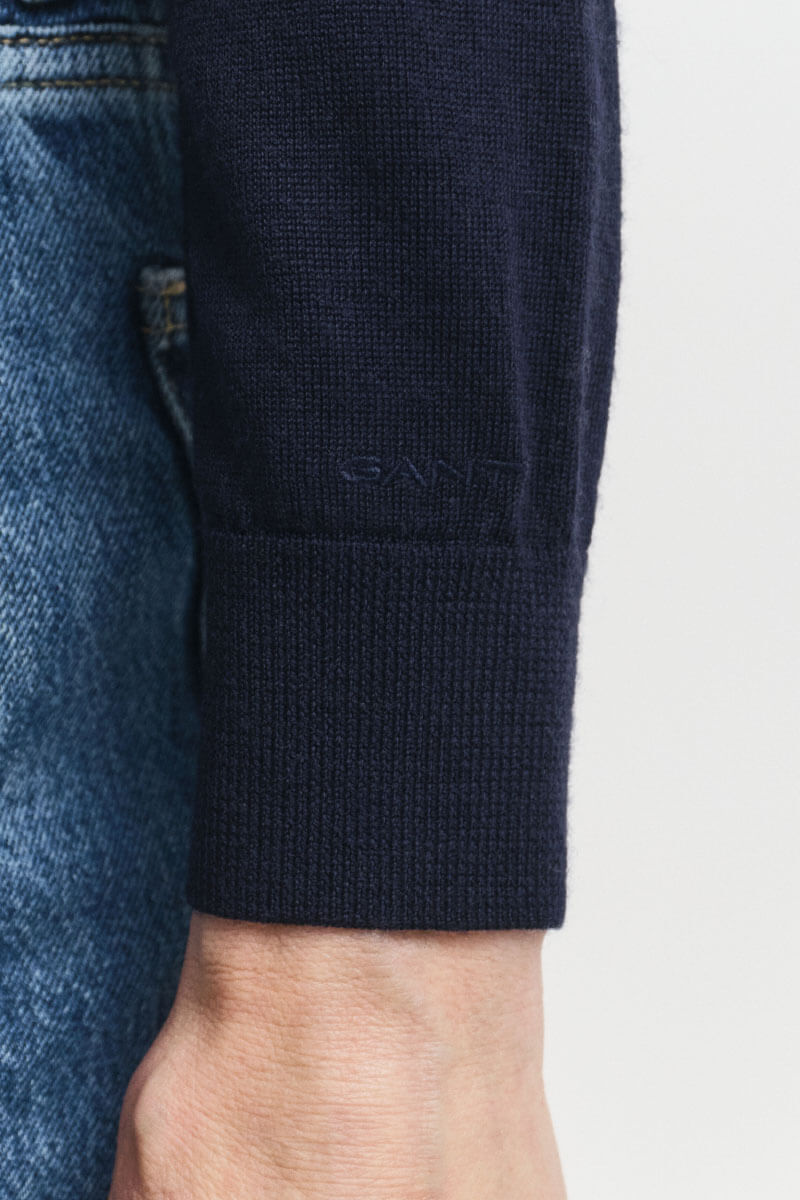 A slim-fit, dark blue knit sweater with a round neckline is the key to an elegant yet casual look. Style it with suit trousers for modern minimalism or pair it with a voluminous skirt for a playful contrast – always confidently simple.Knitted sweater in soft merino wool with slim fit, round neckline, ribbknitted edges and embroidered logo at the end of sleeve from Gant.