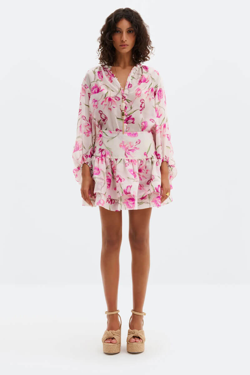 A voluminous mini skirt that adds a playful yet elegant touch to your summer wardrobe. The flowing ruffles create beautiful movement and a feminine shape that is easy to dress up or down. Wear it with the matching blouse for a standout look at any summer event.
