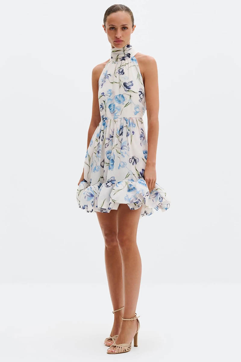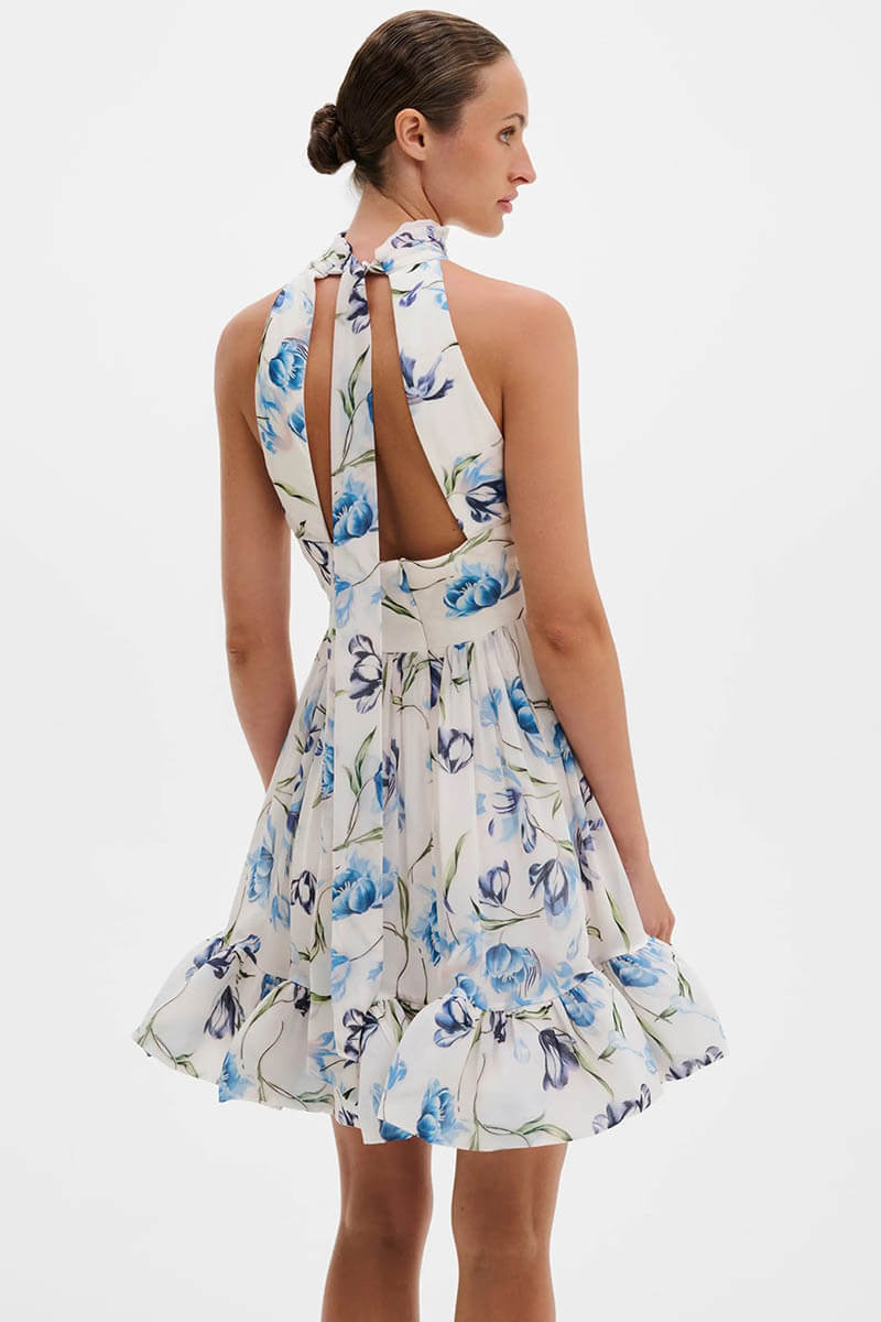 A playful and feminine mini dress made for summer celebrations. The romantic floral print in blue tones is combined with a flattering halterneck and a ruffled hem, giving the dress beautiful movement and a modern, chic silhouette.