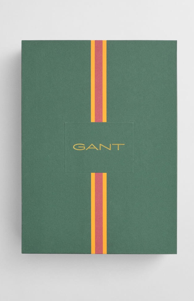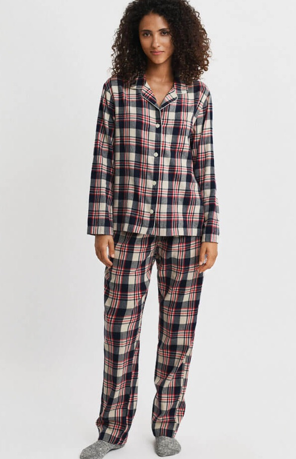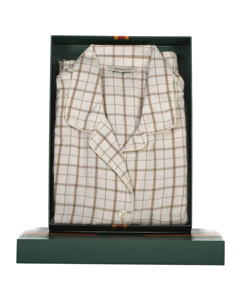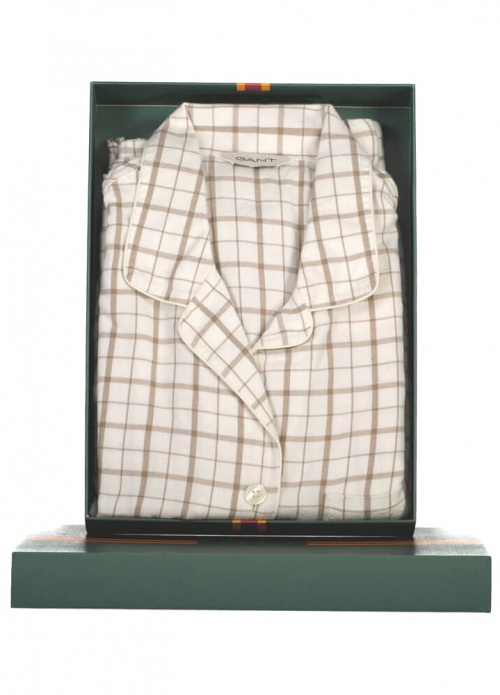 The pajama set is made from washed cotton, giving it a soft and luxurious feel. The set includes a long-sleeved button-up shirt and a pair of pants. The pants feature side pockets and a drawstring waist, while the shirt has a regular fit, a chest pocket with an embroidered Gant logo, and contrasting piping along the collar. Both pieces come in a checked flannel fabric.