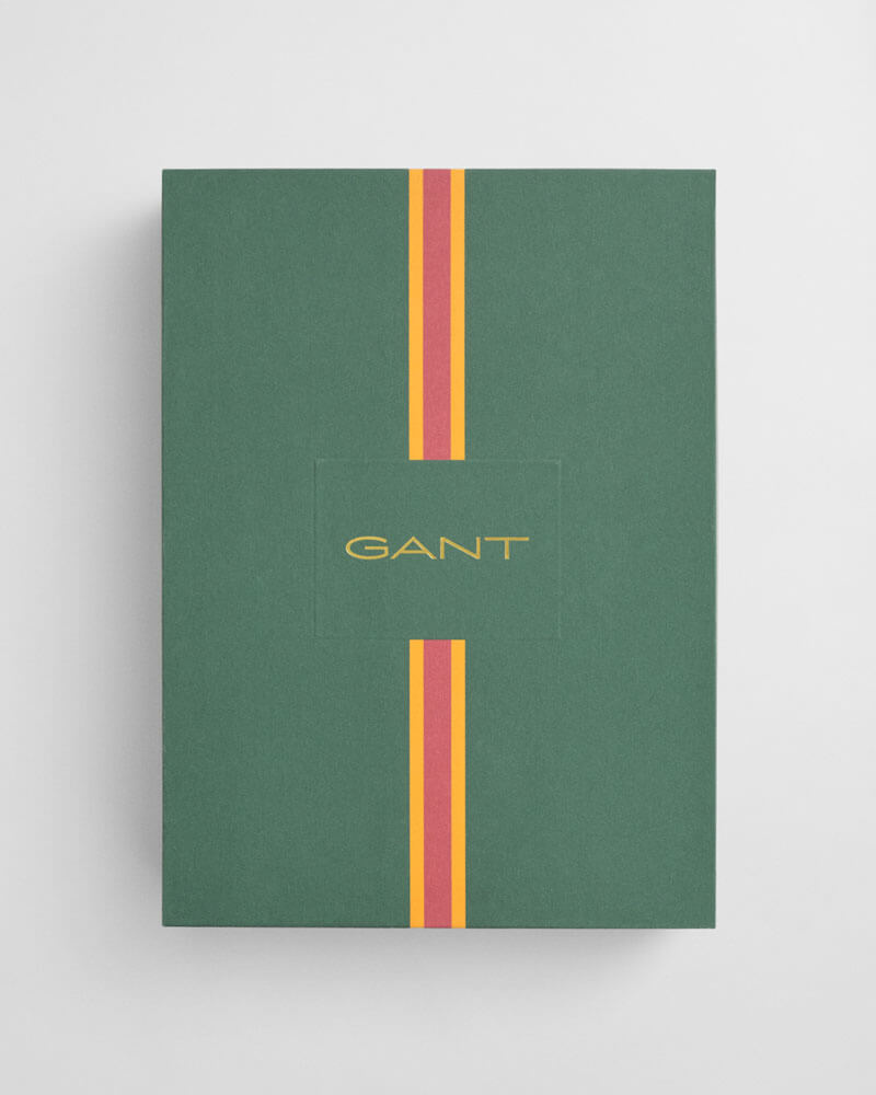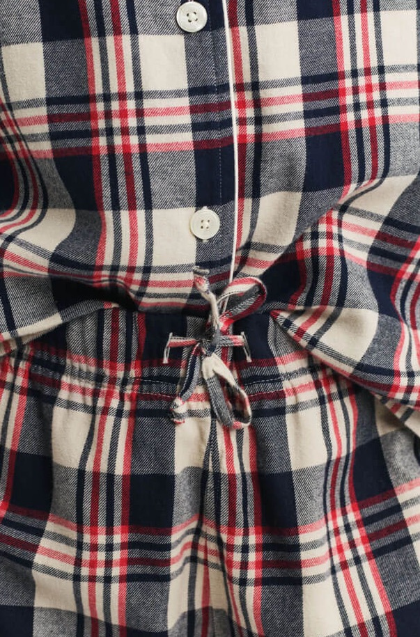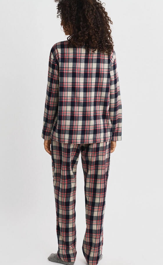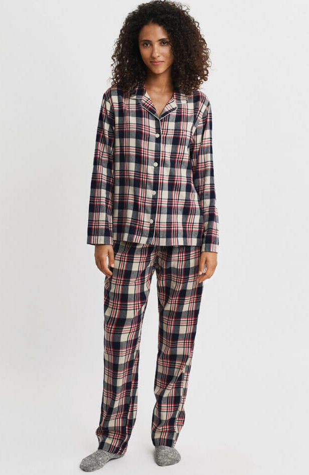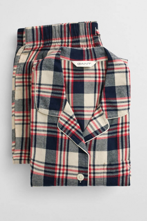 The pajama set is made from washed cotton, giving it a soft and luxurious feel. The set includes a long-sleeved button-up shirt and a pair of pants. The pants feature side pockets and a drawstring waist, while the shirt has a regular fit, a chest pocket with an embroidered Gant logo, and contrasting piping along the collar. Both pieces come in a checked flannel fabric.