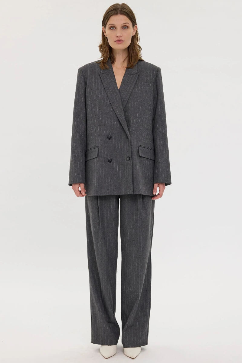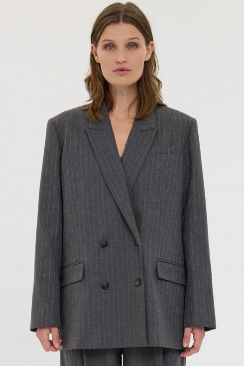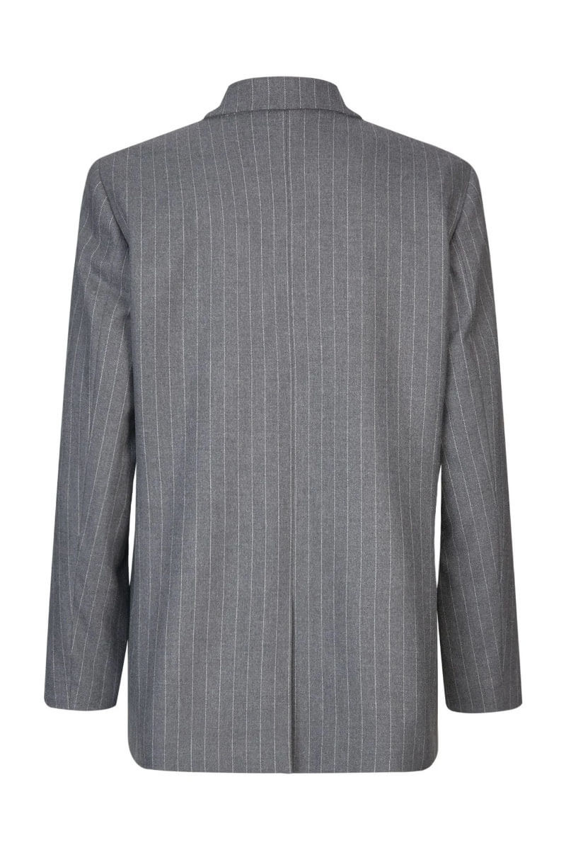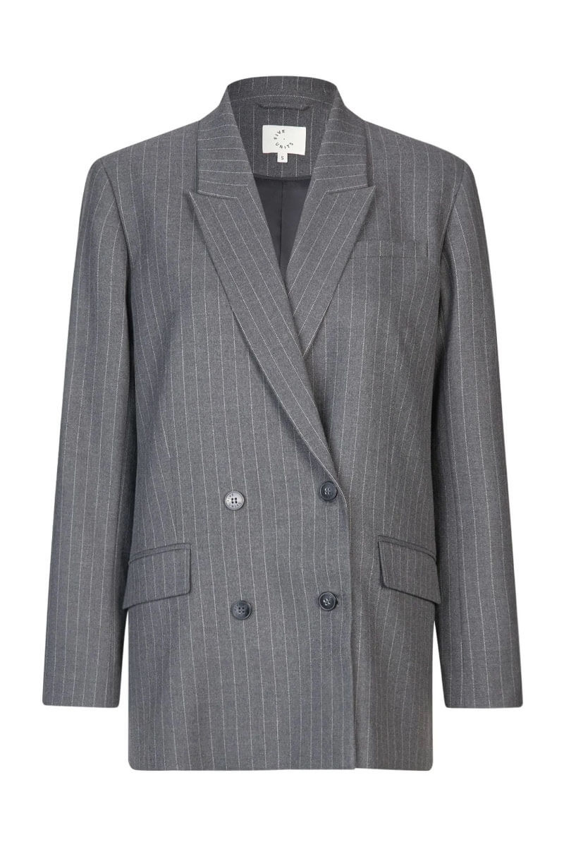 The dark grey shade sets the tone, while the tailored fit balances precision and relaxation. Pair with suit trousers for a complete look – or denim for contrast.Striped double-breasted blazer in a recycled blend with a loose fit, lightly padded shoulders, an inner pocket and two front pockets from FiveUnits.