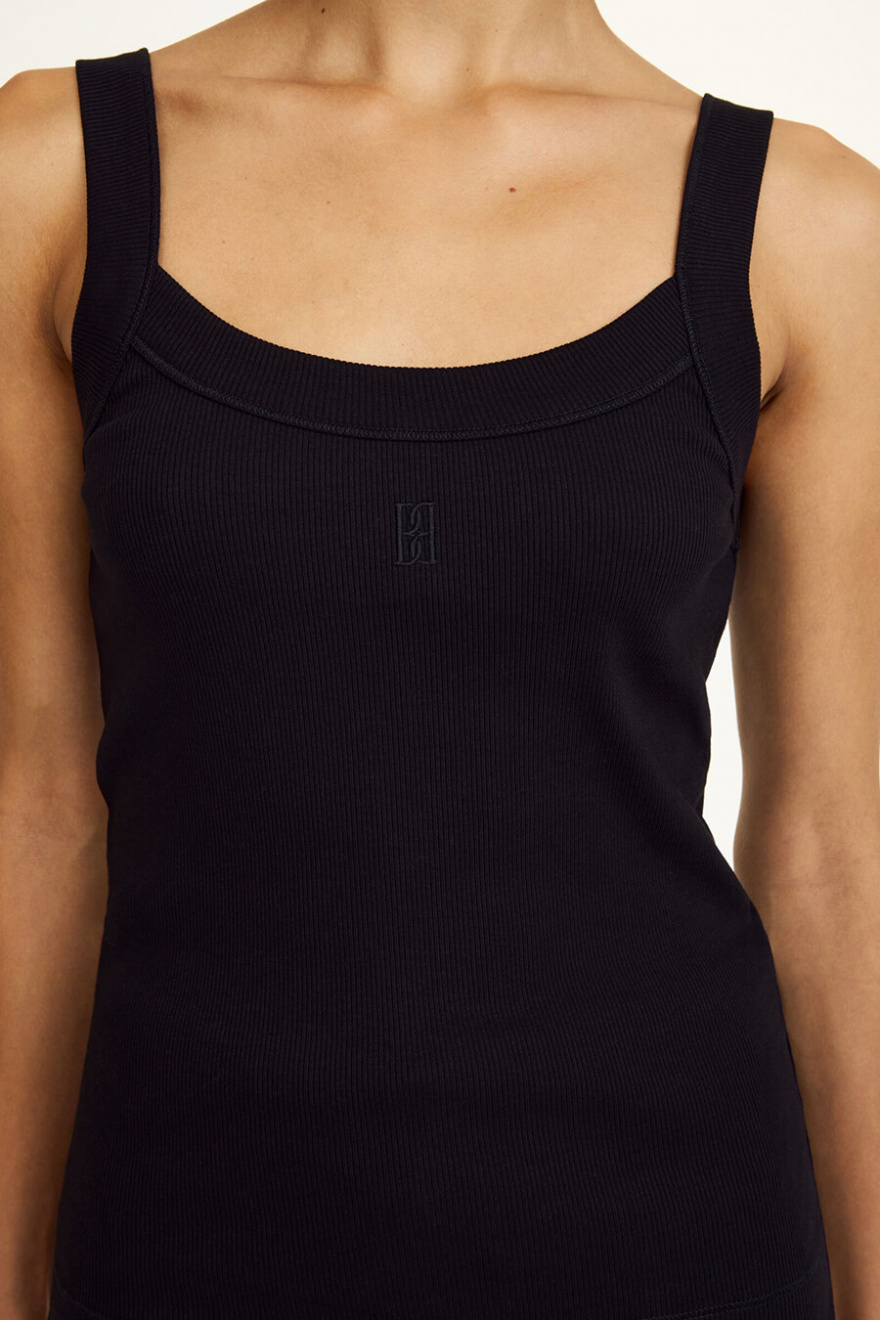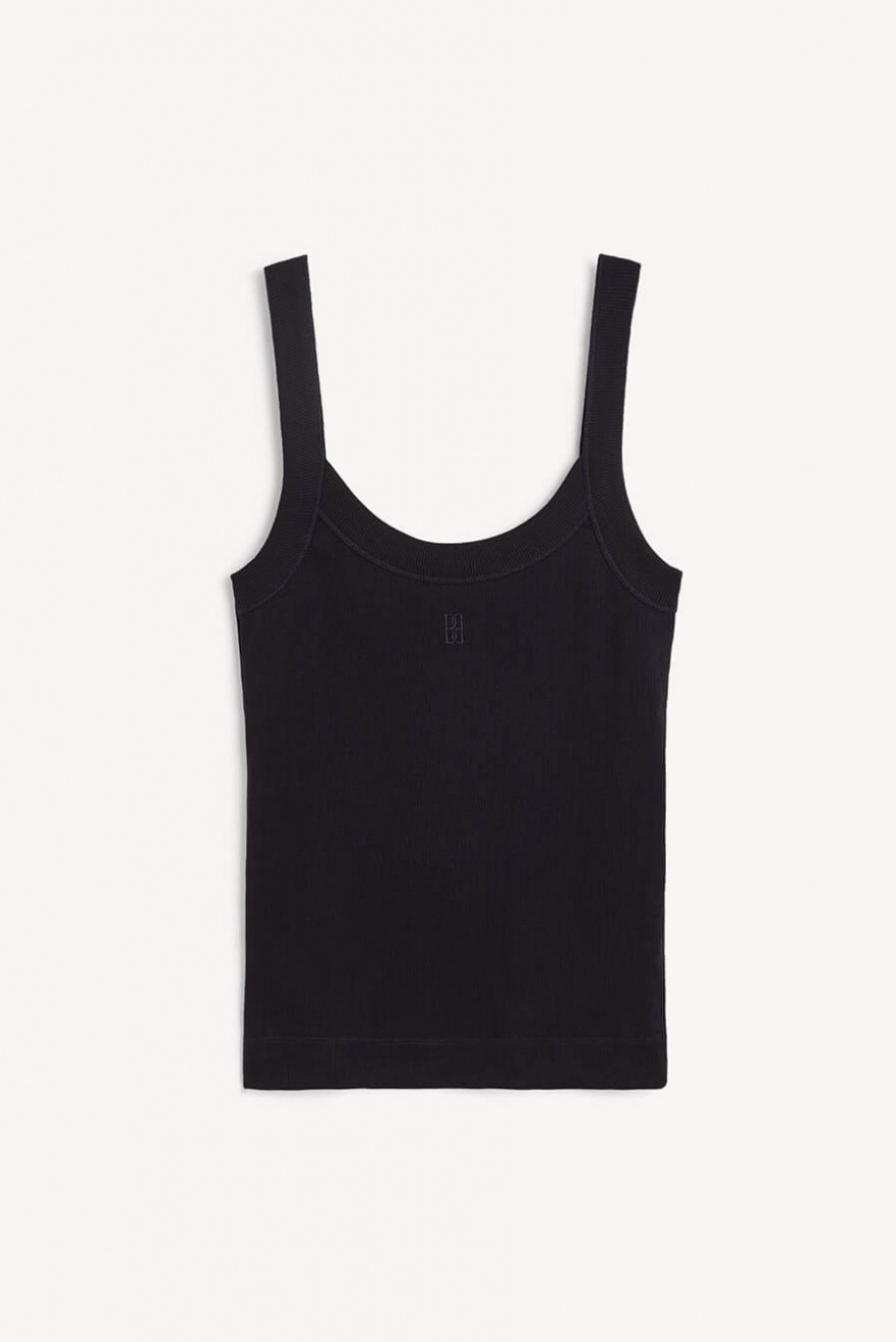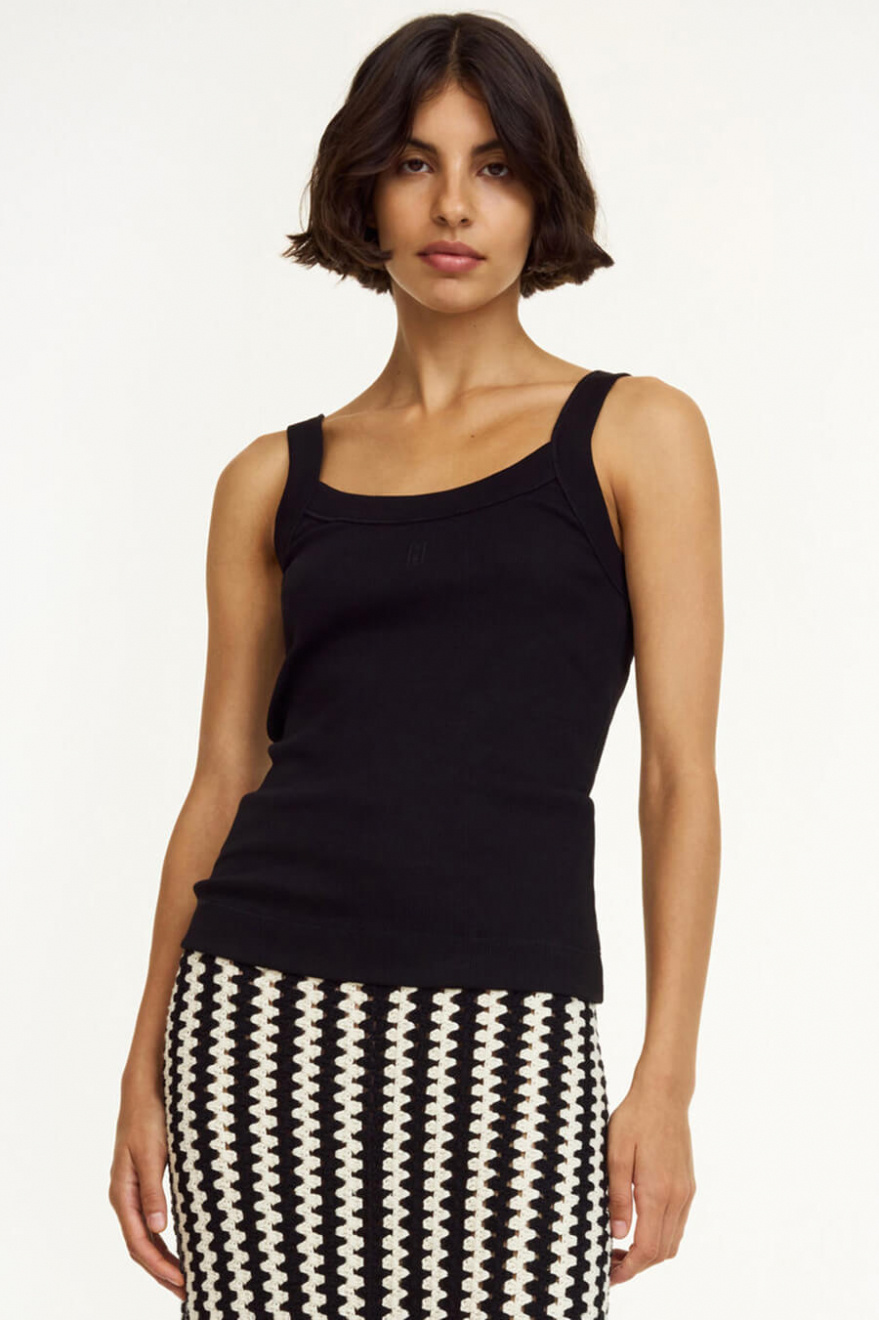 Black ribbed tank top with a slim fit and thick straps - a wardrobe favorite with attitude. The monogram logo on the front adds an exclusive touch. Perfect to style with both jeans and skirts for a timeless, trendy look. Simple, but never boring.Ribbknitted tank top in organic cotton with wide shoulderstraps, slim fit and embroidered logo front from By Malene Birger.
