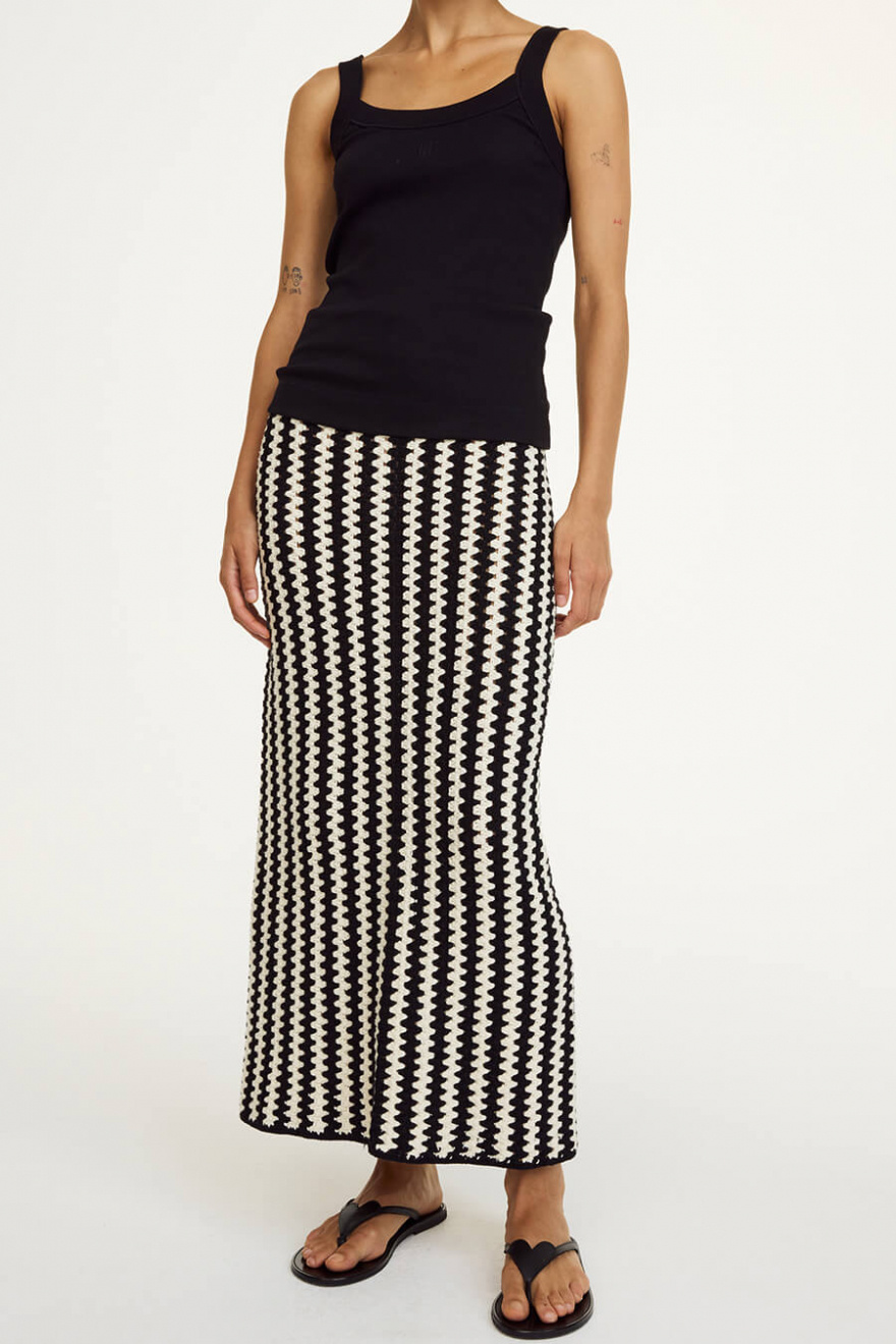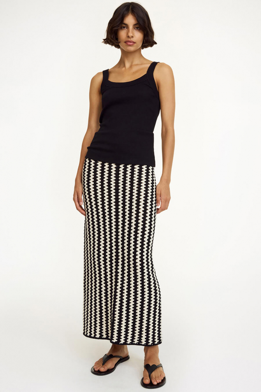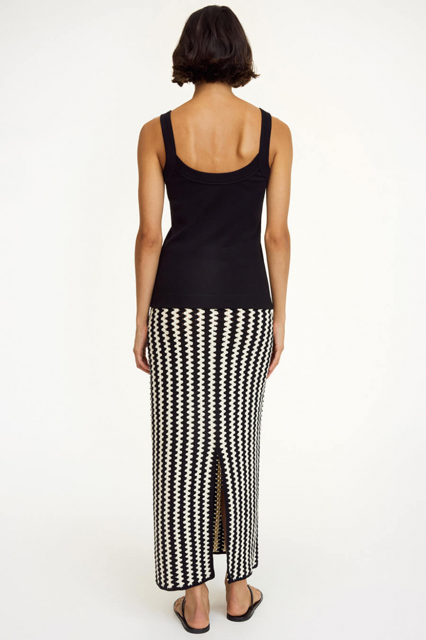 Black ribbed tank top with a slim fit and thick straps - a wardrobe favorite with attitude. The monogram logo on the front adds an exclusive touch. Perfect to style with both jeans and skirts for a timeless, trendy look. Simple, but never boring.Ribbknitted tank top in organic cotton with wide shoulderstraps, slim fit and embroidered logo front from By Malene Birger.