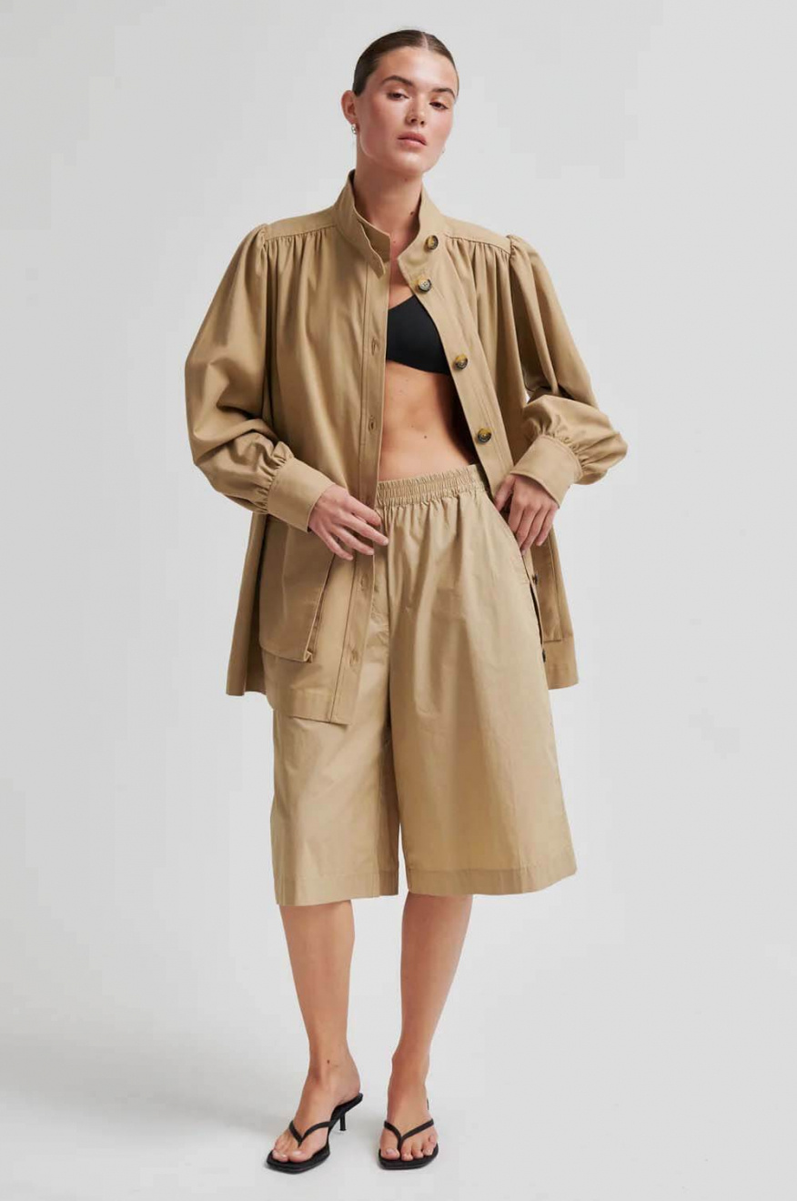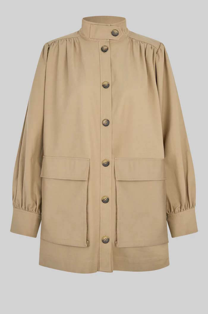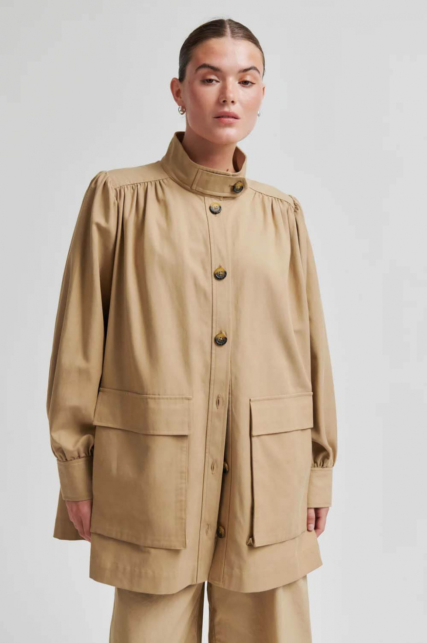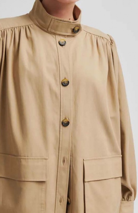 Second Female jacket with pockets, crafted from a smooth cotton-blend fabric for a clean and modern look. Designed with a high neckline and full button-through fastening. Features gathered shoulders, long sleeves, and buttoned cuffs for a subtle feminine touch.