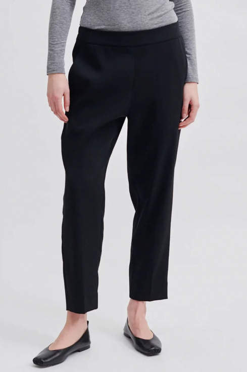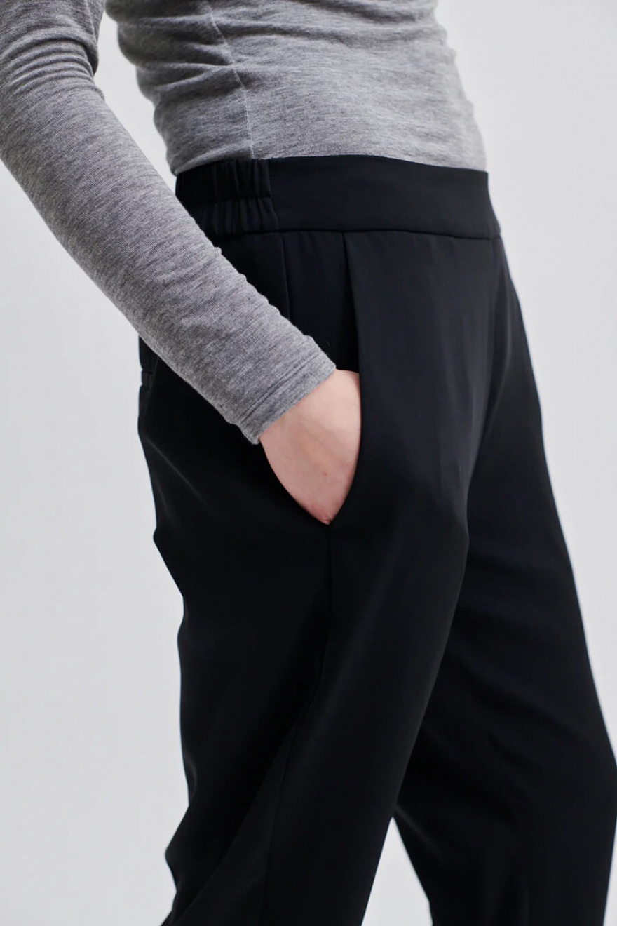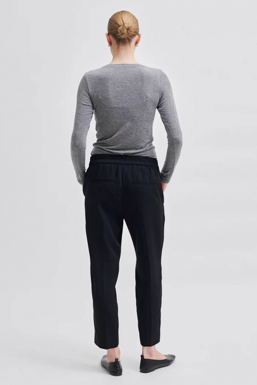 These black trousers combine simplicity with a relaxed fit. Perfect for both everyday and work, they offer comfort with style. The minimalist design makes them easy to match to any occasion.Trousers in a loose fit with mid waist, ankleshort legs, elastic waistband and pockets at the sides from Second Female.