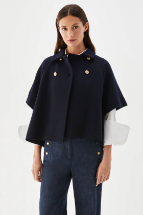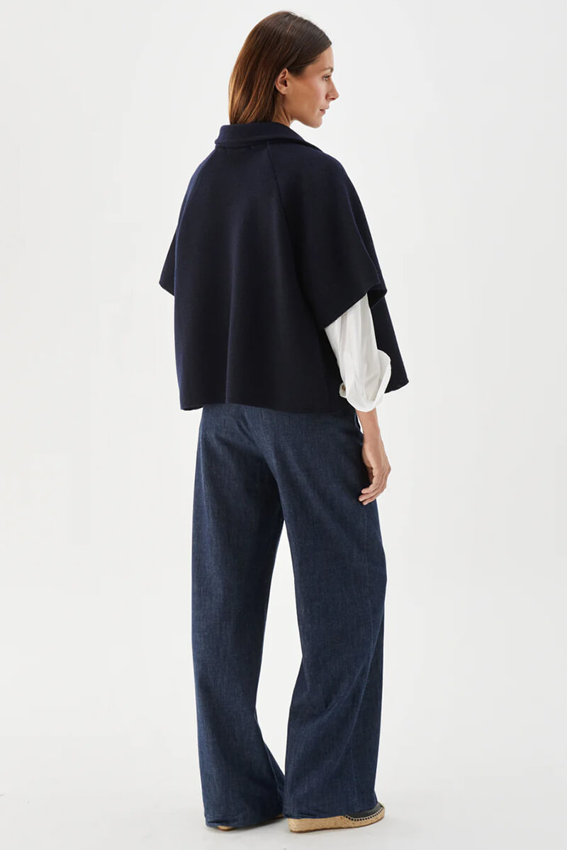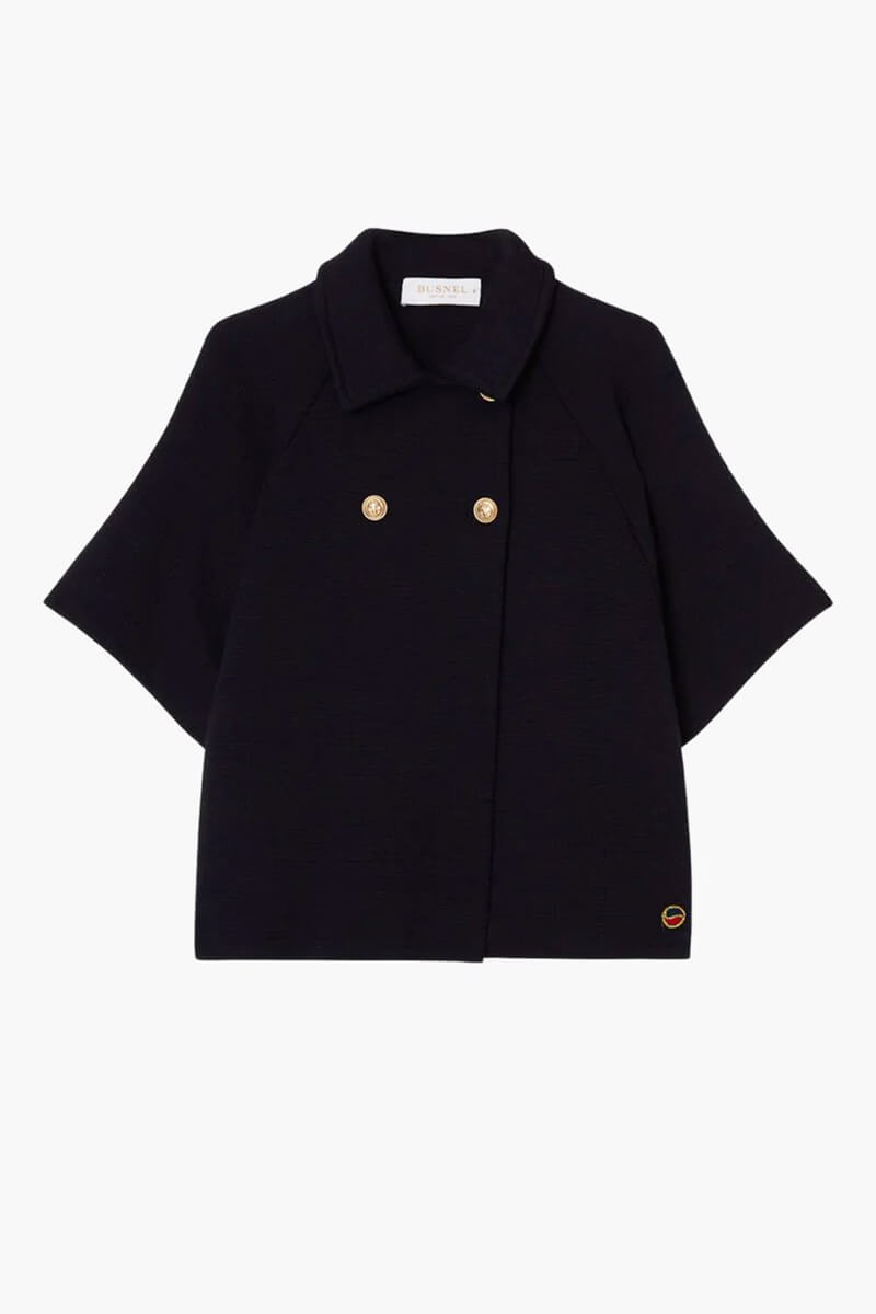 Double-breasted cape featuring a wider fit that ends at the hip. The garment is designed with soft raglan sleeves and adorned with Busnel’s characteristic golden anchor buttons for a polished, nautical finish.