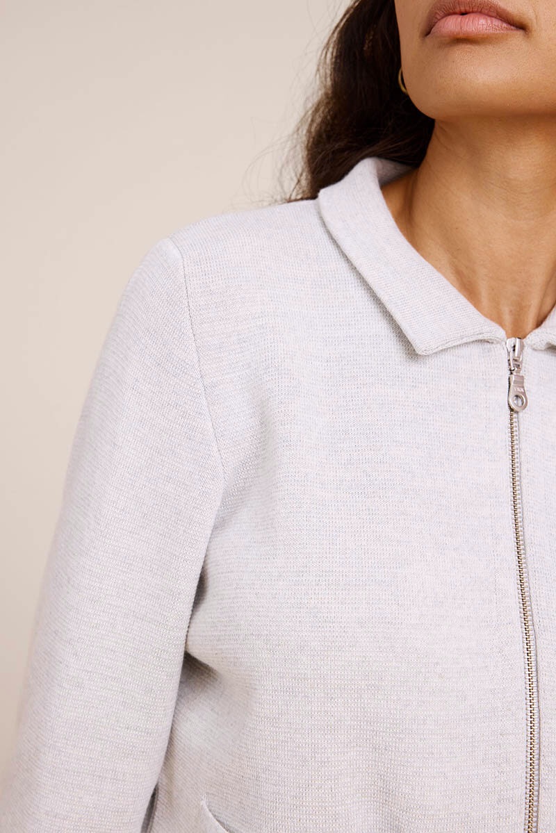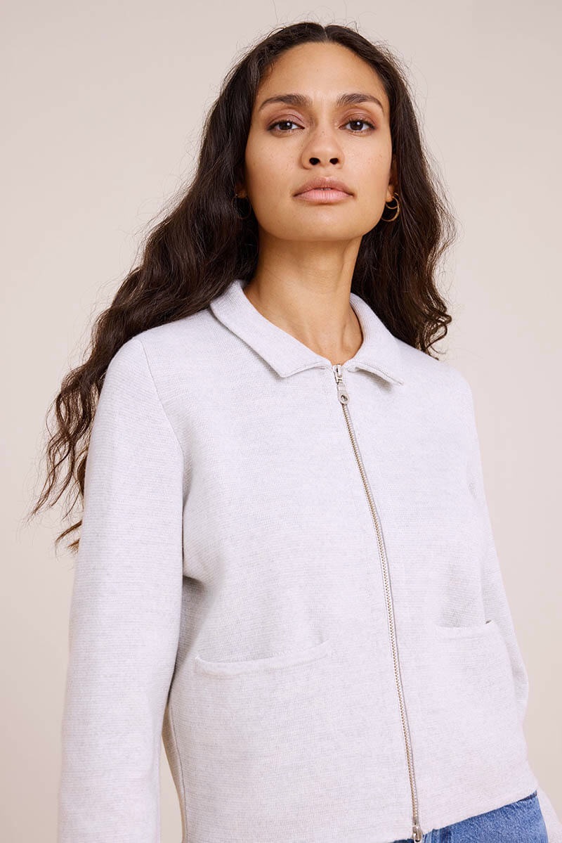 A sleek and easy-to-wear cardigan that combines comfort with a modern touch. The cardigan features a front zip and collar, offering a relaxed yet polished look. Discreet front pockets add both function and style, making it perfect for everyday wear or the office.
