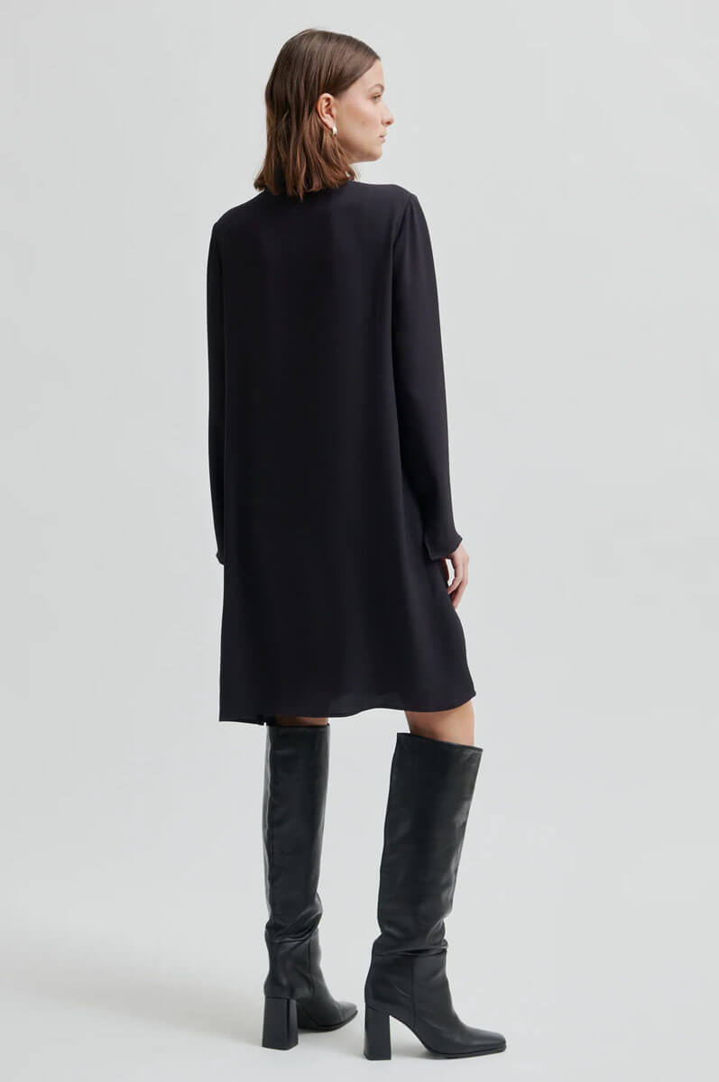 A sophisticated dress from Second Female, crafted from a softly draping viscose blend with a beautiful sheen. The design exudes understated elegance with its keyhole opening at the front and delicate button fastening. A refined pleat on one shoulder and subtle gathers at the side create a flattering, symmetrical drape that enhances the silhouette. With long sleeves and a straight, feminine fit, it offers a timeless and luxurious look – perfect for both everyday wear and more elevated occasions.