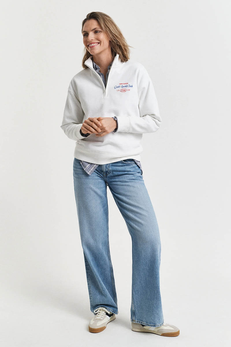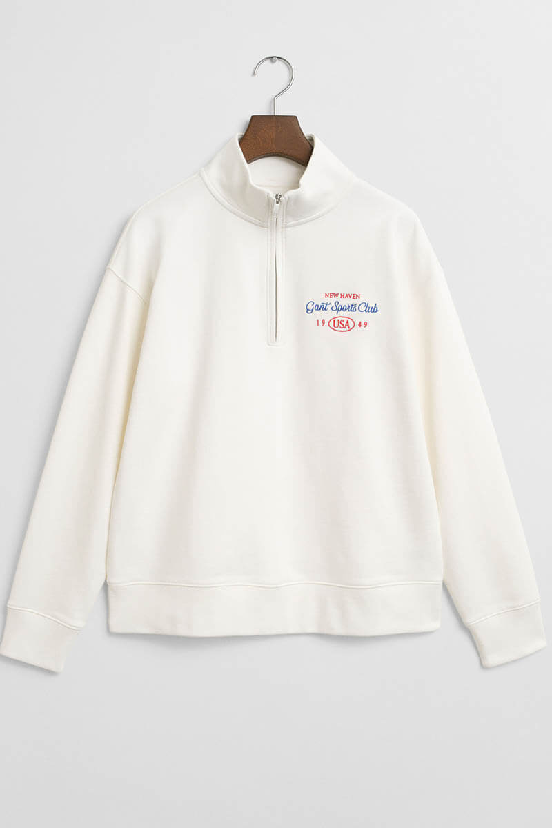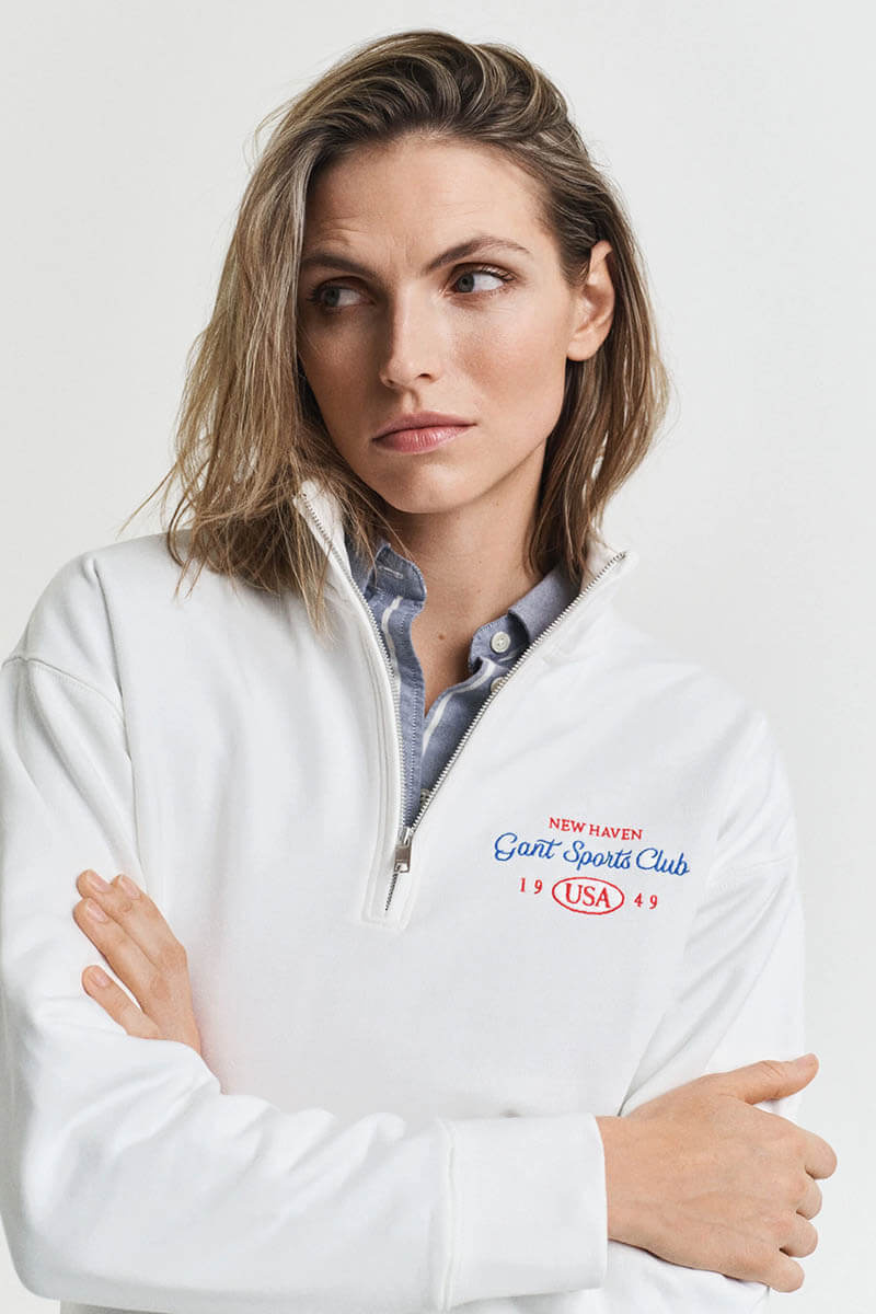 The college look never goes out of style. This half-zip sweatshirt is just as perfect for a weekend stroll as it is after work. Sporty preppy with a vintage feel – a stylish investment for those who love timeless design and comfort in one.Sweatshirt in cotton with half zip, high collar, relaxed fit, ribbknitted edges, falling shoulder seams and embroidered logo from Gant.