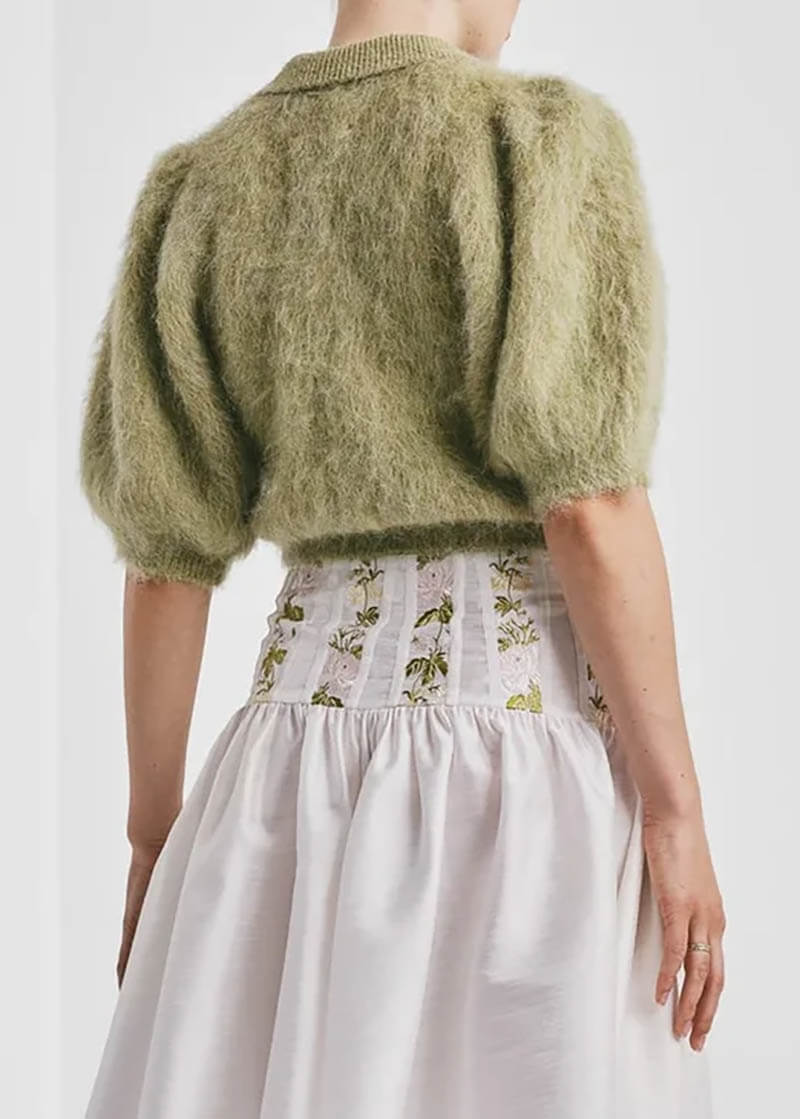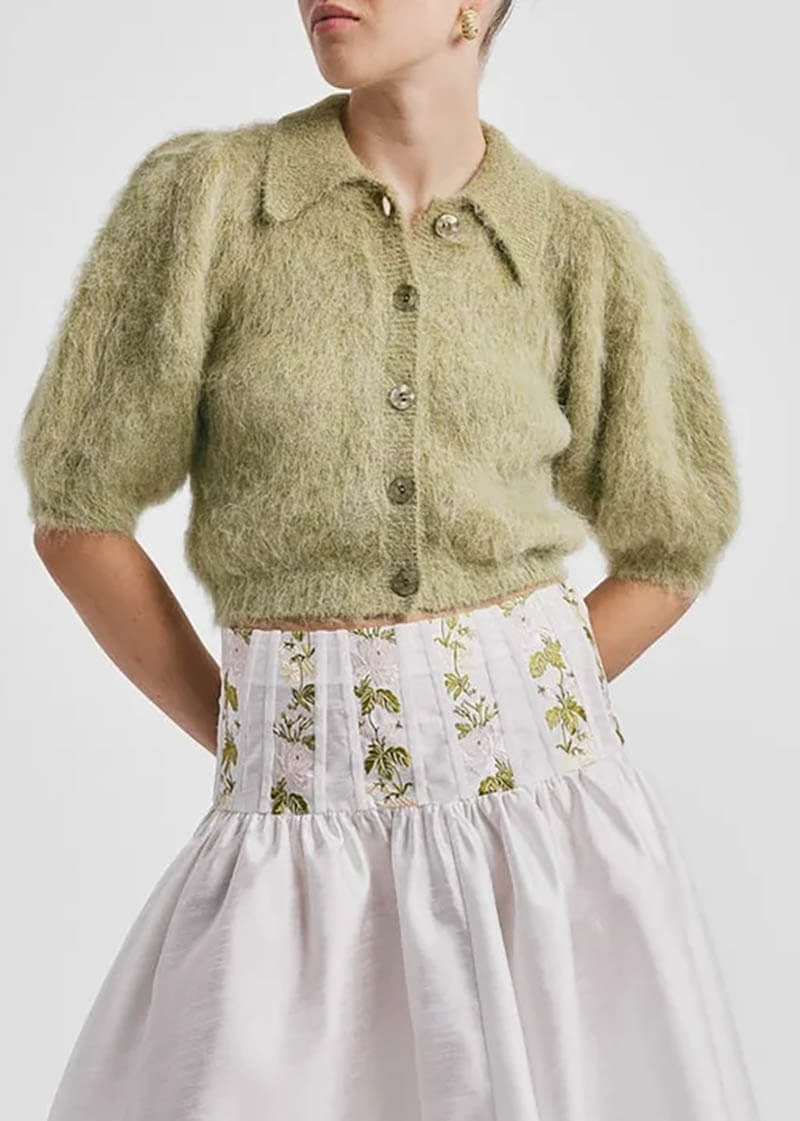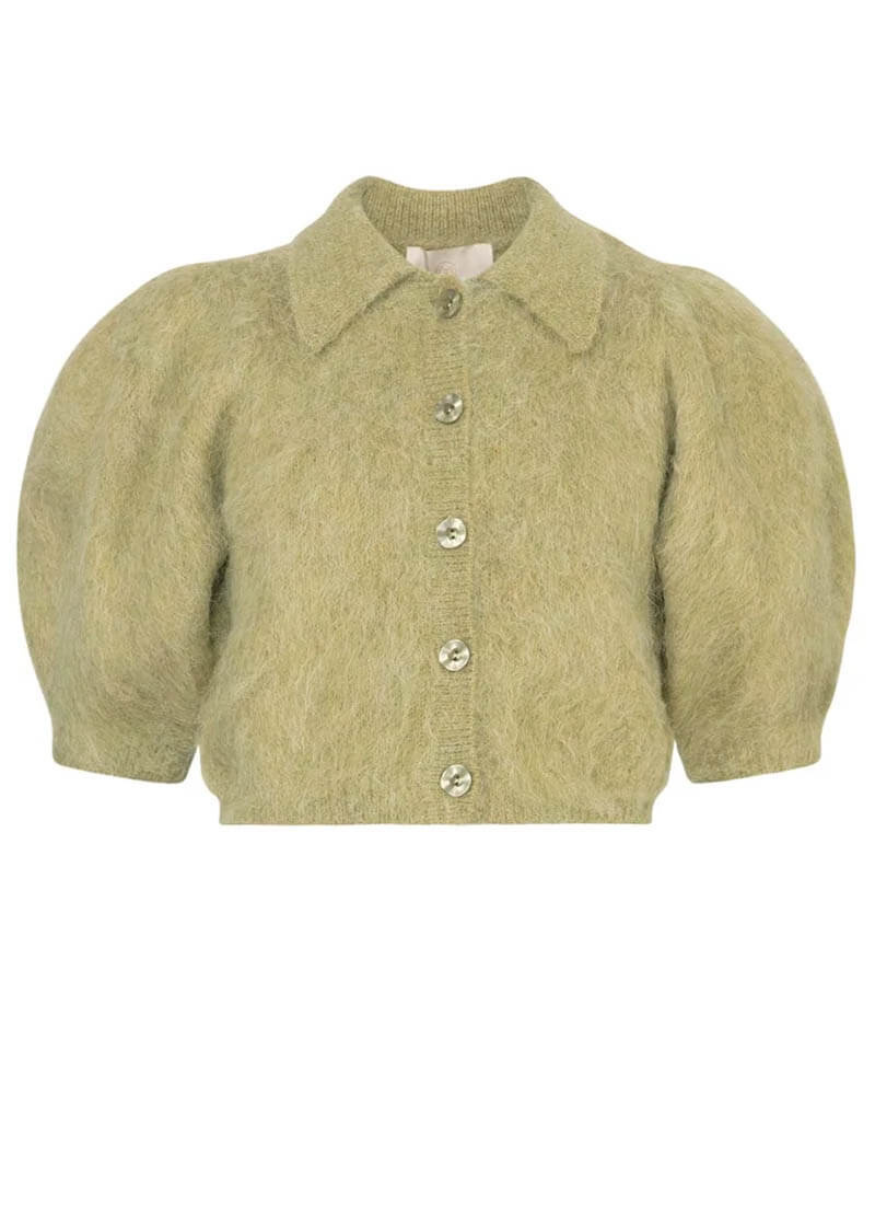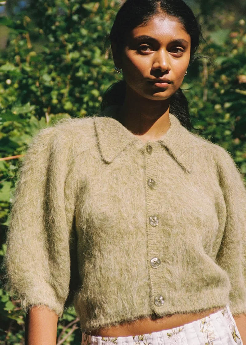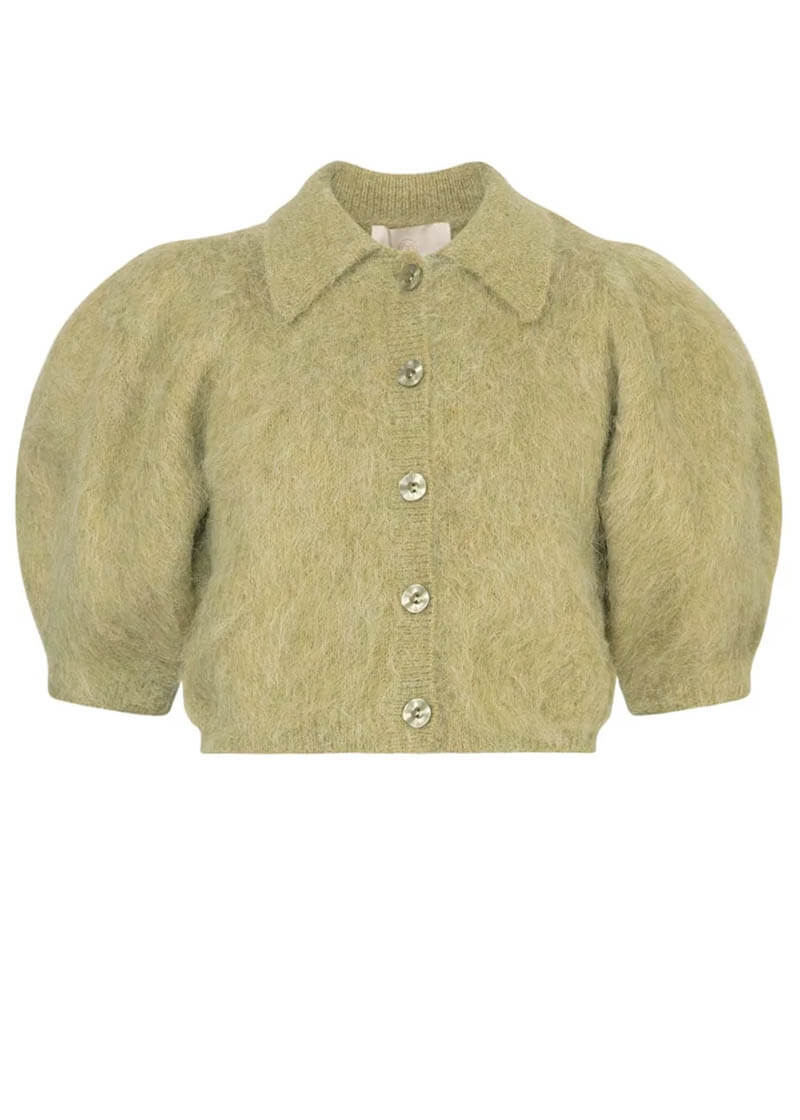 The Hairy Knit Puffed Jacket is made of our very soft and fuzzy blend of yarn.The jacket has a cropped, fitted silhouette, short puffed sleeves with elastic cuffs, and shirt collar. The cuffs, collar and hemline features beautiful rib details. The jacket closes in the front with buttons.