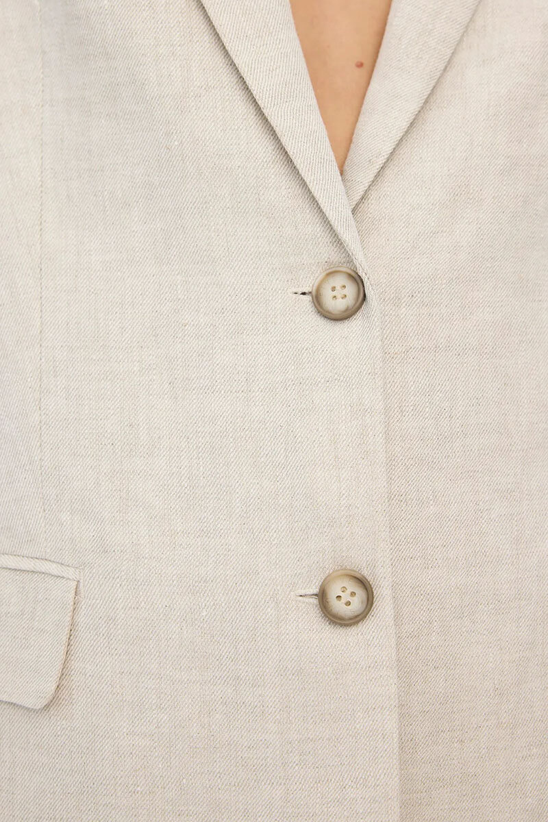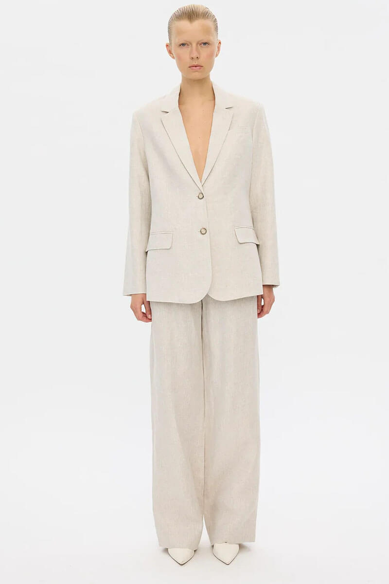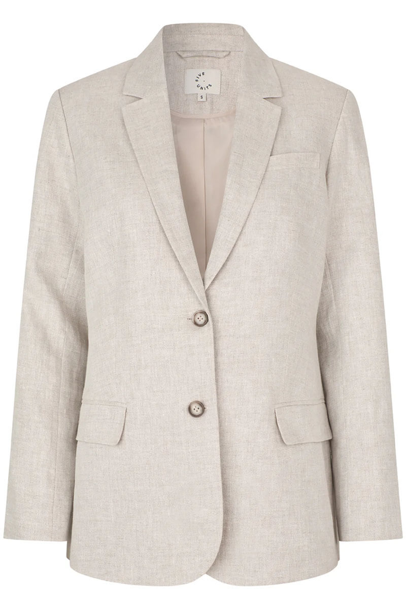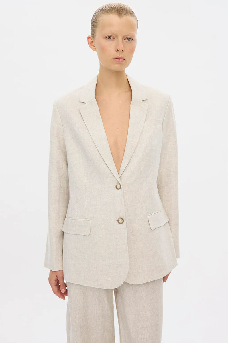 HannahFV is tailored in a straight-fit silhouette with a single-breasted front, featuring a soft, sculptural style with minimal details such as logo buttons, a notched lapel, a functional chest pocket, and front flap pockets. Darts at the sides and soft shoulder pads frame the body, while a back slit ensures ease of movement. Designed in Copenhagen.