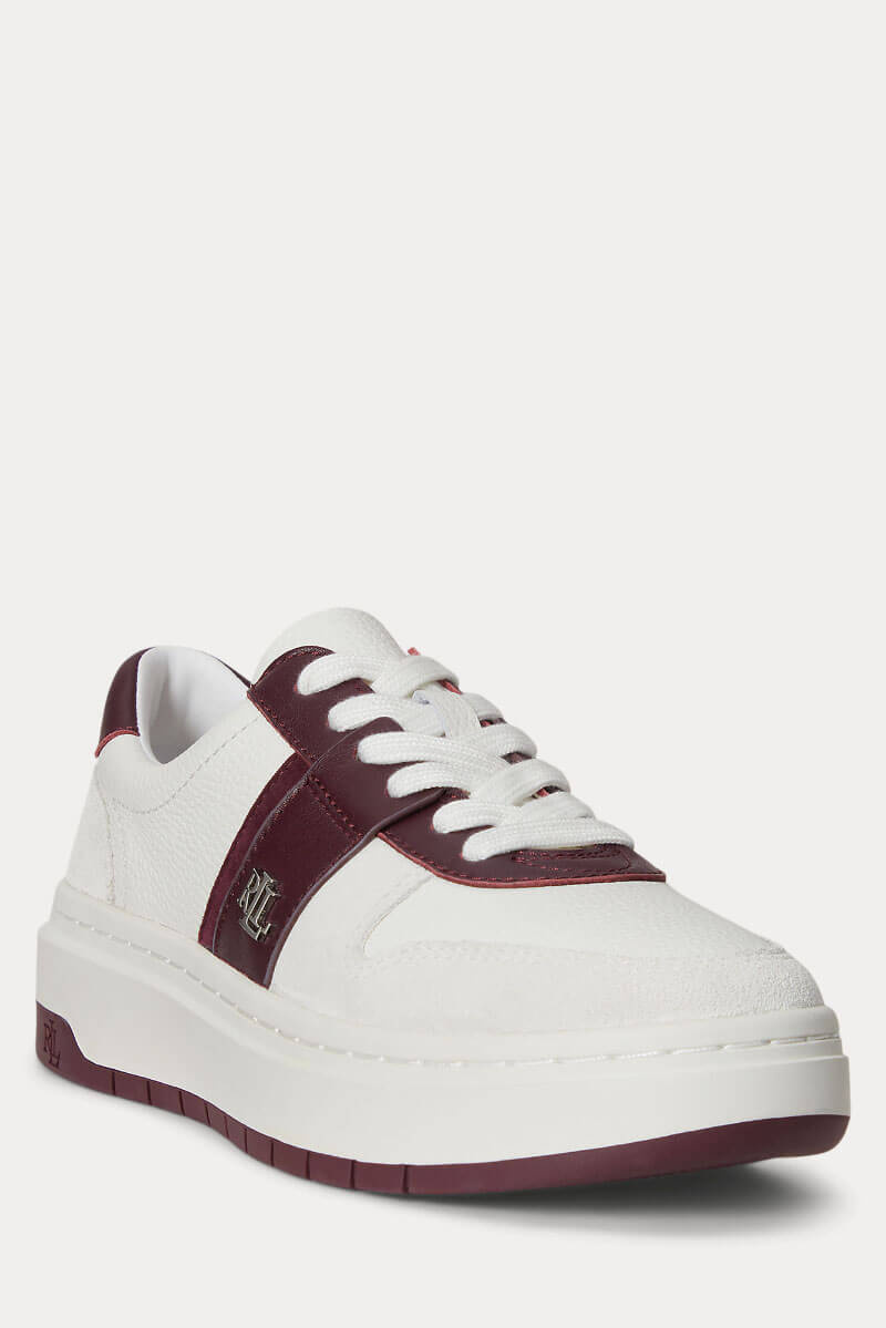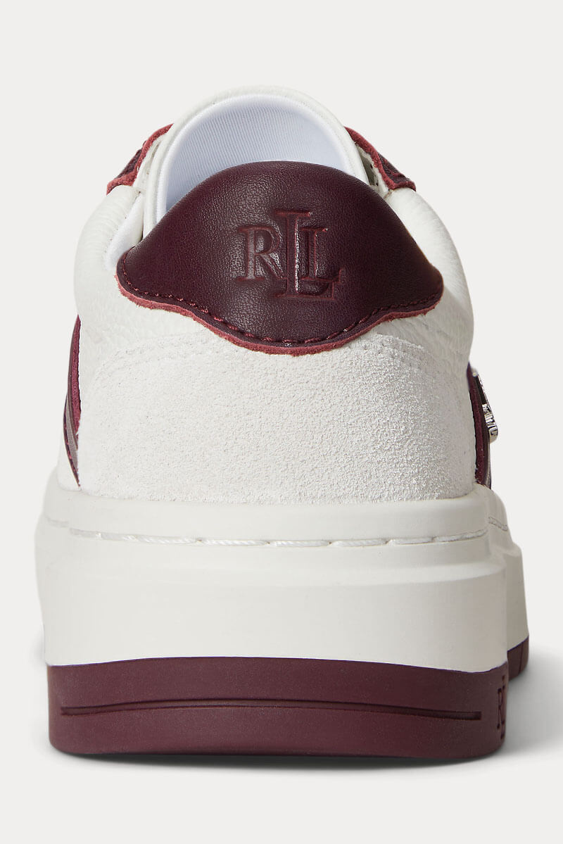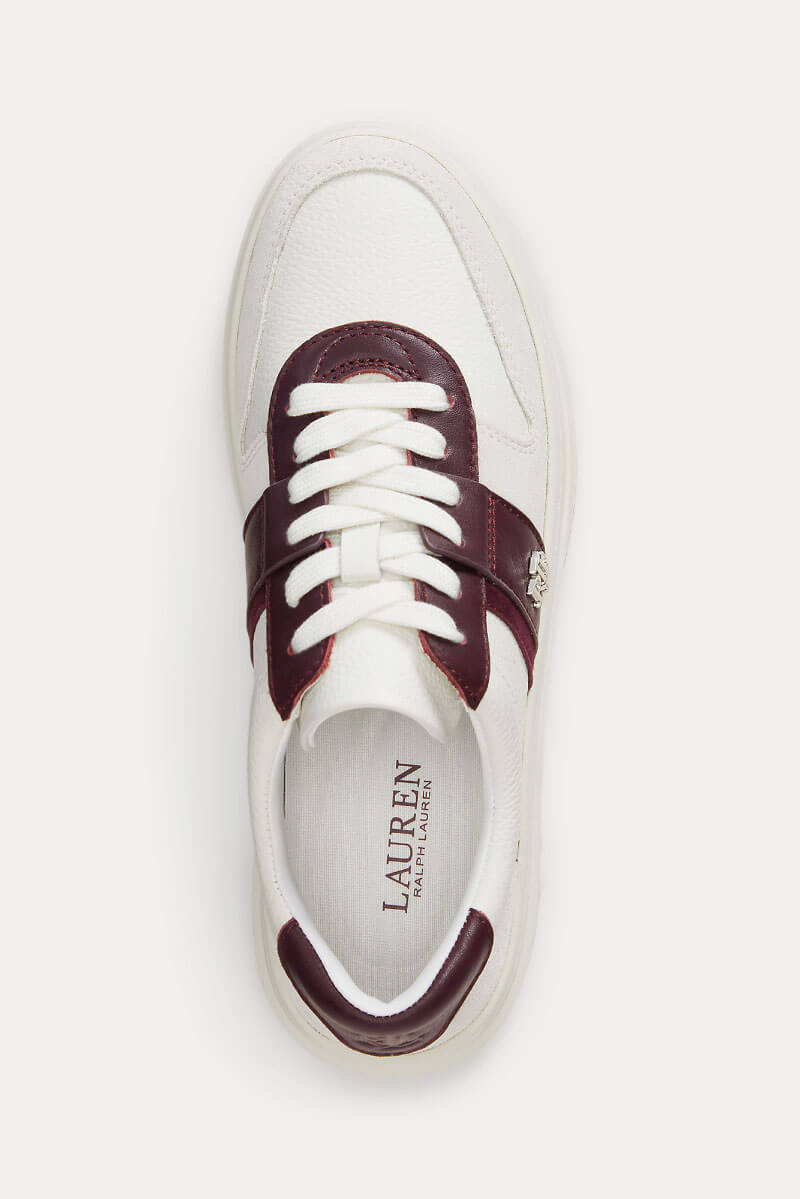 White sneakers with dark red leather details give any outfit a sense of confident simplicity. Wear them with suit pants and a shirt, or a knitted dress with a trench coat - sporty, stylish and always on point.Leather sneakers with a logo on the side, a rounded toe and a rubber outsole from Lauren Ralph Lauren.