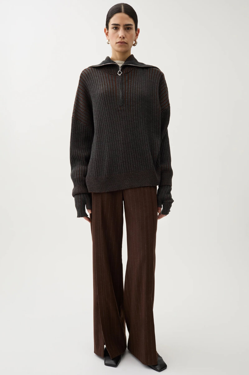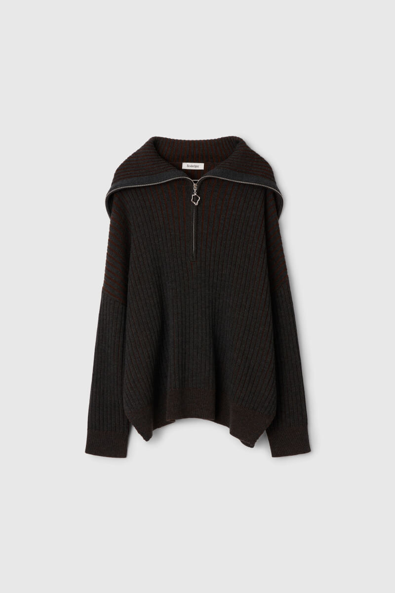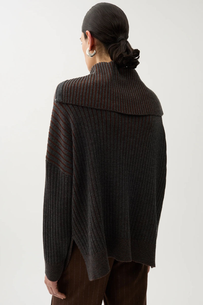 A dark grey ribbed sweater with an oversized fit and cape-like collar creates a sculptural silhouette. Knit fashion at its most interesting – casual yet sophisticated.Ribbknitted sweater in a soft merino wool with oversizedfit, ribbknitted edges, cape collar with a zipper front from Rodebjer.