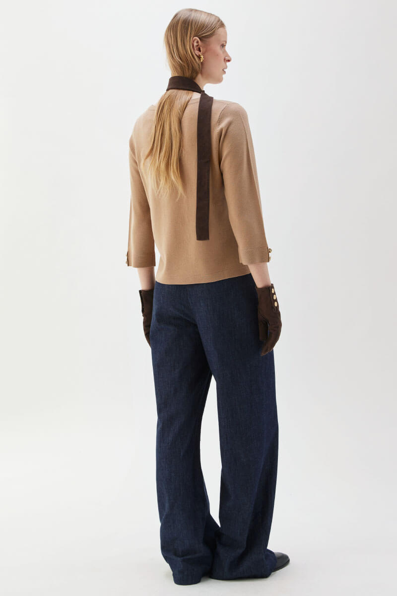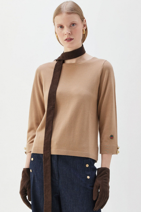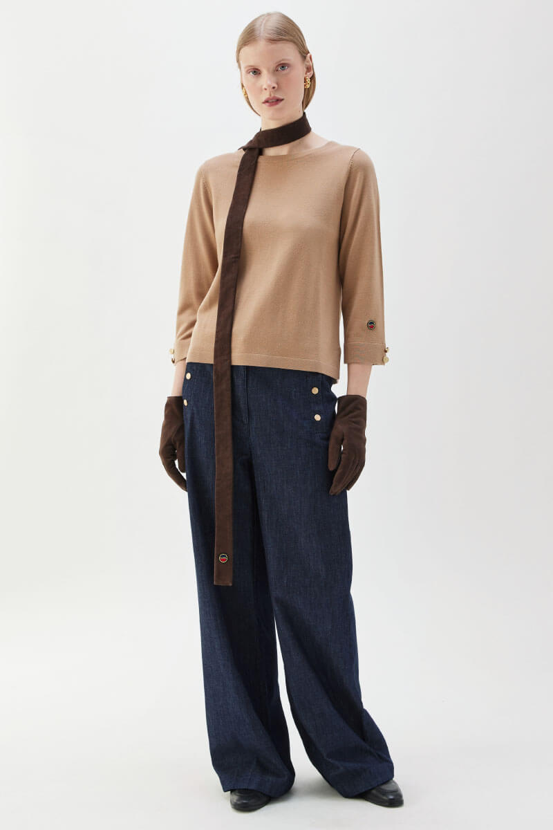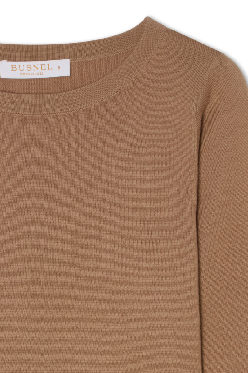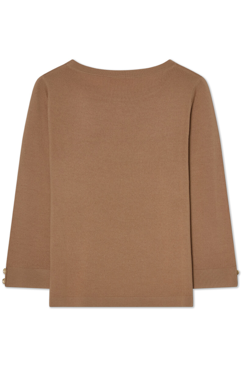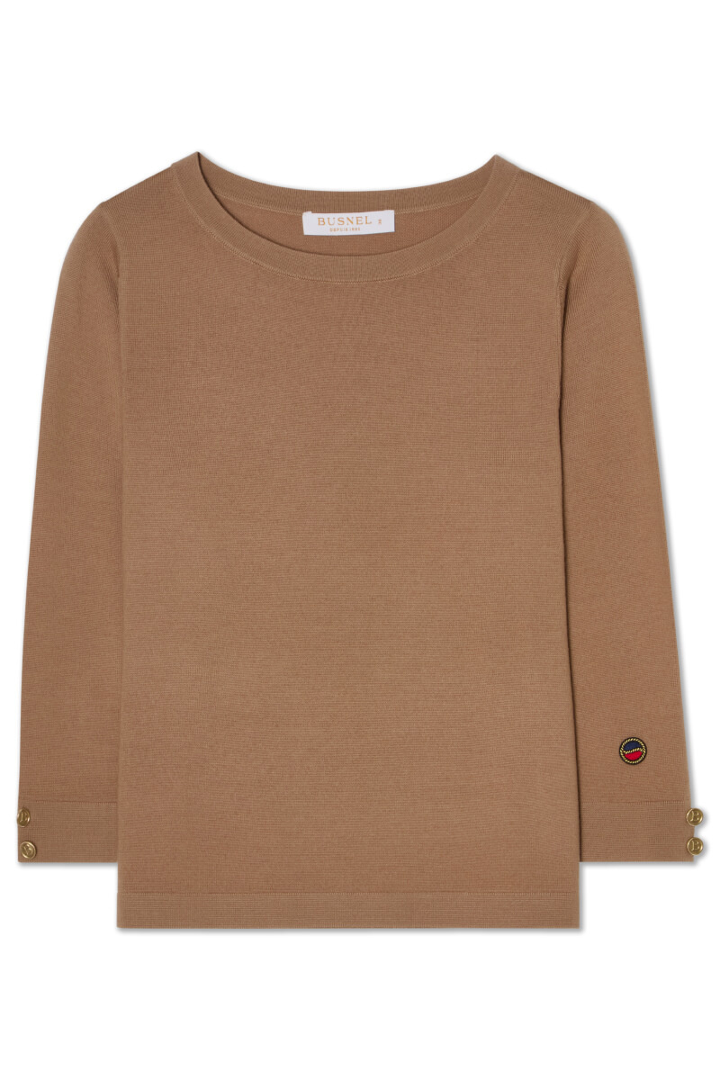 Soft merino wool top in a relaxed fit and warm caramel tone. Wear it with tailored trousers or a midi skirt for an elegant everyday look. Stylish accessories and boots complete a relaxed, sophisticated and timeless outfit that feels modern and chic.Knitted top in merino wool with round neckline, 3/4 sleeves, relaxed fit, decorative buttons and logo at the end of sleeves from Busnel.