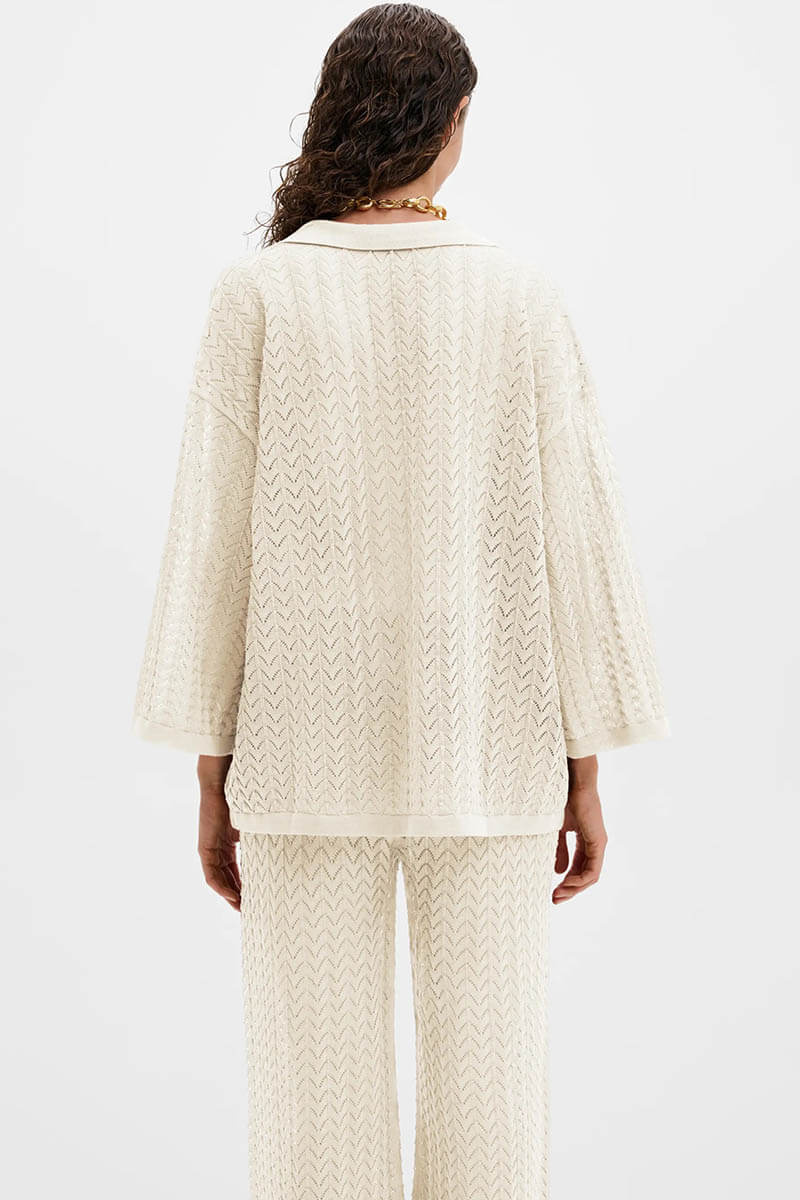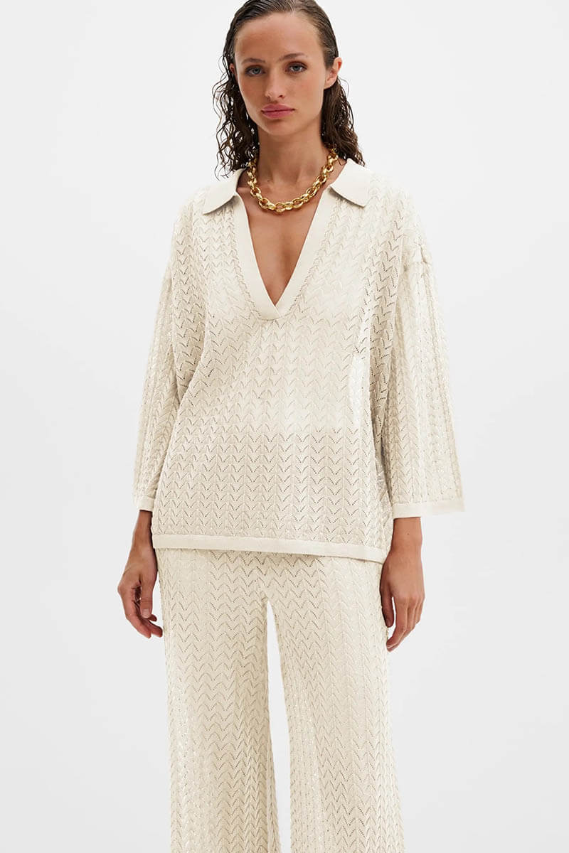 A pattern-knit sweater in a soft viscose blend. The relaxed fit and dropped shoulders create a contemporary silhouette that is easy to style.
