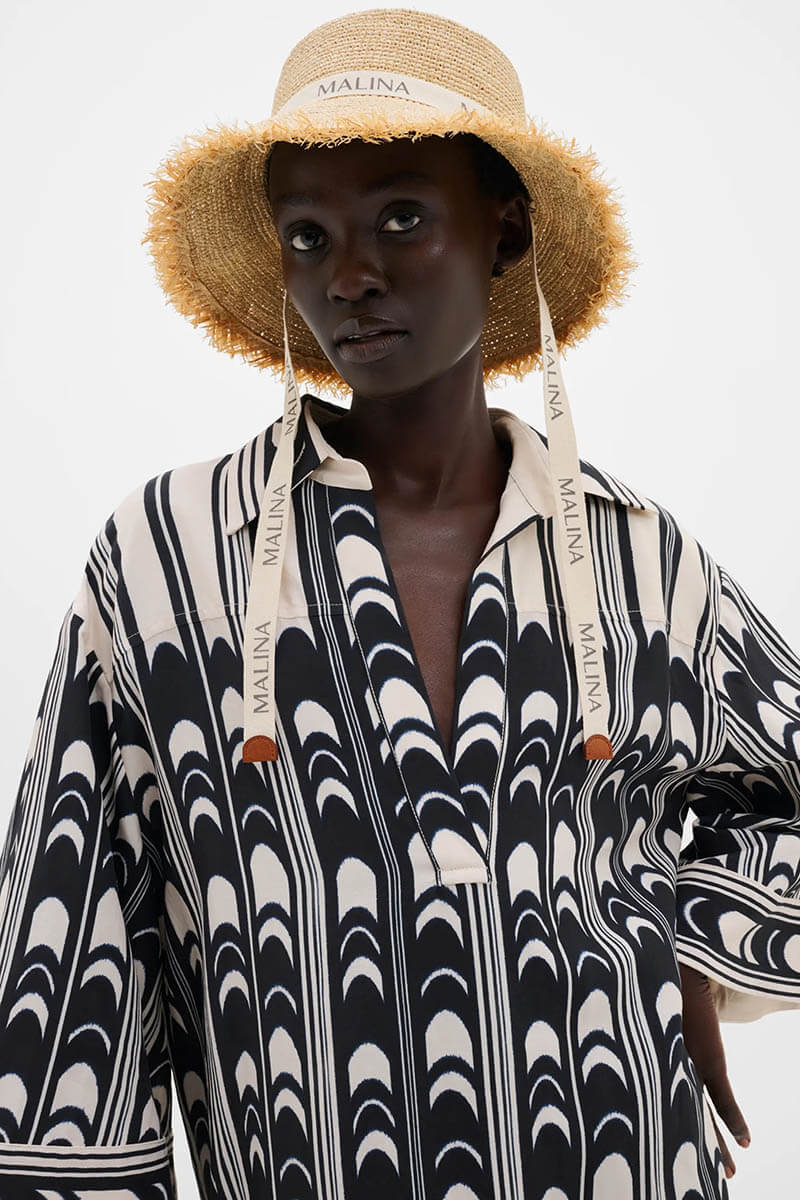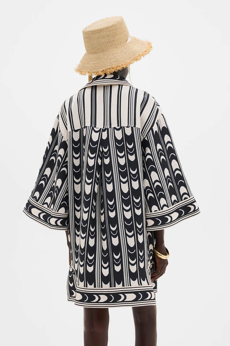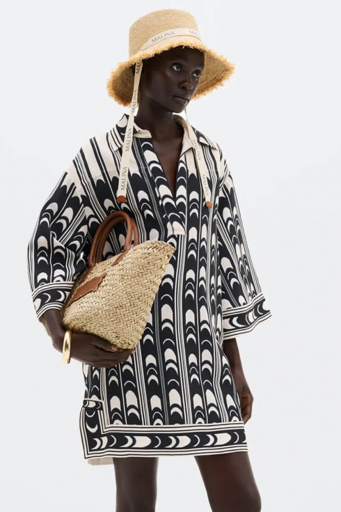 A playful and stylish tunic dress that radiates summer and vacation vibes. The graphic print combined with the airy silhouette makes it a perfect choice for warm days, whether you wear it over swimwear or dress it up for a lunch in the city.