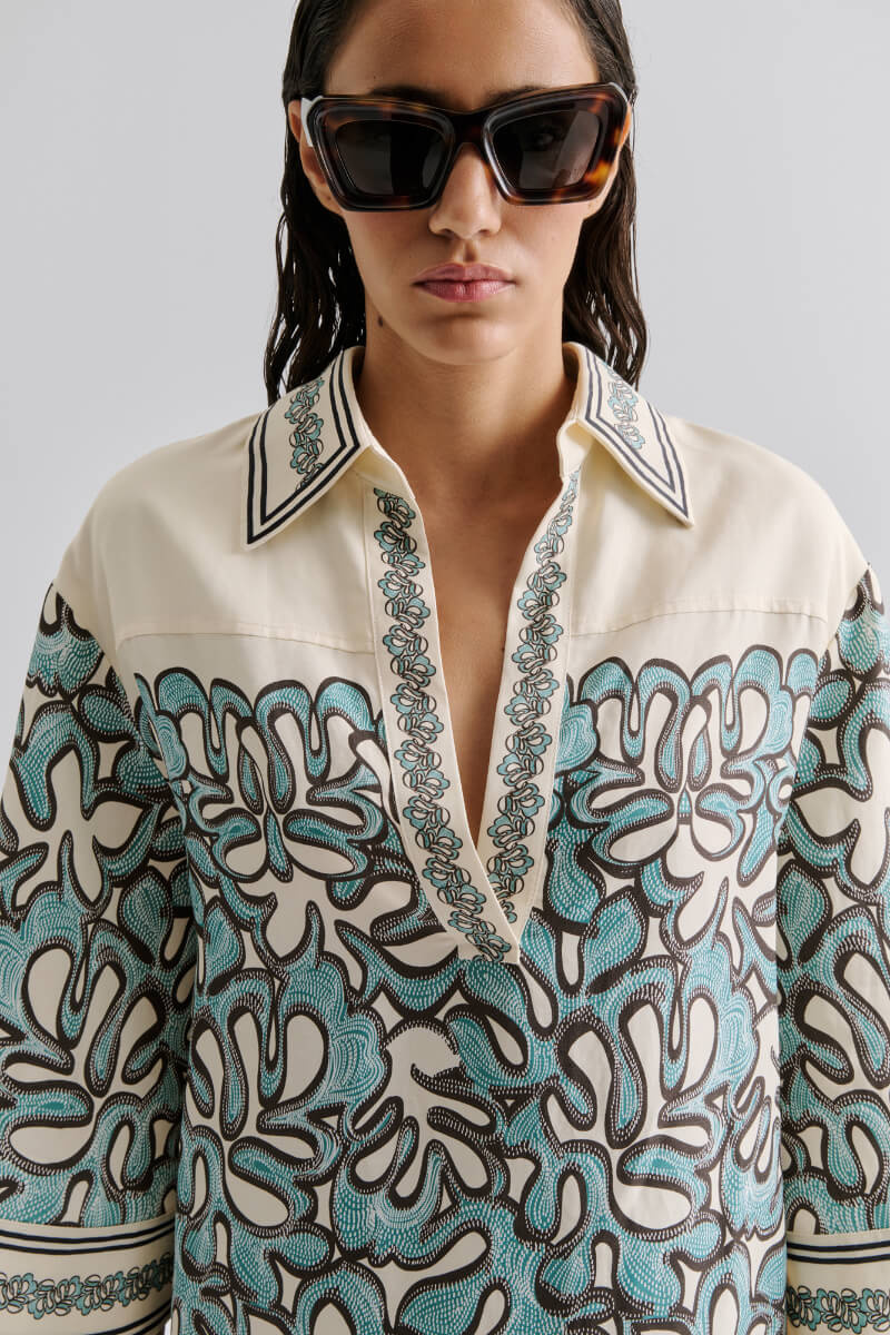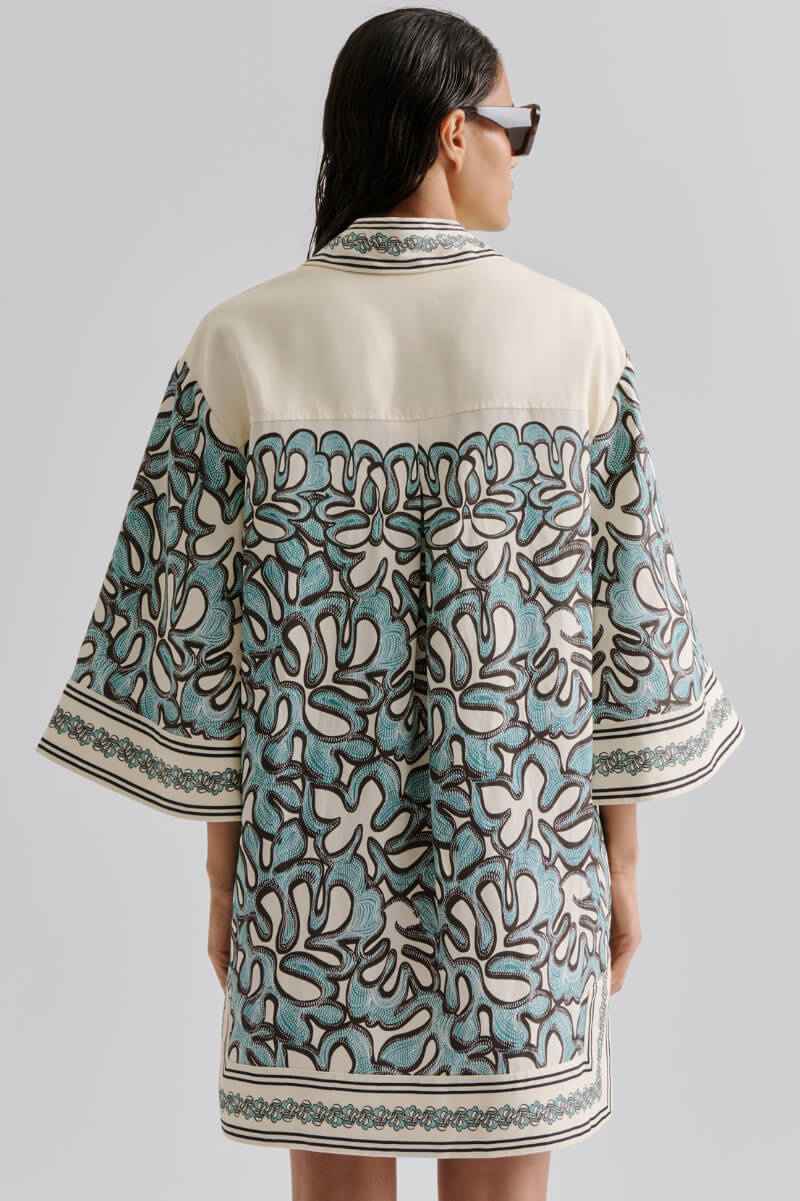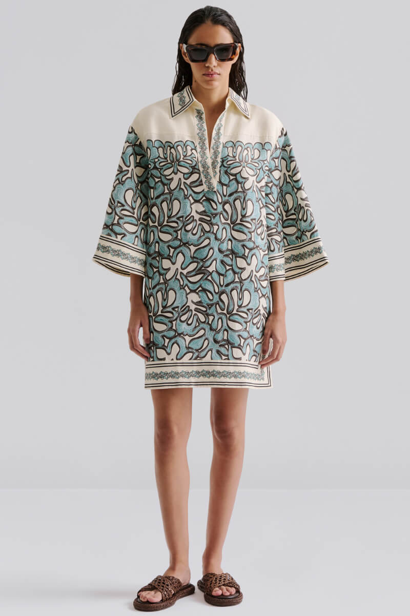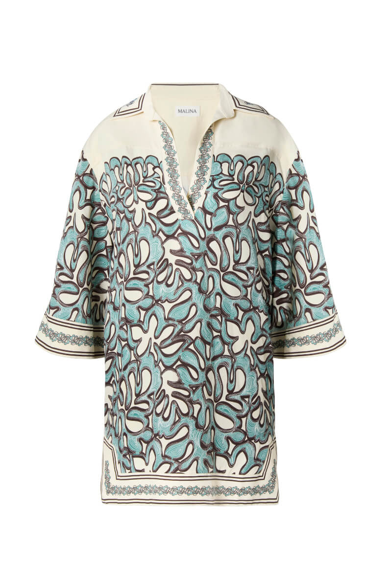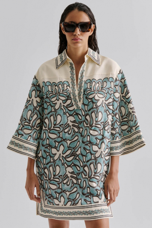 This blue patterned dress is made for all occasions this season. In a cool linen blend with a relaxed fit and subtle elegance, it quickly becomes an obvious choice – from city life to vacation mode.Linen-blend patterned mini dress with v-neck, collar, side slits and wide sleeves from Malina.