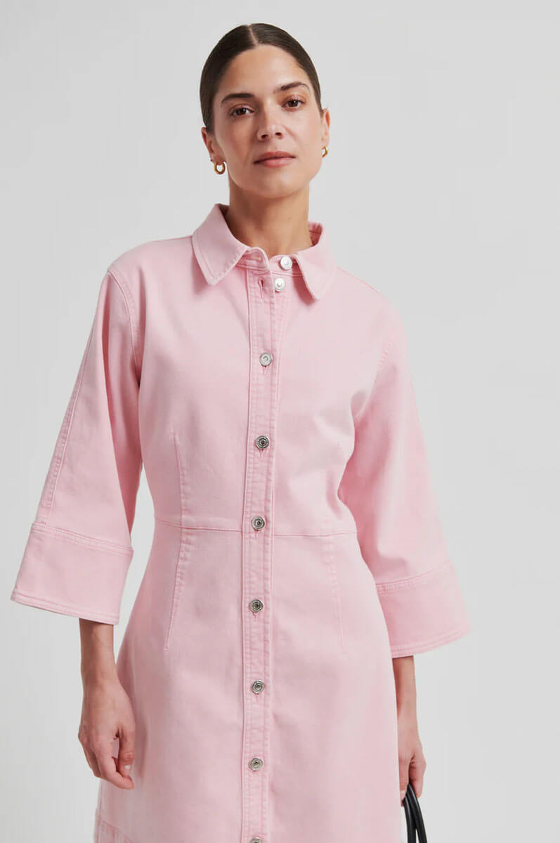 is crafted from soft cotton denim with tonal stitching for a refined, understated finish. Designed with a classic collar, metal button fastening, and three-quarter length sleeves, it features fitted seams at the front and back for a flattering, tailored silhouette.