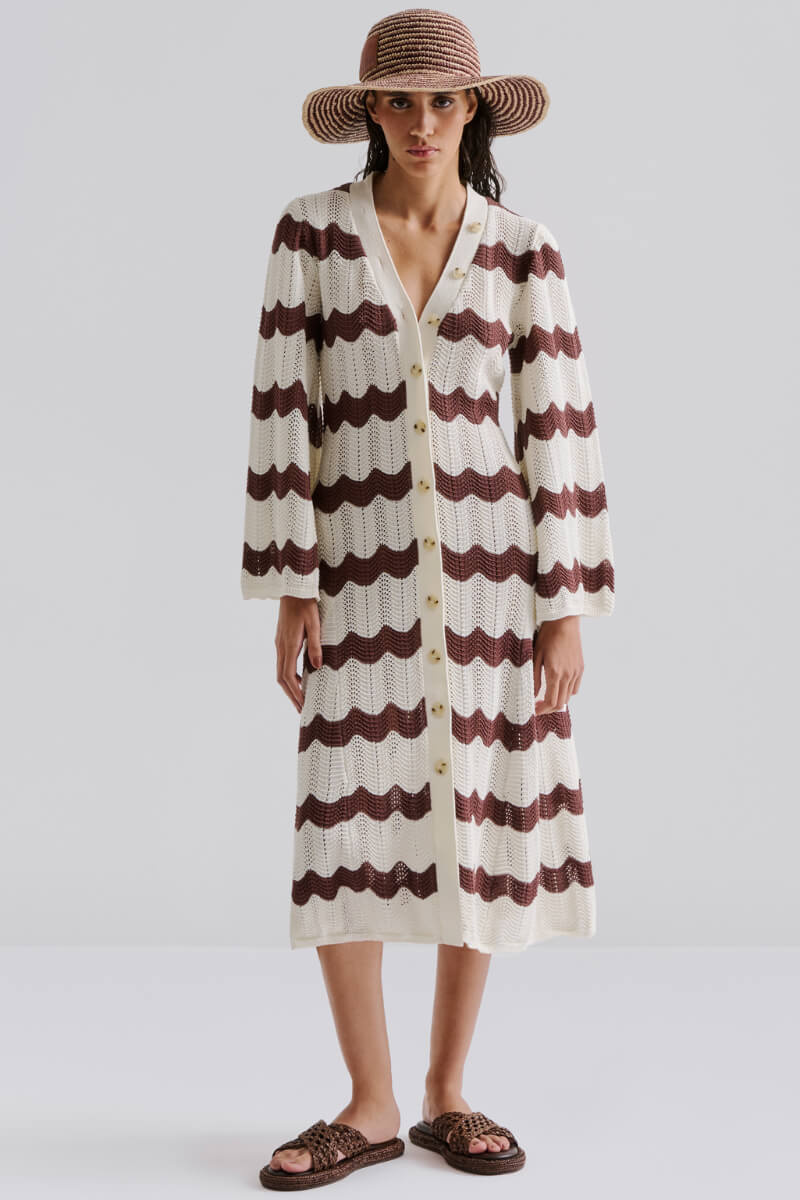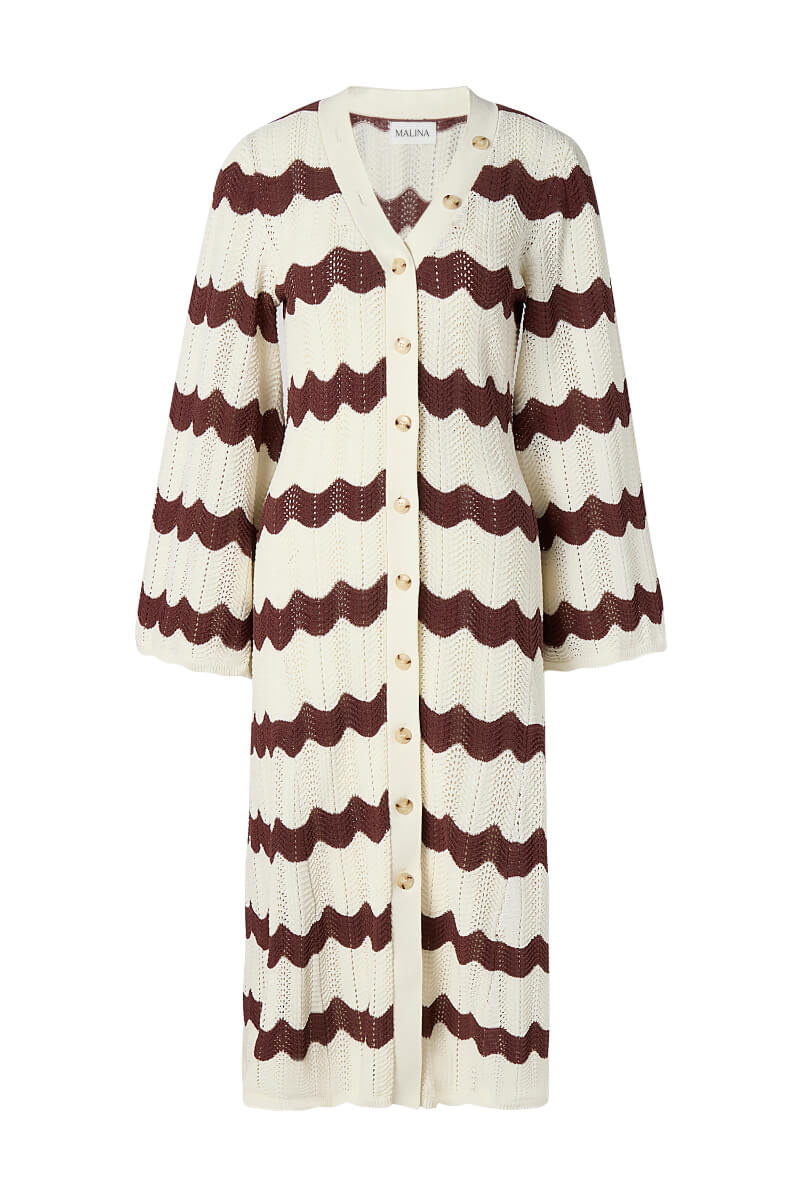 Summer's dream garment in brown and white – a knitted dress with wavy stripes and a soft A-line shape. As chic on the patio as on the city promenade. A stylish investment in a knitted dress you will want to wear again and again.Knitted midi dress in a cottonblend with v-neckline, wide sleeves, wavy edges, button closure front and slightly A-shaped from Malina.