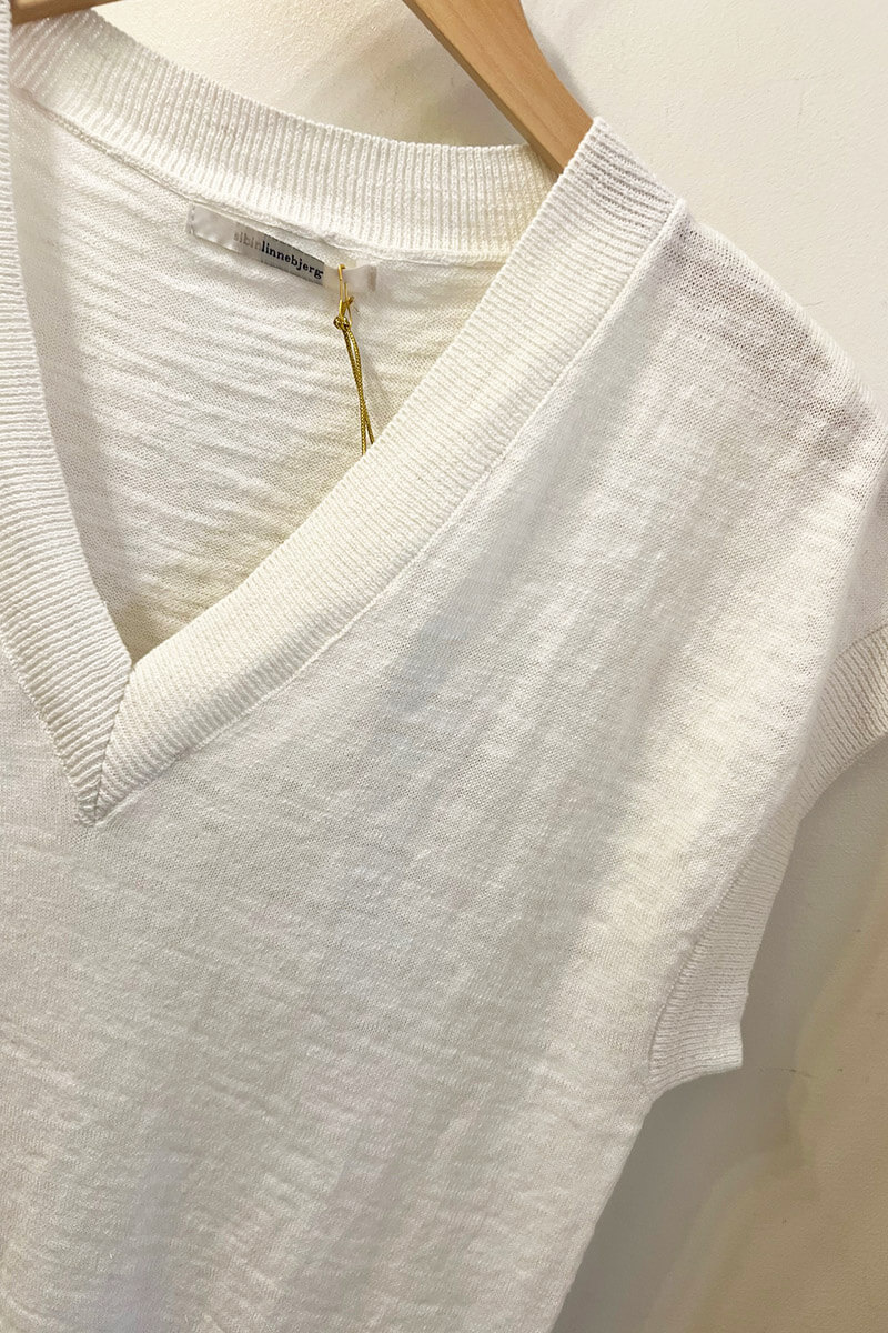 A knitted V-neck top that quickly becomes a wardrobe favorite. The relaxed fit and the small cap sleeve create a flattering silhouette that pairs perfectly with linen trousers or layered under a blazer.