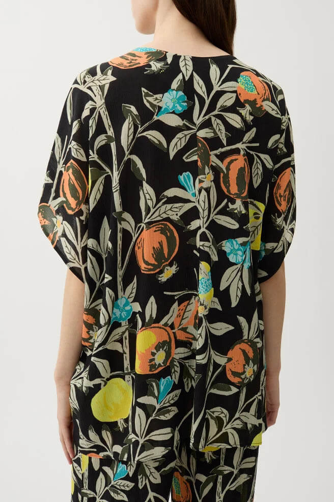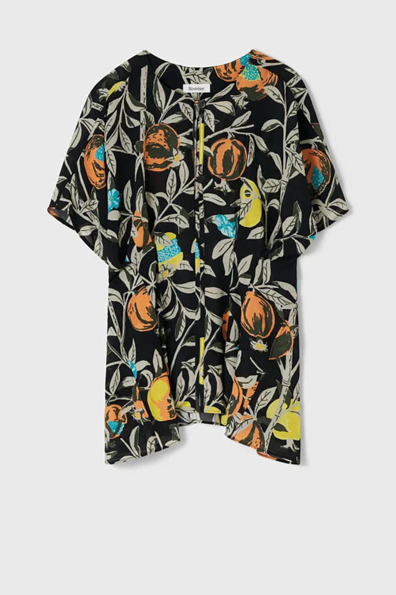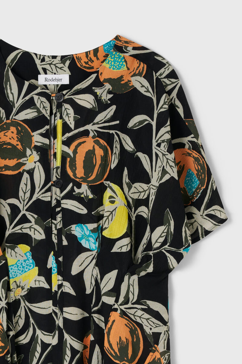 Cool and effortless, this black blouse with a pomegranate print gives your summer look an artistic twist. The airy silhouette and elegant print make it just as stylish with jeans as it is with a wide skirt. A statement without making an effort.Blouse with pleated details at the waist, oversized fit, button closure at the front and short sleeves from Rodebjer.