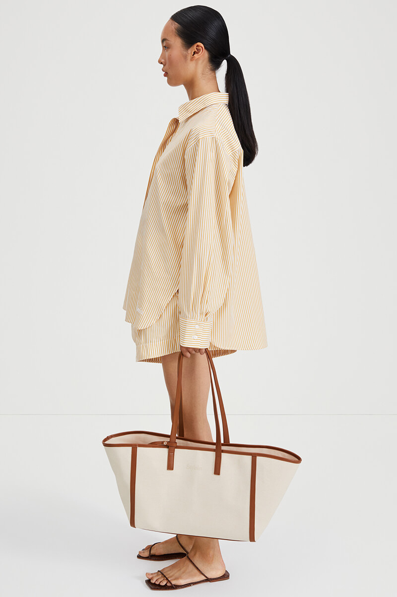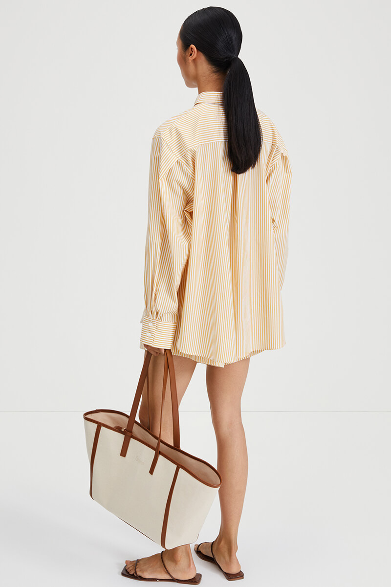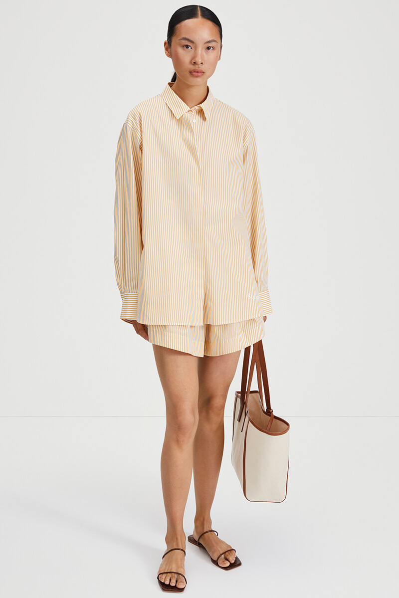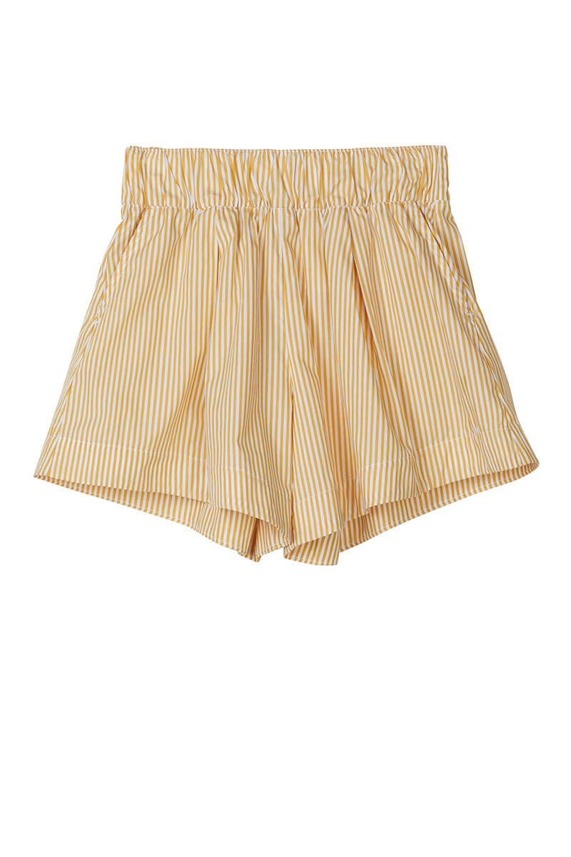 Yellow striped shorts in organic cotton that combine comfort with style. Airy, soft and with a relaxed fit for an effortless summer look. Perfect to wear solo or with the matching shirt for a thoughtful, yet relaxed outfit.Flared cotton shorts with a relaxed fit, side pockets, elastic waistband and pleats at the front from Stylein.