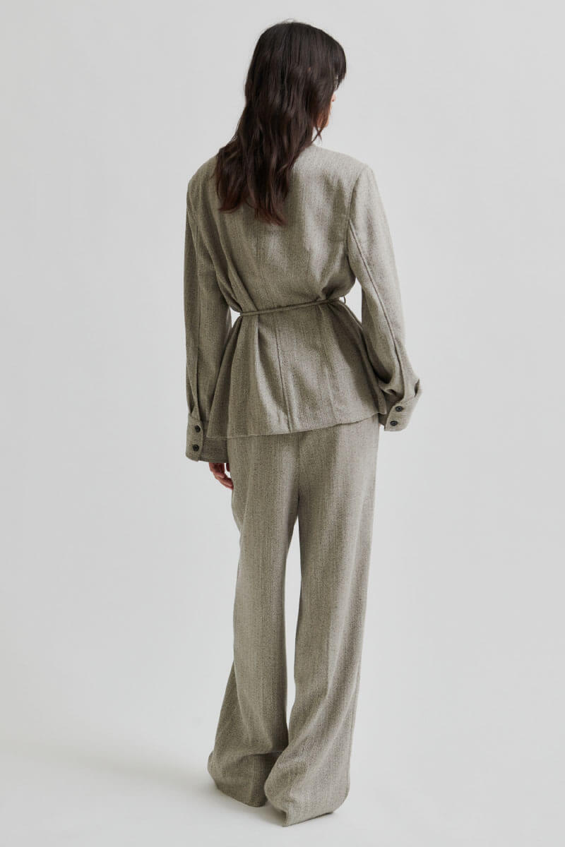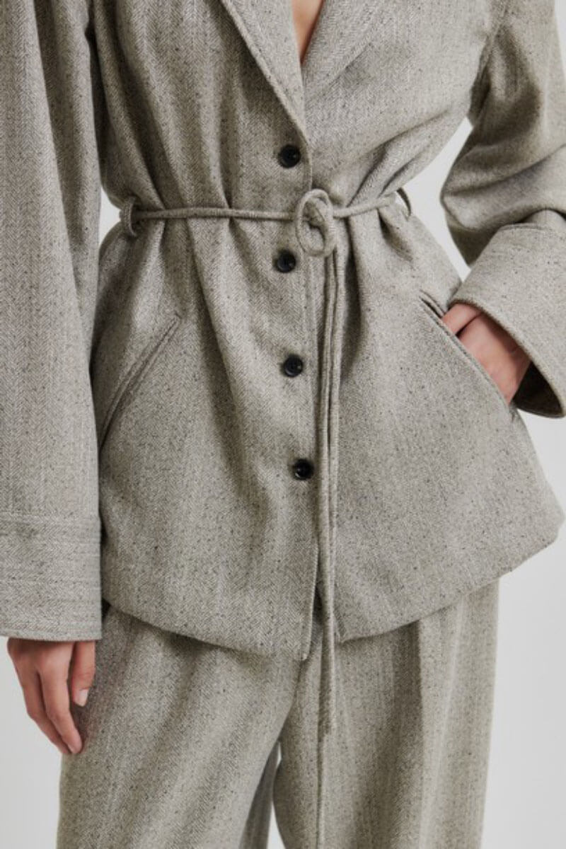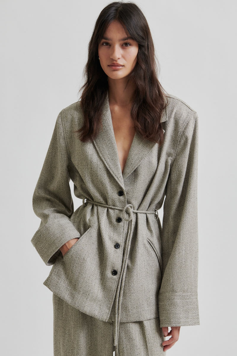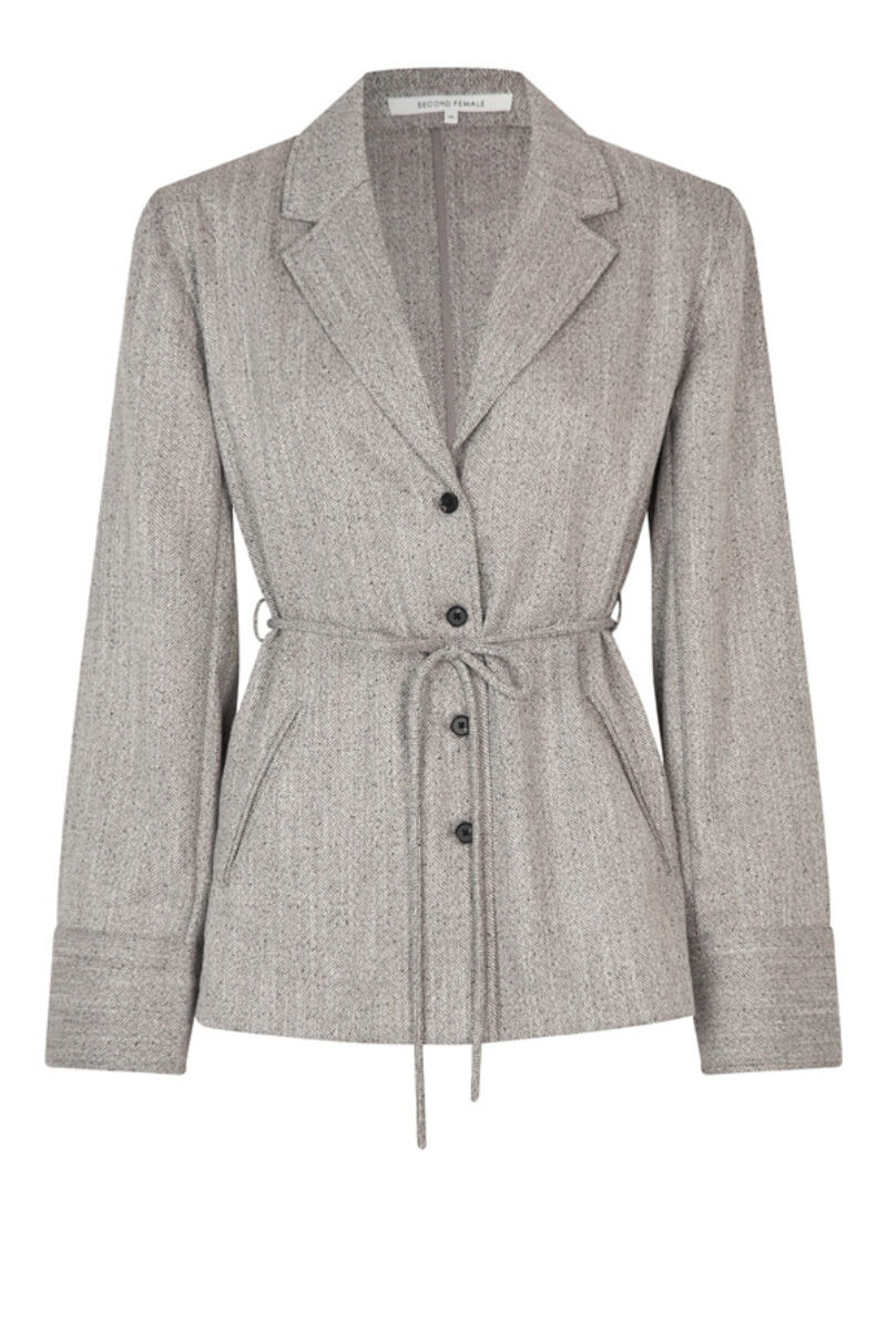 The blazer with a tie belt that adds structure without feeling strict. Wear with wide suit trousers or over a soft knit dress. A timeless, feminine silhouette and texture in grey melange. Refined and relaxed at the same time.Soft blazer in a viscose blend with a relaxed fit, side pockets, button closure at the front and matching belt at the waist from Second Female.
