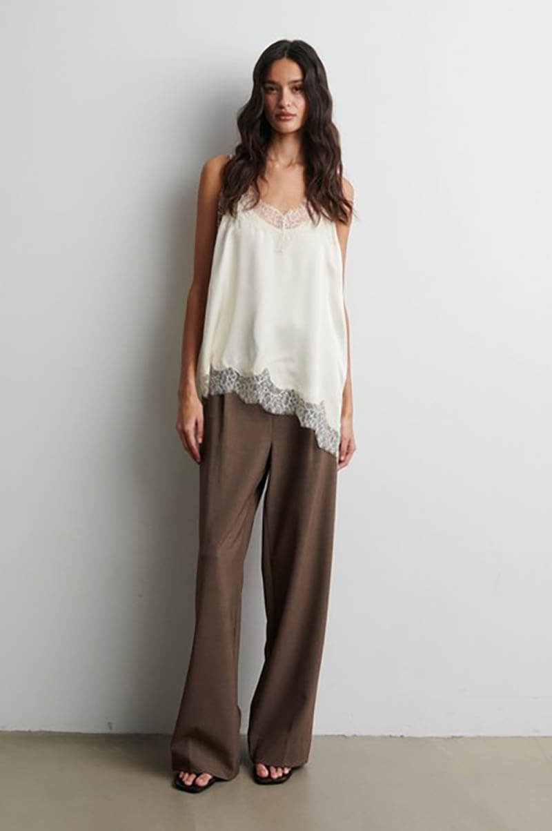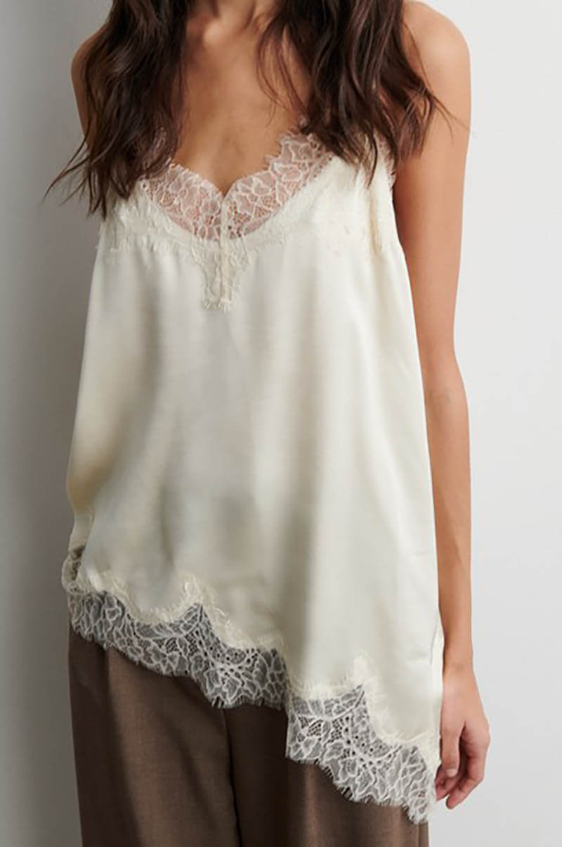 An elegant top with an asymmetrical hemline that creates a modern silhouette with a romantic touch. The top is made from a soft viscose blend that drapes beautifully against the body and is complemented by thin shoulder straps for a light and feminine look. Perfect to wear under a knitted sweater with either a skirt or trousers.