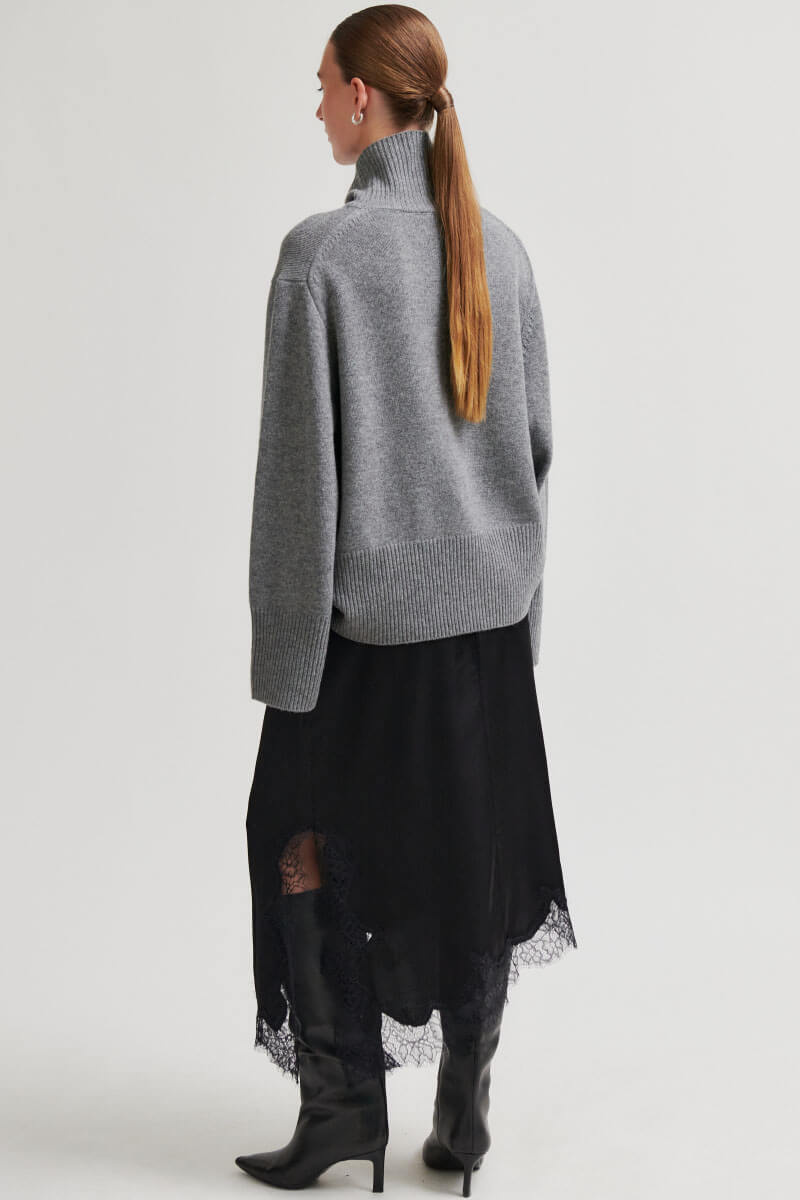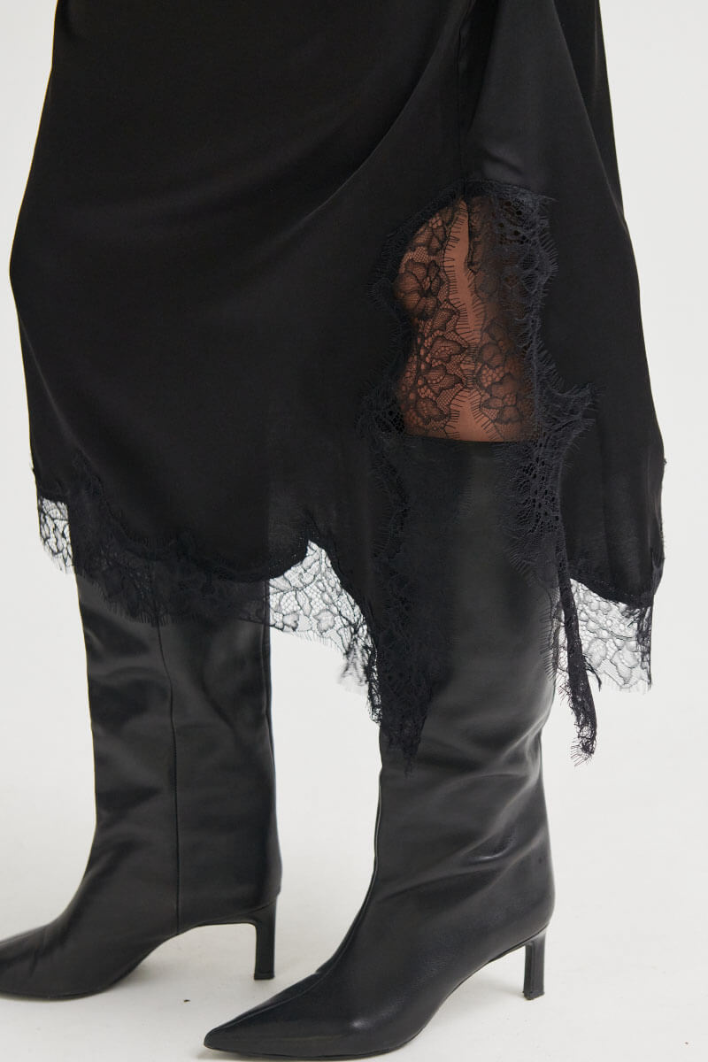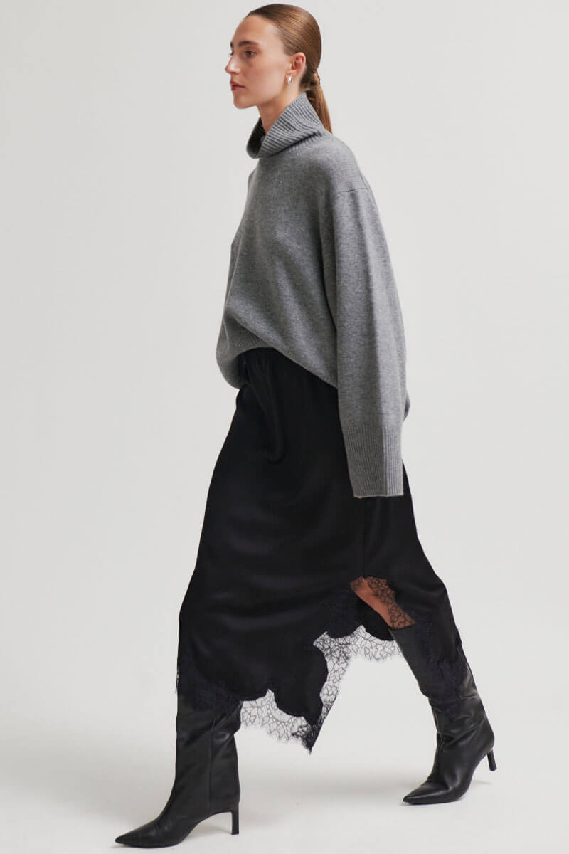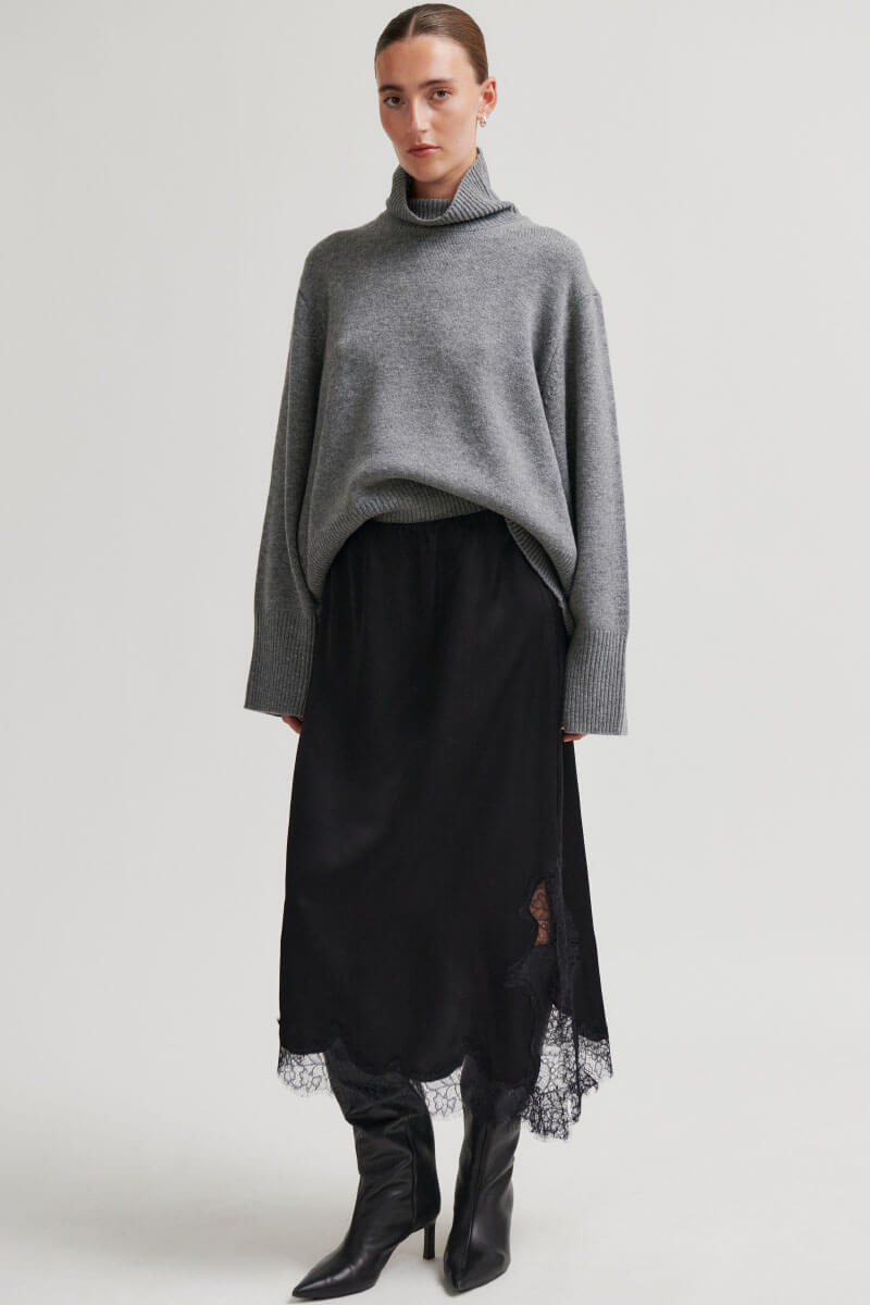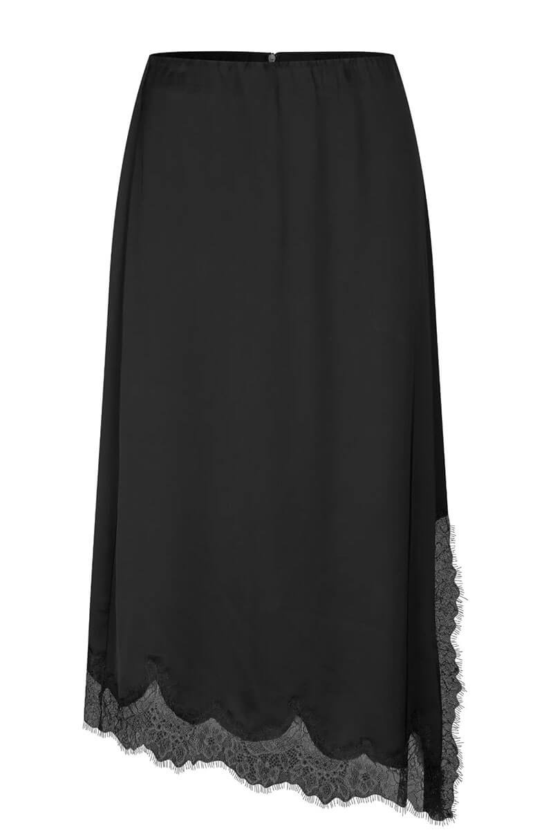 An elegant midi skirt with an asymmetrical hem and lace trim that creates a romantic yet modern silhouette. The skirt is made from a soft viscose blend that drapes beautifully and moves effortlessly with the body. The perfect combination of simplicity and luxury. Wear it with a knitted sweater or the matching top.