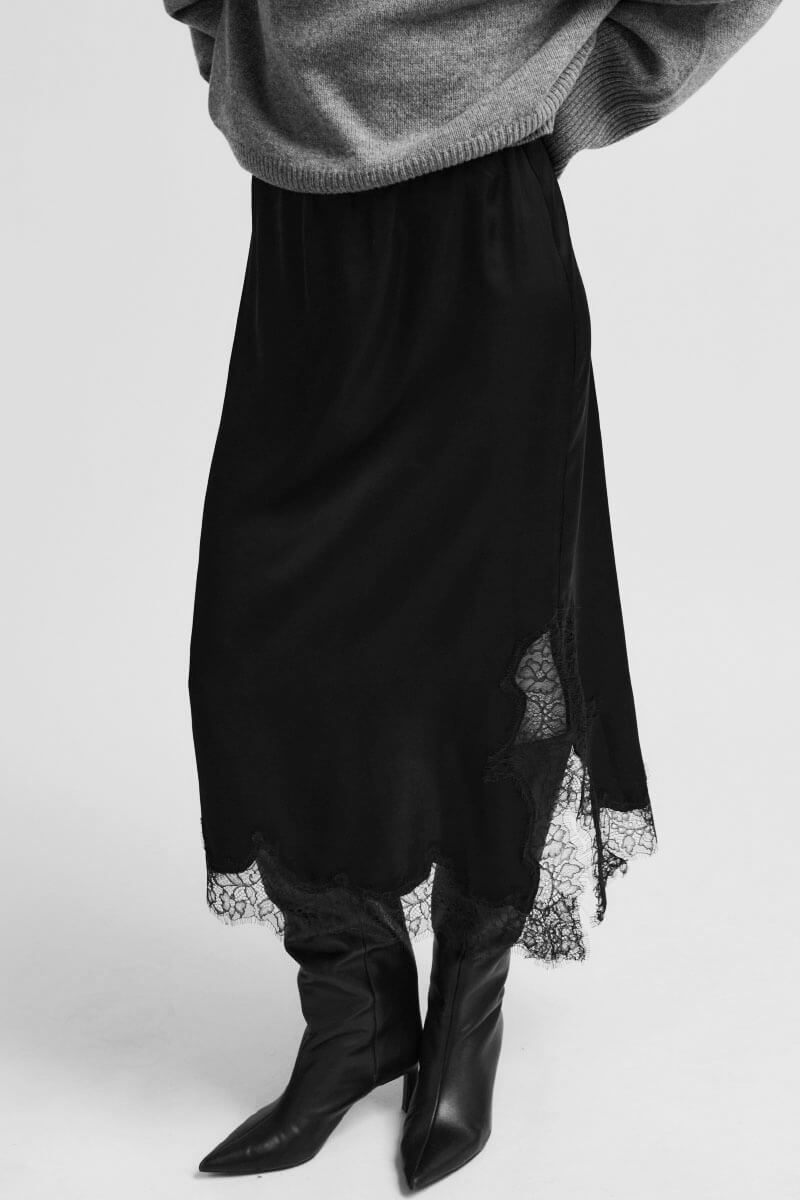 An elegant midi skirt with an asymmetrical hem and lace trim that creates a romantic yet modern silhouette. The skirt is made from a soft viscose blend that drapes beautifully and moves effortlessly with the body. The perfect combination of simplicity and luxury. Wear it with a knitted sweater or the matching top.
