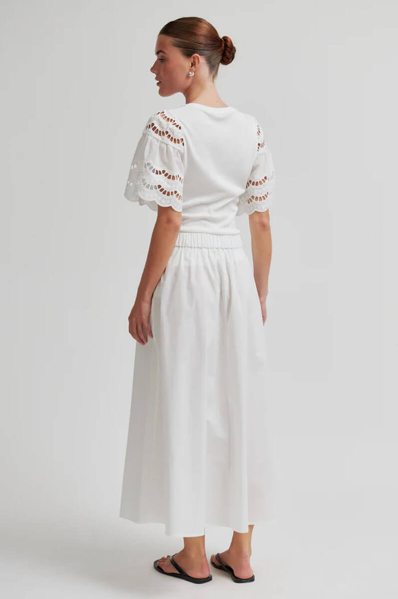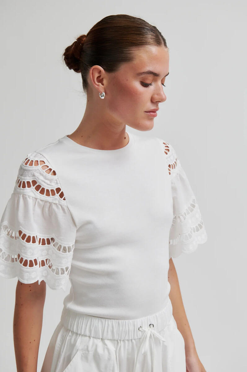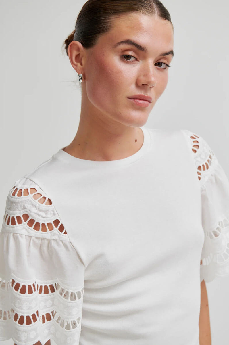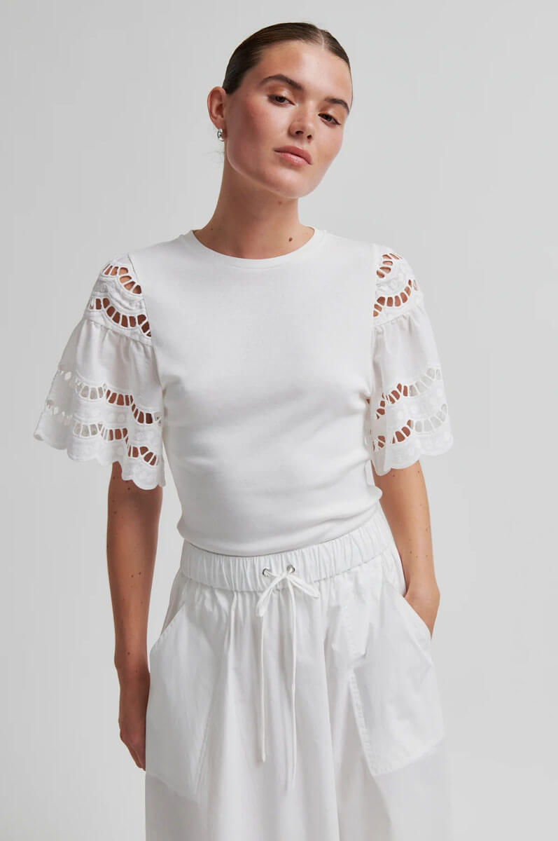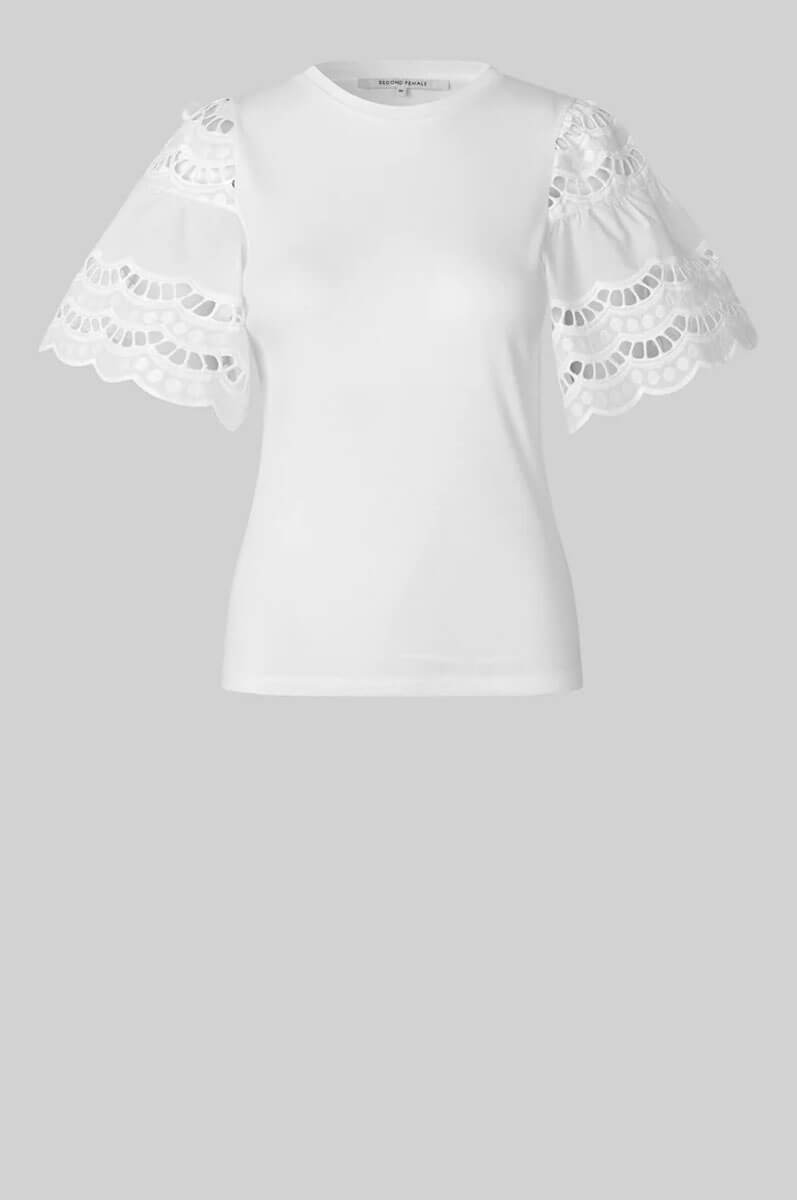 Second Female tee with lace sleeves.The t-shirt is made in soft, stretchy cotton-modal blend with flared lace sleeves. Round neck and twin needle stitching at bottom hem.