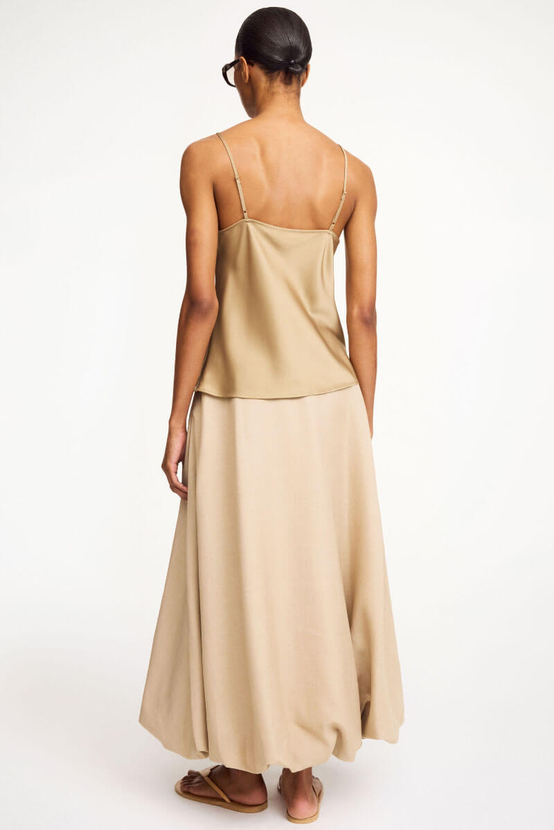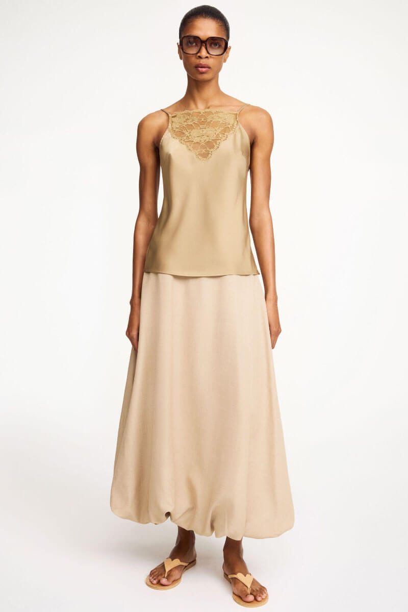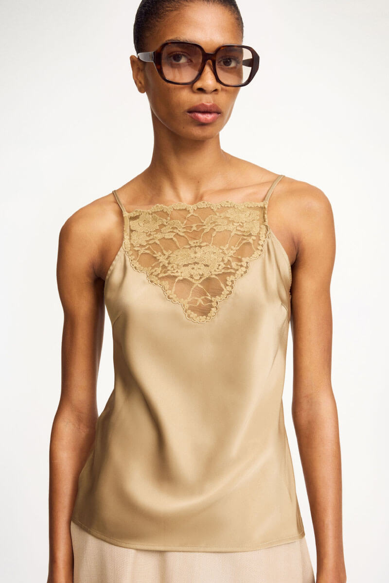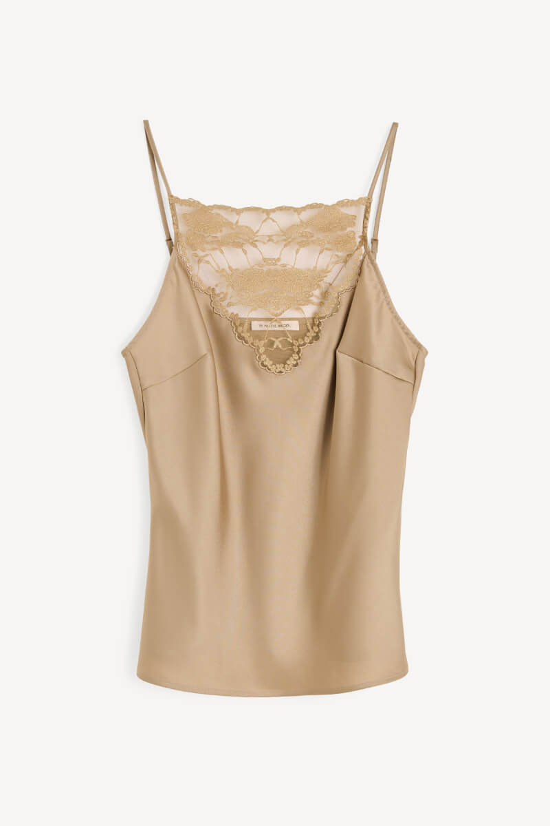A lace-edged tank top in soft beige with a shiny finish and narrow shoulder straps – where tone-on-tone elegance meets timeless simplicity. Perfect with denim, under a jacket or as a layering piece. A subtle statement piece that elevates any style with luxury.Soft tank top in a nice sheen with lace details at the front, adjustable shoulder straps and a regular fit from By Malene Birger.