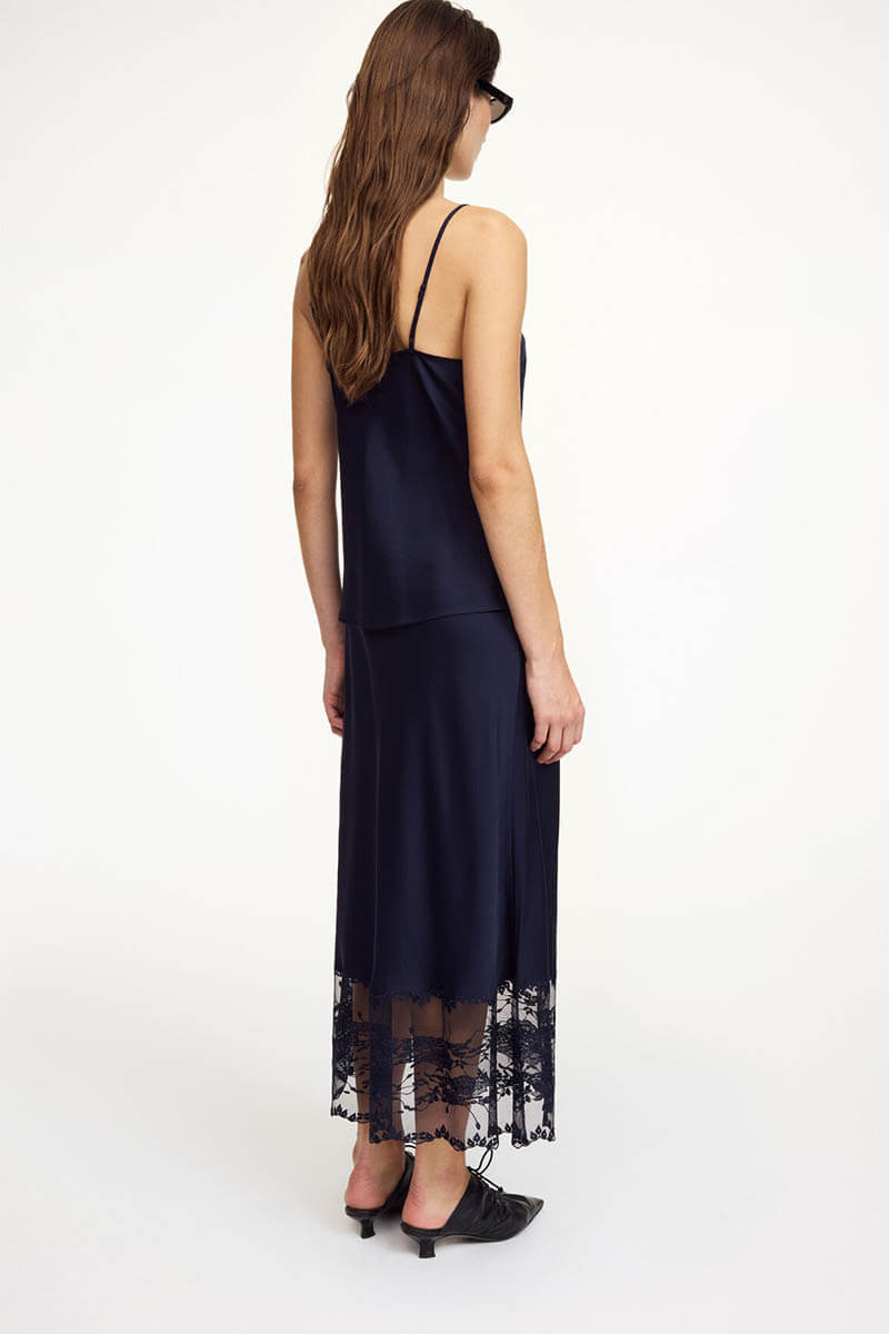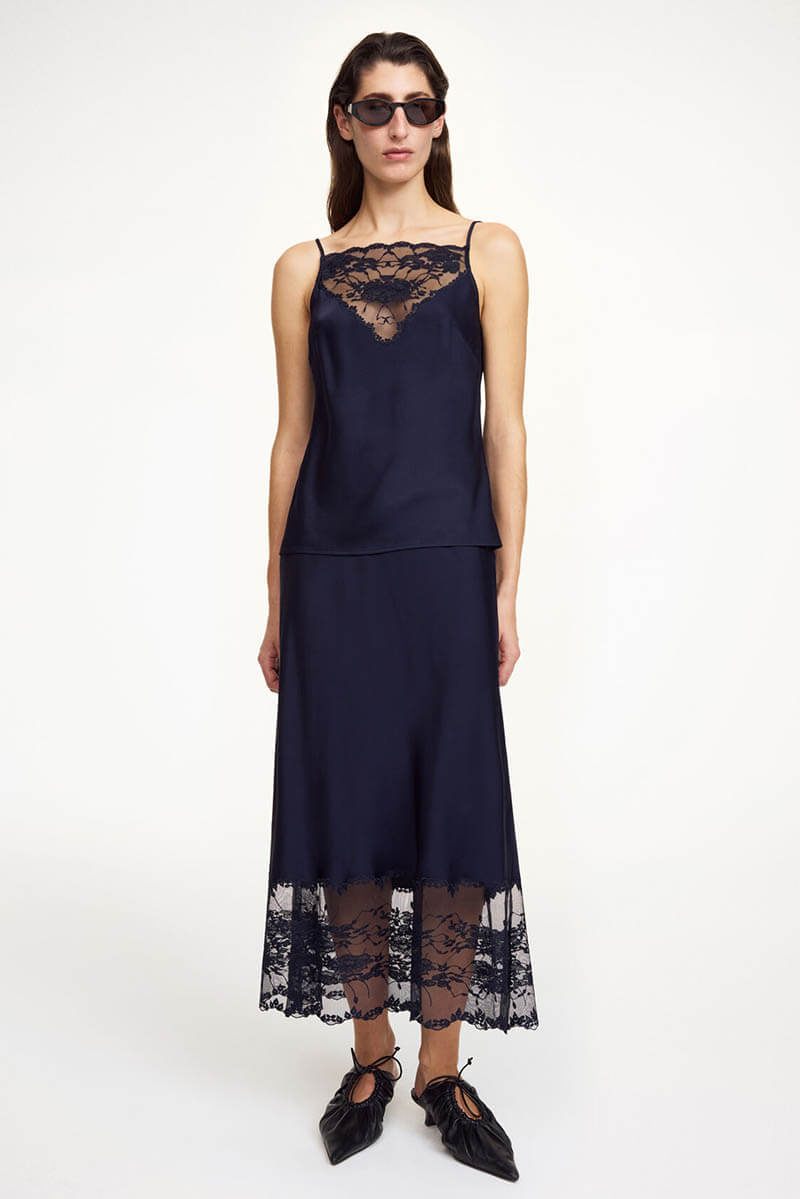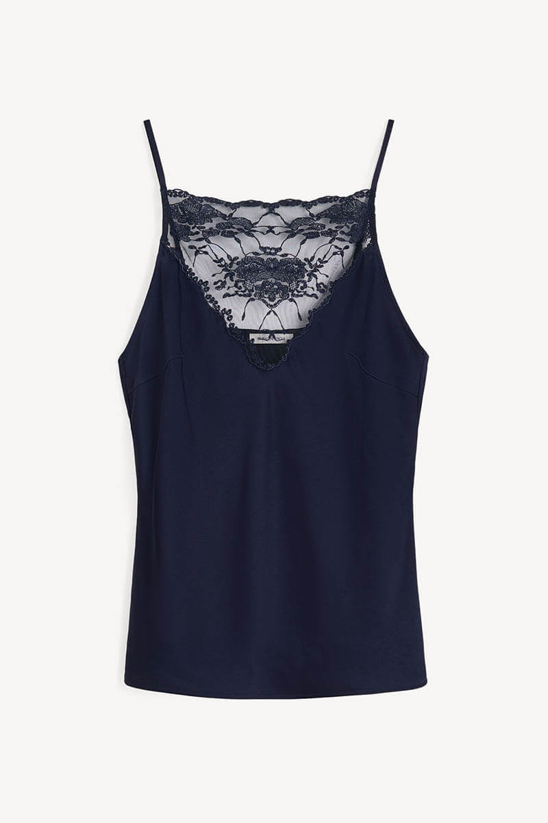 A lace-edged tank top in soft beige with a shiny finish and narrow shoulder straps – where tone-on-tone elegance meets timeless simplicity. Perfect with denim, under a jacket or as a layering piece. A subtle statement piece that elevates any style with luxury.Soft tank top in a nice sheen with lace details at the front, adjustable shoulder straps and a regular fit from By Malene Birger.