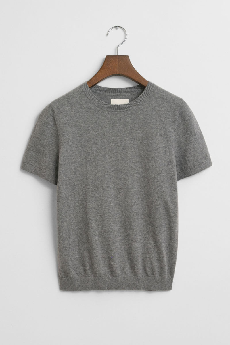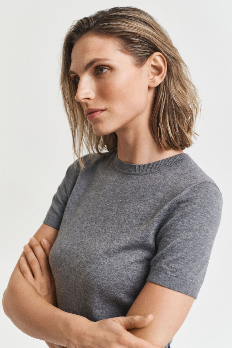 A knitted dream in grey, the slim silhouette of this cotton and cashmere top is a stylish wardrobe investment. With short sleeves and the perfect length, it elevates any look – from casual to dressed up.Thin knitted top in a soft cashmere blend with a round neckline. Slim fit, short sleeves and ribbed edges from Gant.