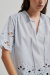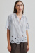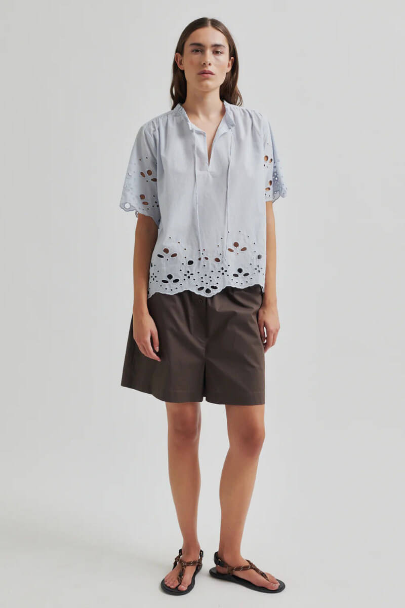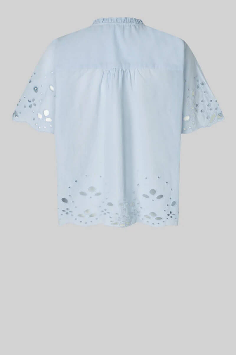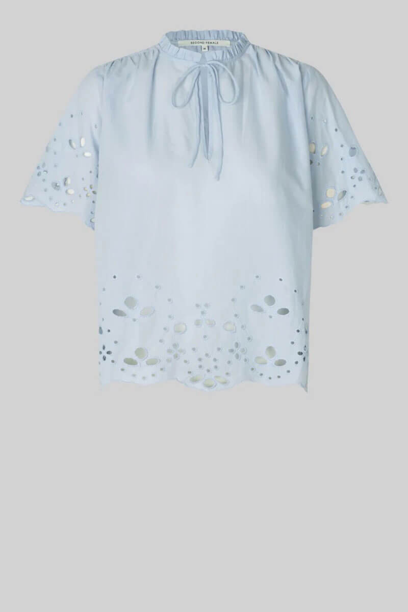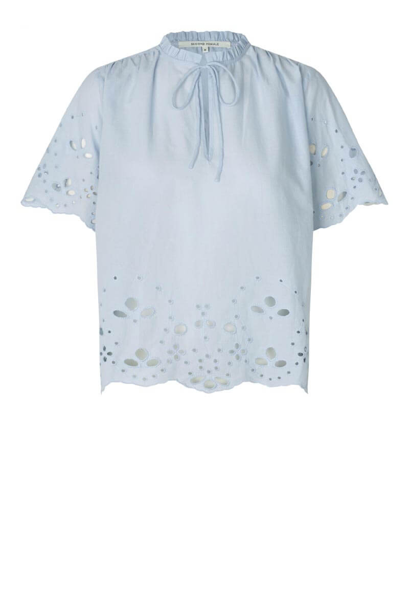 This light blue cotton blouse with embroidered details and romantic tying. The perfect blouse for both jeans and skirts - a wardrobe favorite that elevates every spring and summer look with simple elegance.Thin and soft cotton top with a loose fit, short wide sleeves, high neckline with ties at the front from Second Female.