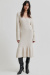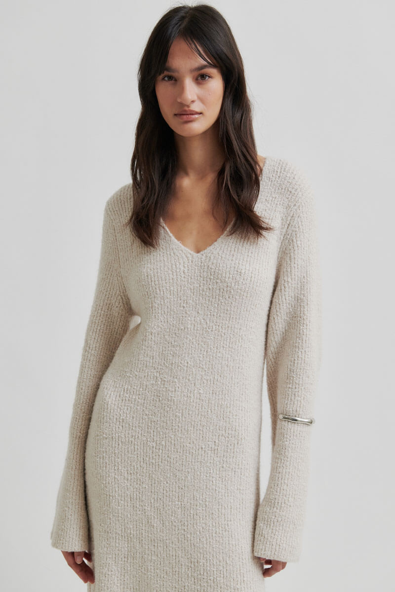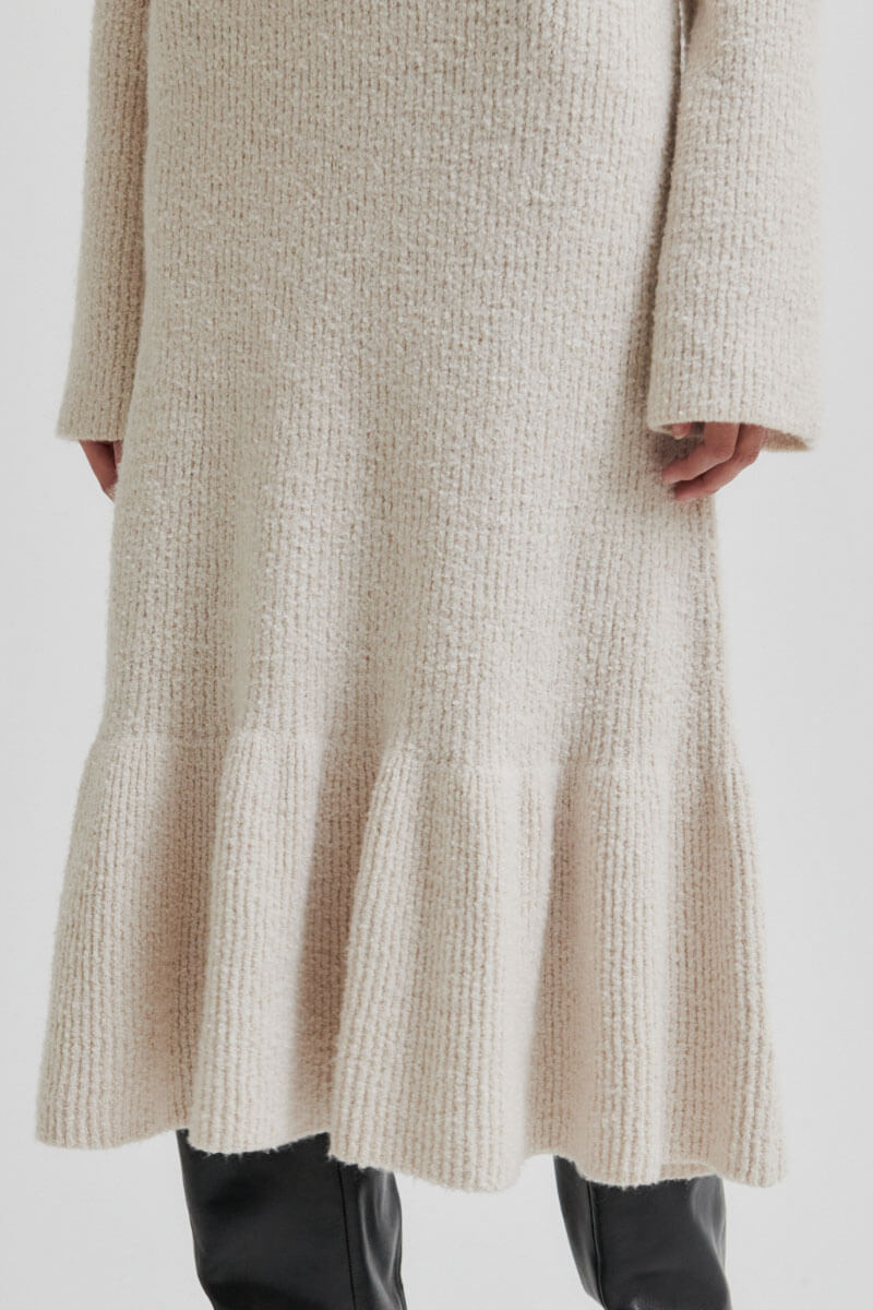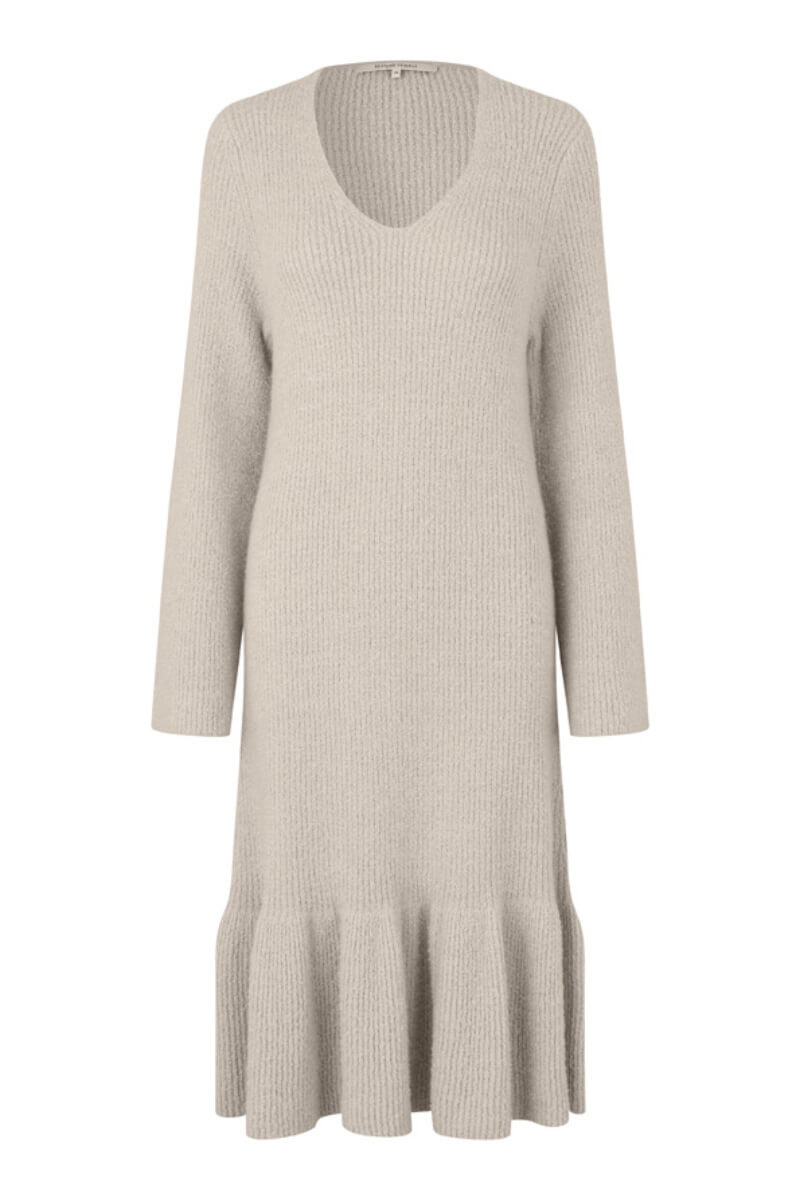 Beige stickad midiklänning som är lika mjuk som sofistikerad. Bär med läderstövlar och statementörhängen till middag, eller med sneakers och trenchcoat till vardag.Knitted dress in a cottonblend with v-neckline, relaxed fit, frill at the bottom and long sleeves from Second Female.