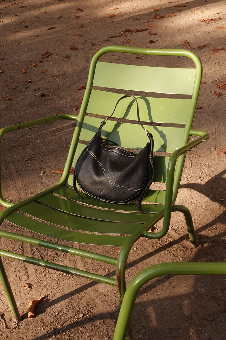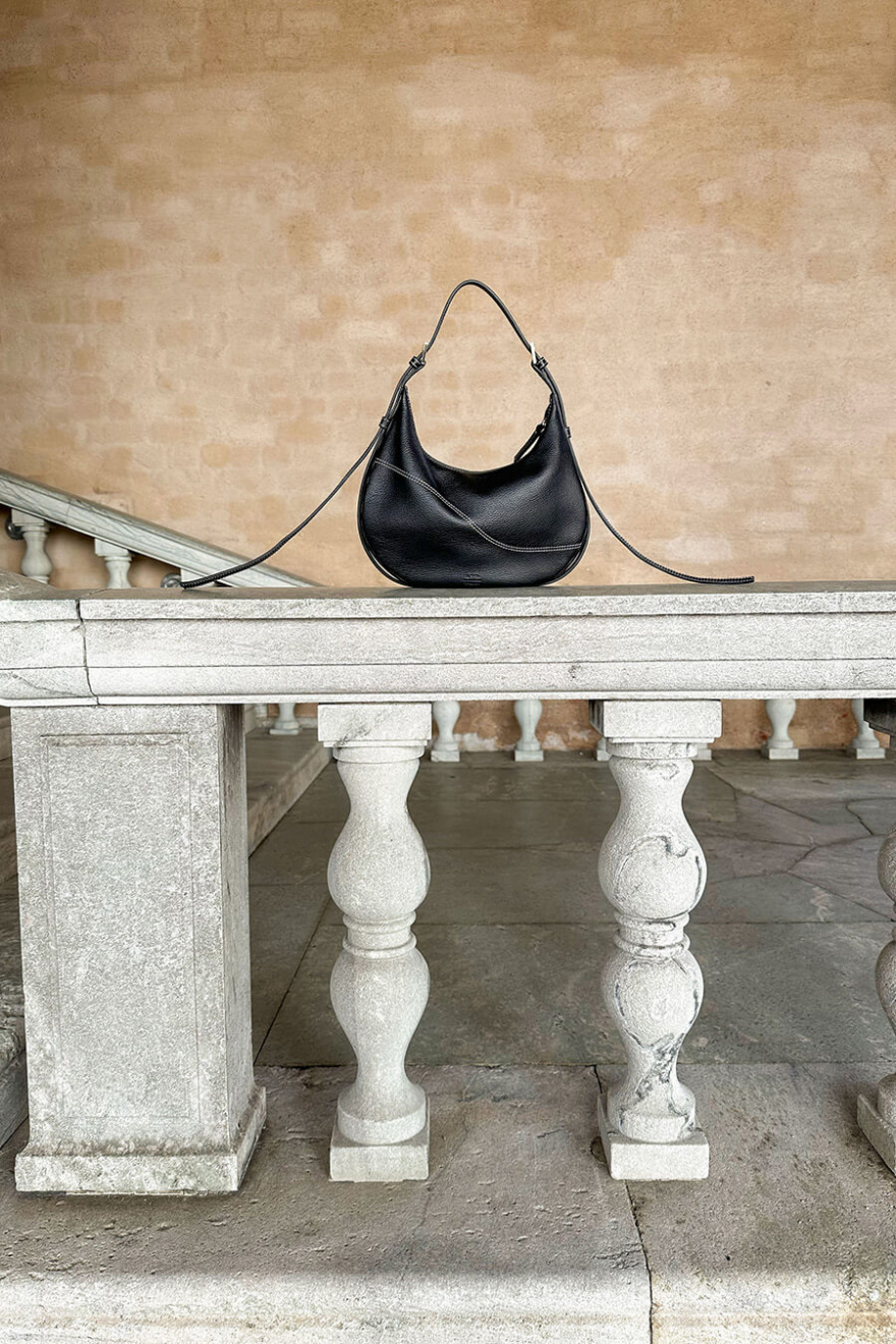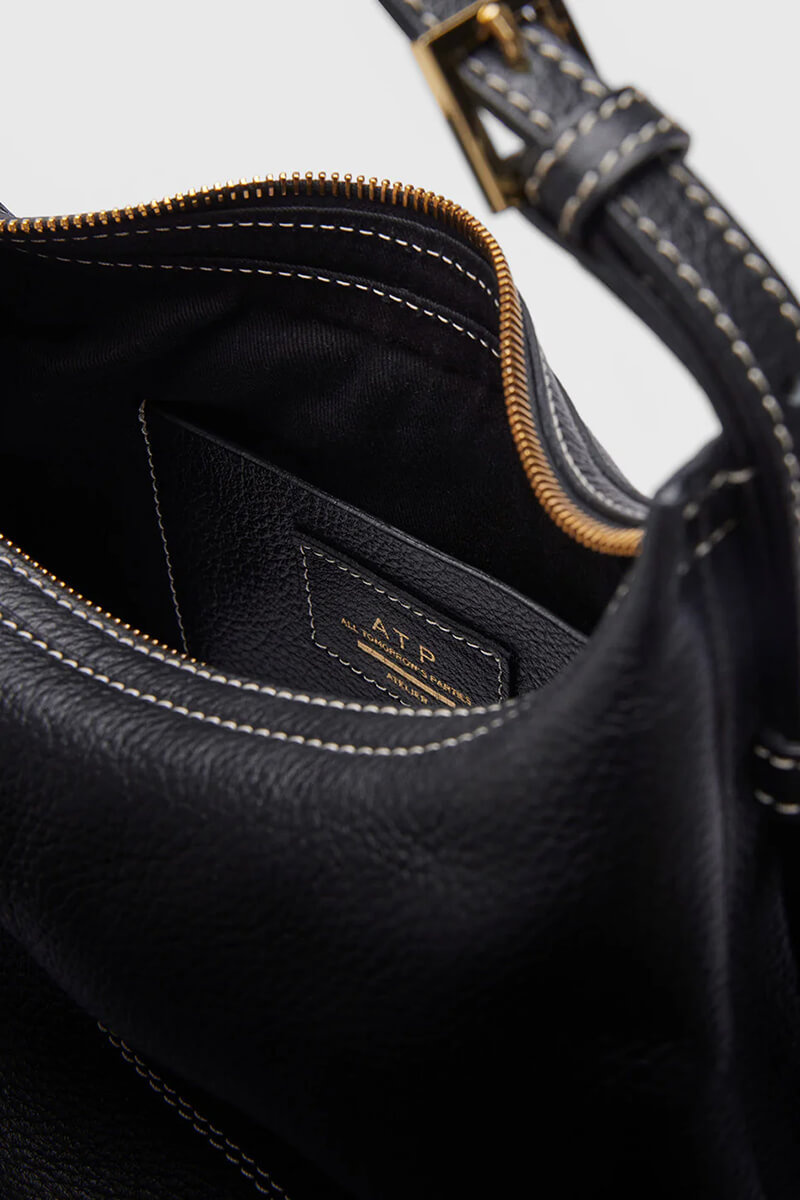 A perfect everyday bag in a small hobo model in leather with adjustable strap, closes with a zipper, one innerpocket, embossed logo, contrast colored seams and painted edges from ATP Atelier.