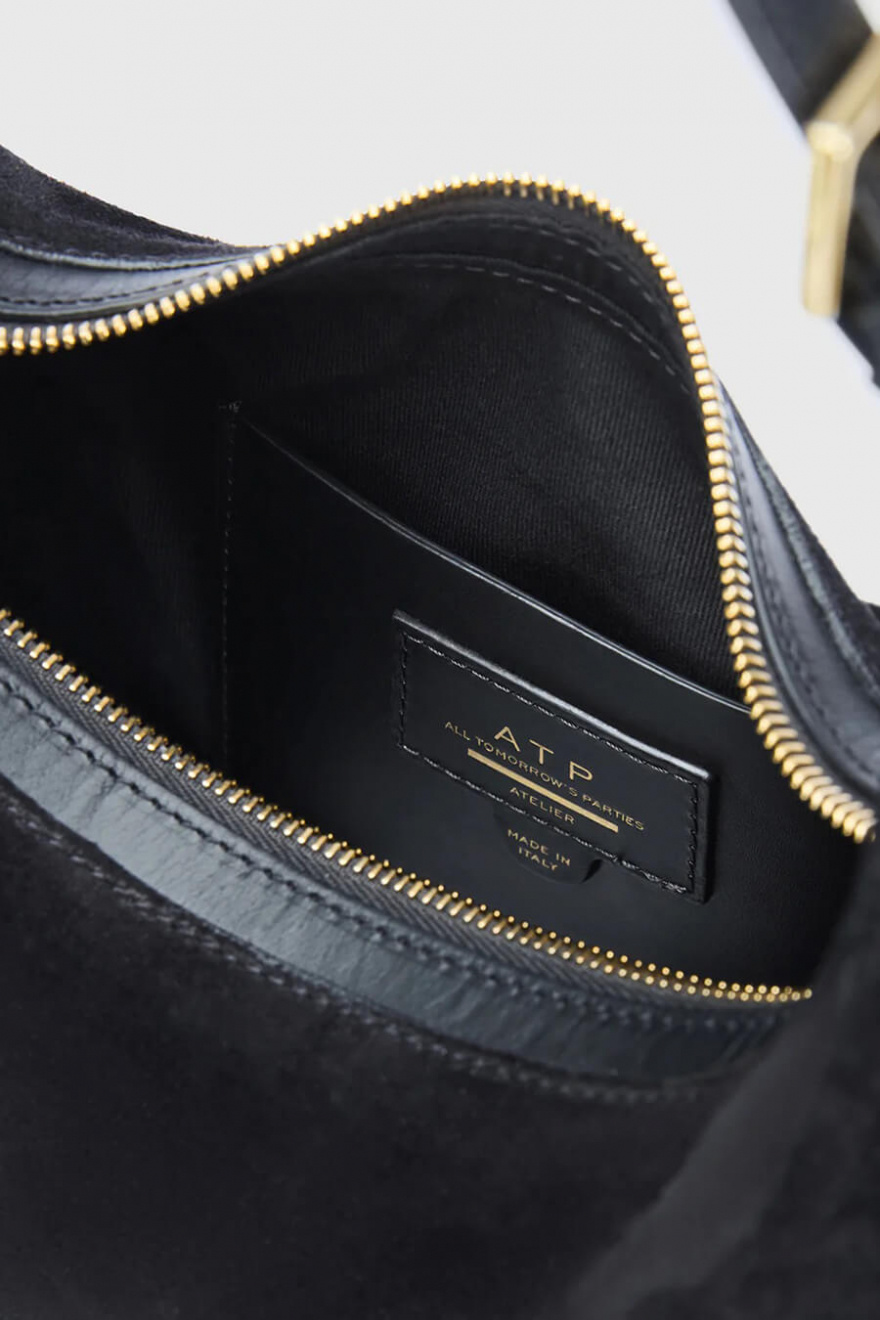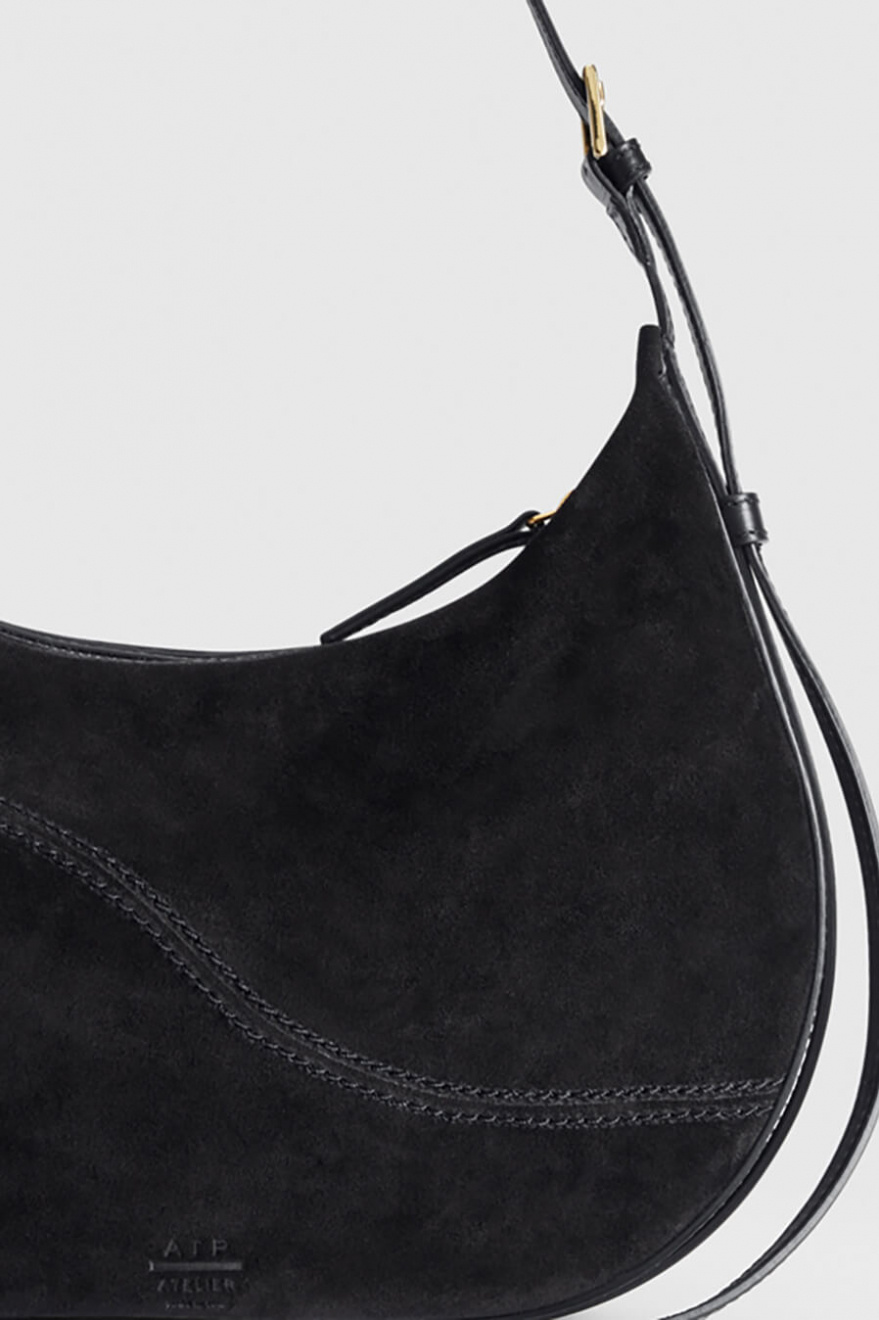 A perfect everyday bag in a small hobo model in suede with adjustable strap, closes with a zipper, one innerpocket, embossed logo, leather details, contrast colored seams and painted edges from ATP Atelier.- Material: suede, calf leather, canvas lining