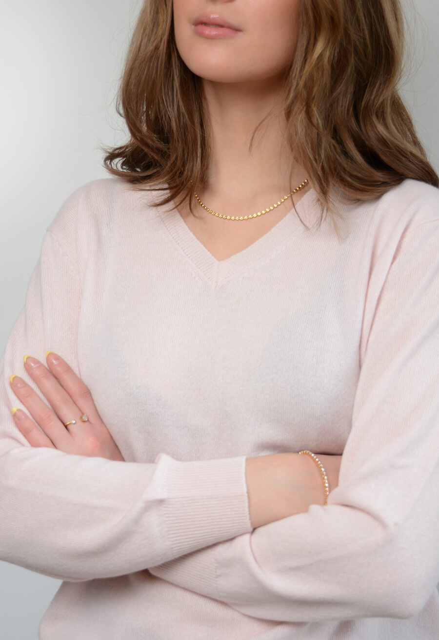 A luxurious cashmere sweater with v-neck and loose fit.Normal in size.