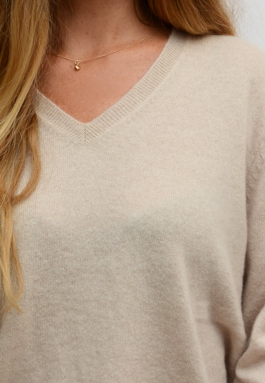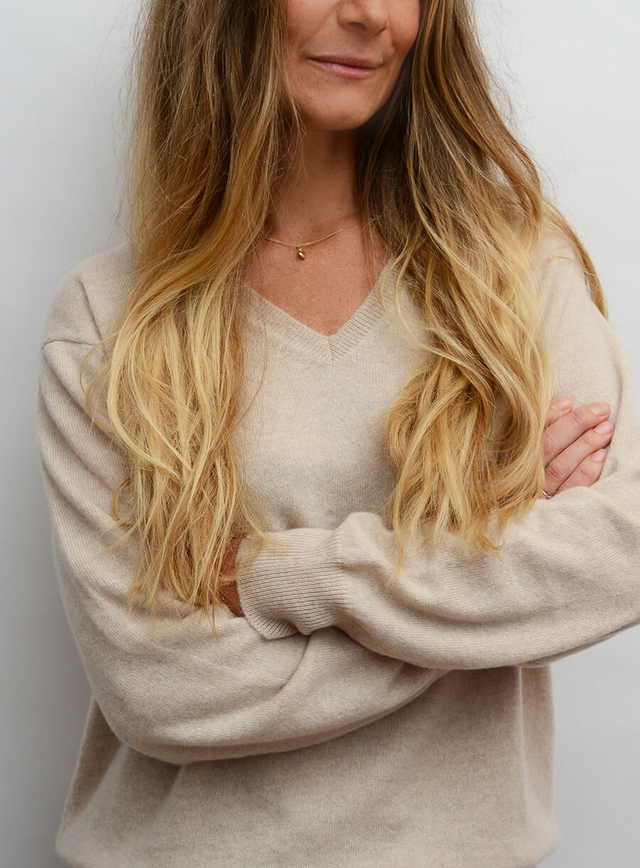 A luxurious cashmere sweater with v-neck and loose fit.Normal in size.