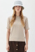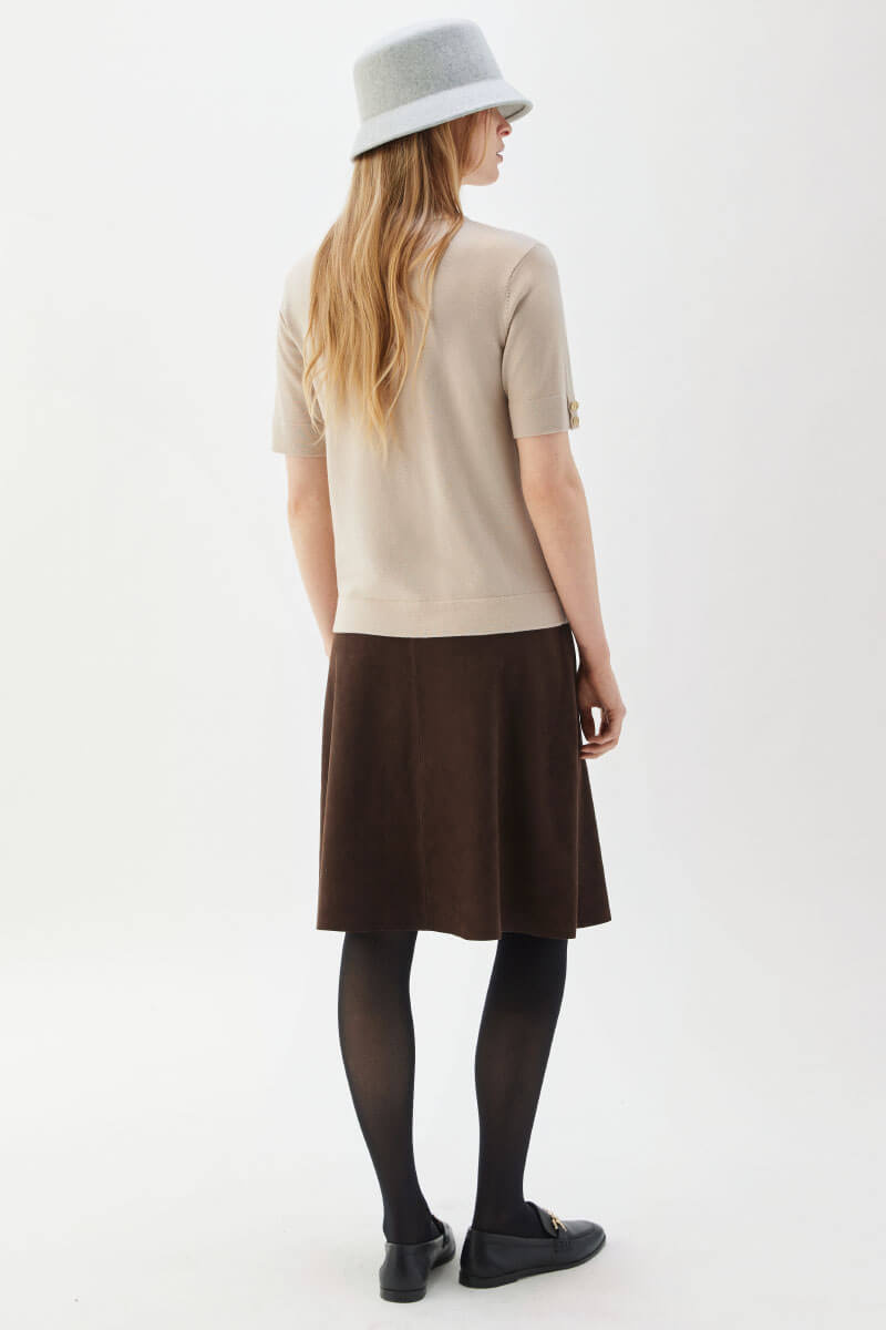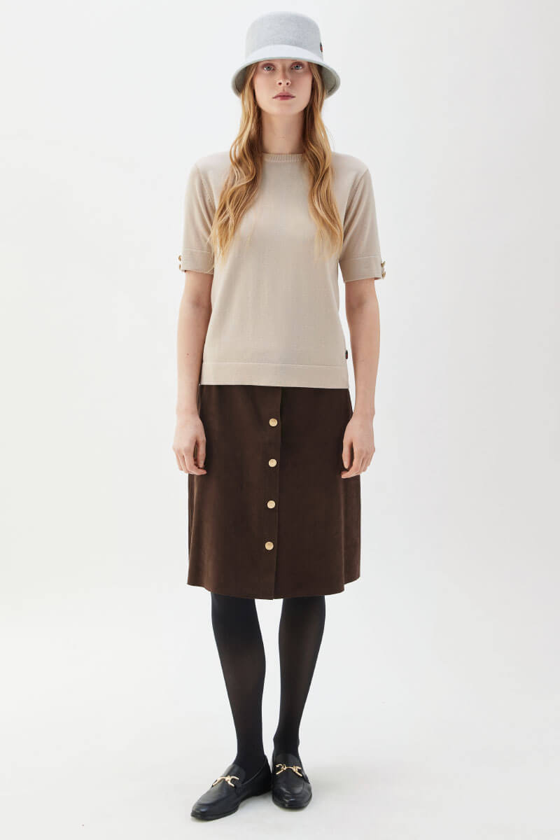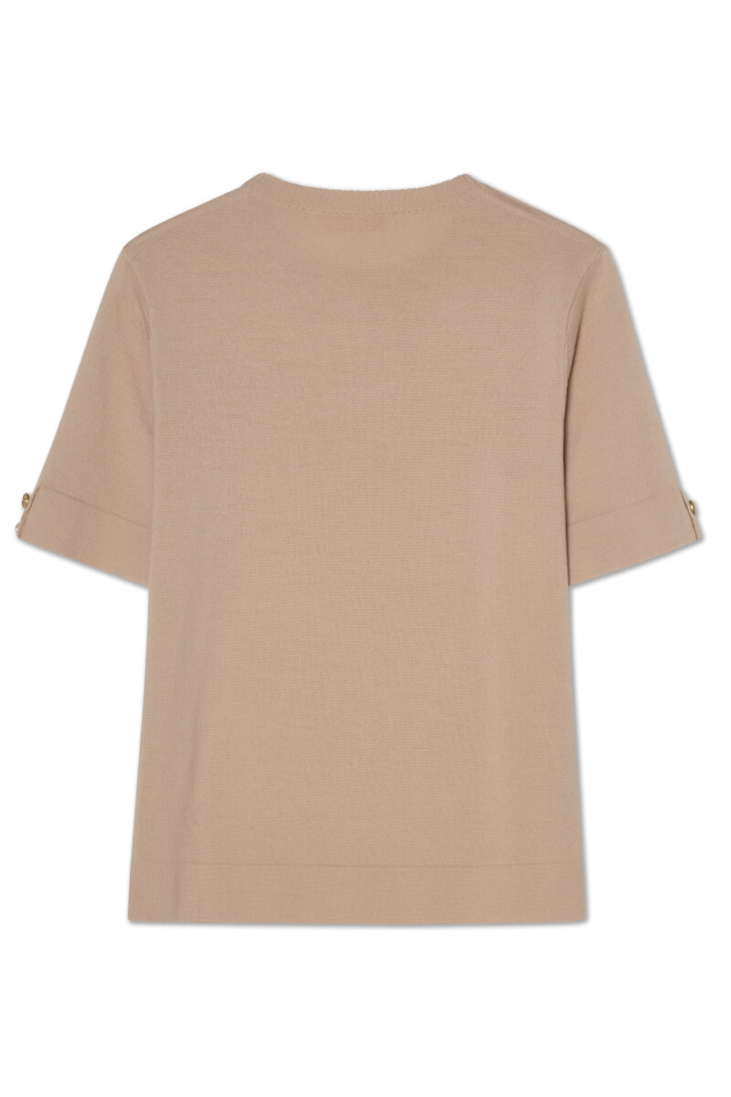Beige knitted top in soft merino wool with a round neck and short sleeves. Wear it tucked into tailored wool trousers, with a long coat and boots. Add a knitted scarf for a warm, sophisticated autumn look.Knitted top in soft wool with a round neckline, decorative buttons on the sleeves, ribbed edges and a regular fit from Busnel.