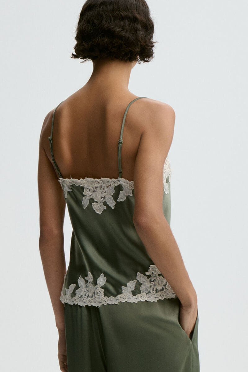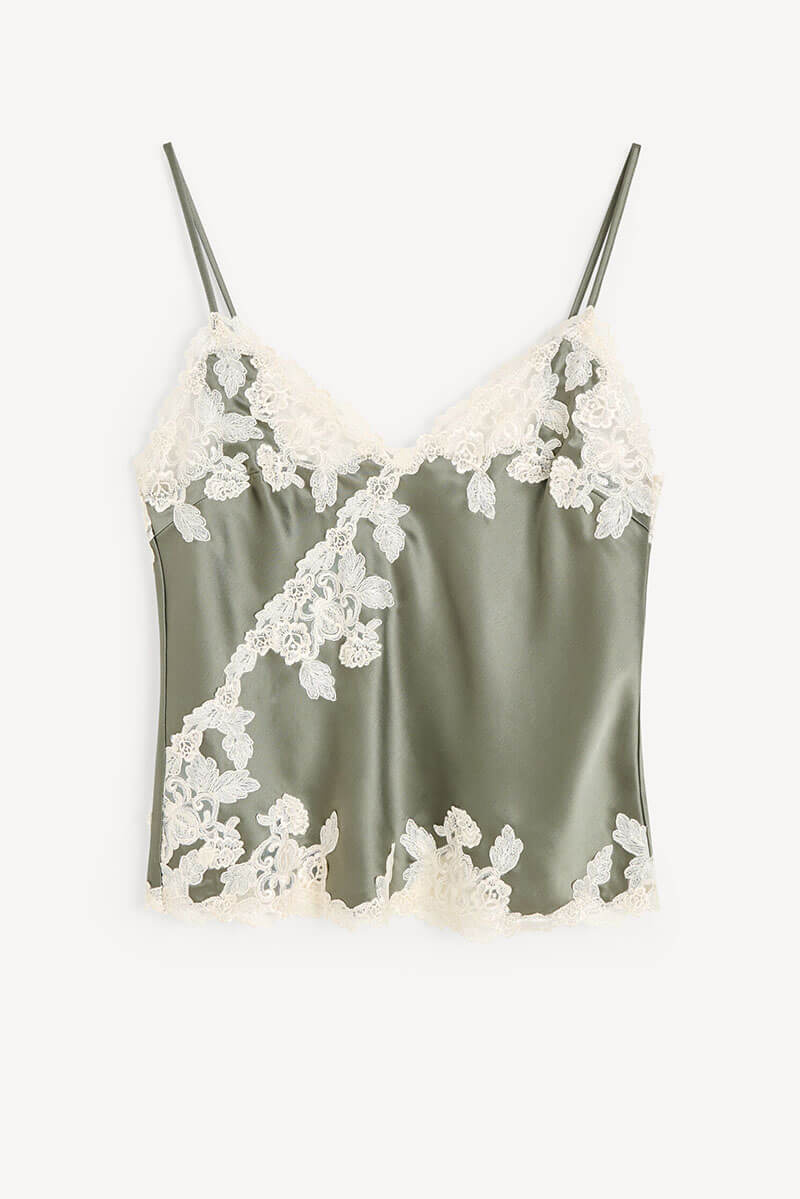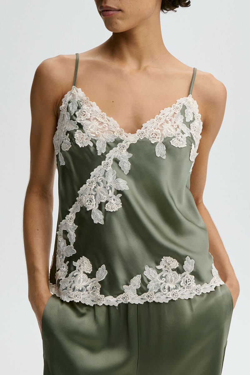 Crafted in lustrous satin, the design is elevated with vintage-inspired lace trims that highlight its feminine silhouette. A flattering V-neckline and delicate adjustable straps complete the look. Style it with the matching Erika skirt for the season’s soirées, or pair it with tailored trousers or denim for a more effortless feel.