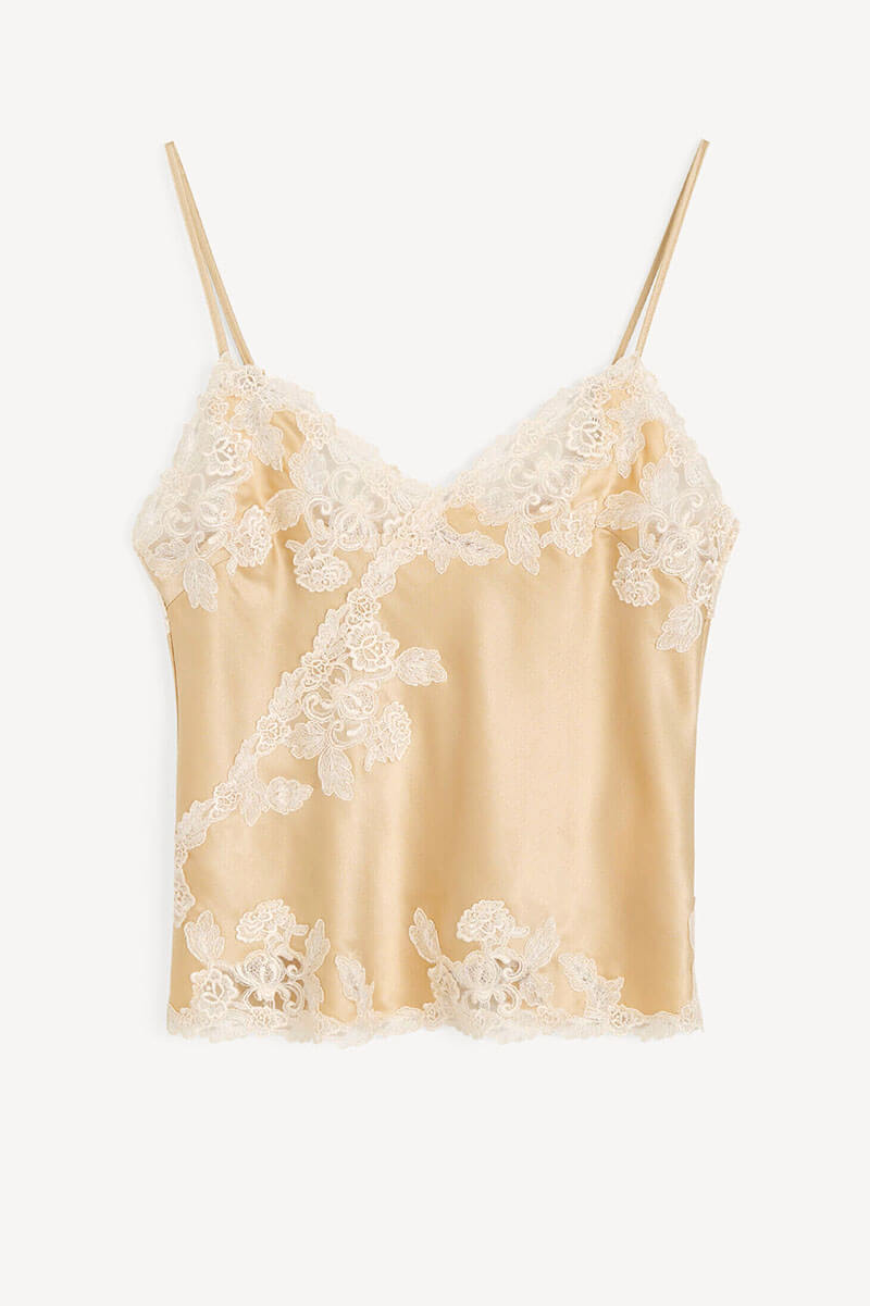 Crafted in lustrous satin, the design is elevated with vintage-inspired lace trims that highlight its feminine silhouette. A flattering V-neckline and delicate adjustable straps complete the look. Style it with the matching Erika skirt for the season’s soirées, or pair it with tailored trousers or denim for a more effortless feel.