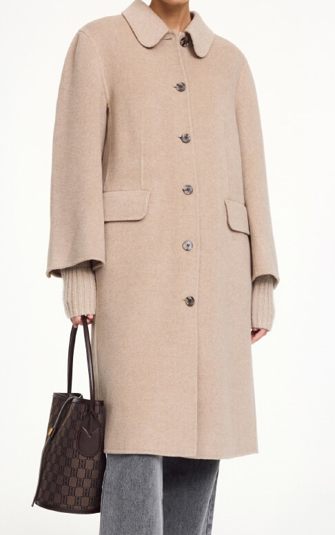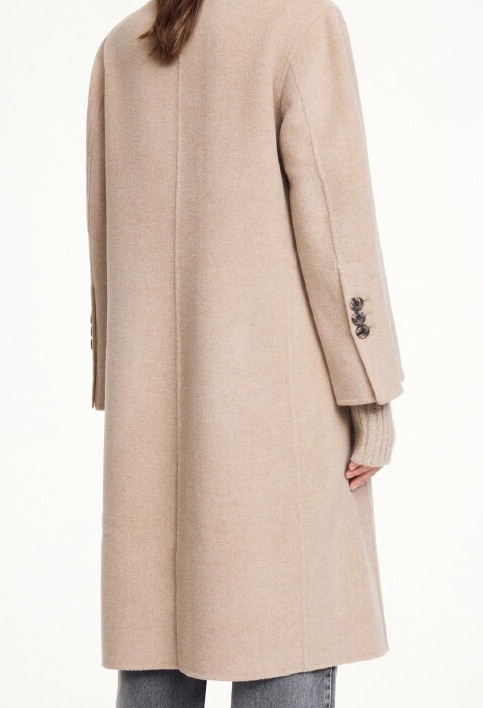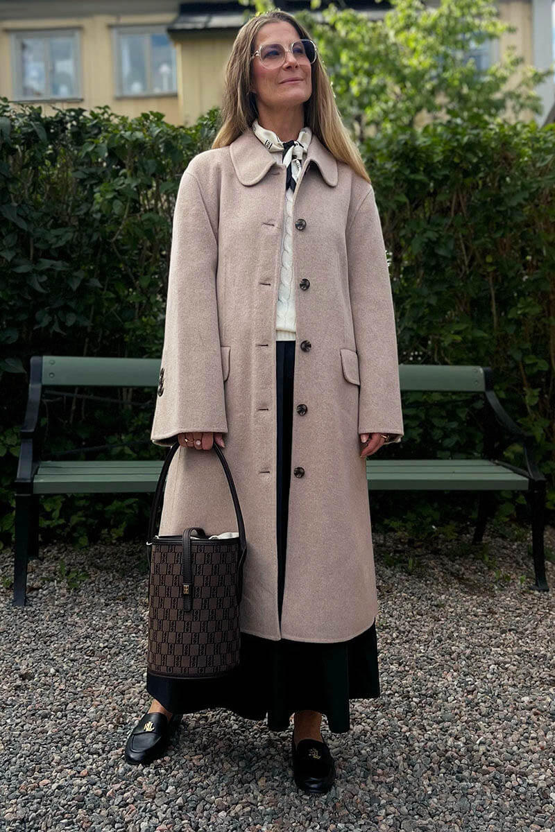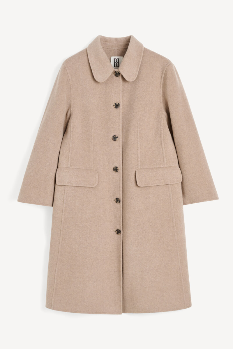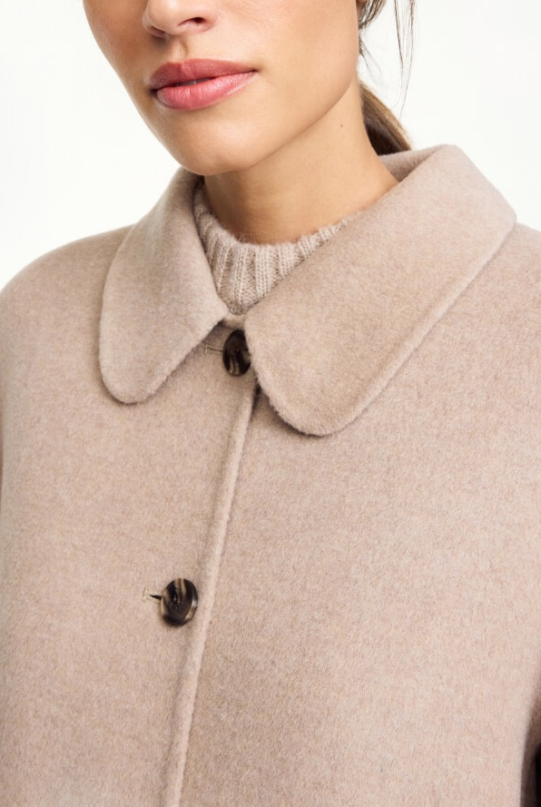 Beige wool coat in double faced quality that transforms any outfit into something casually elegant. Style it over a knitted dress and knee-high boots, or let it hang open over denim and sneakers. A classic outer coat with a modern, relaxed fit.Coat in soft wool that is double faced, unlined, closes with buttons at the front, front pockets, rounded collar and loose fit from By Malene Birger.