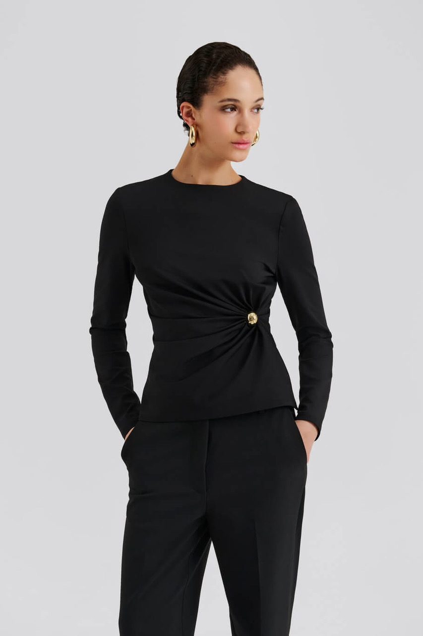 Jersey top with long sleeves, draped waist, and gold-toned detail.